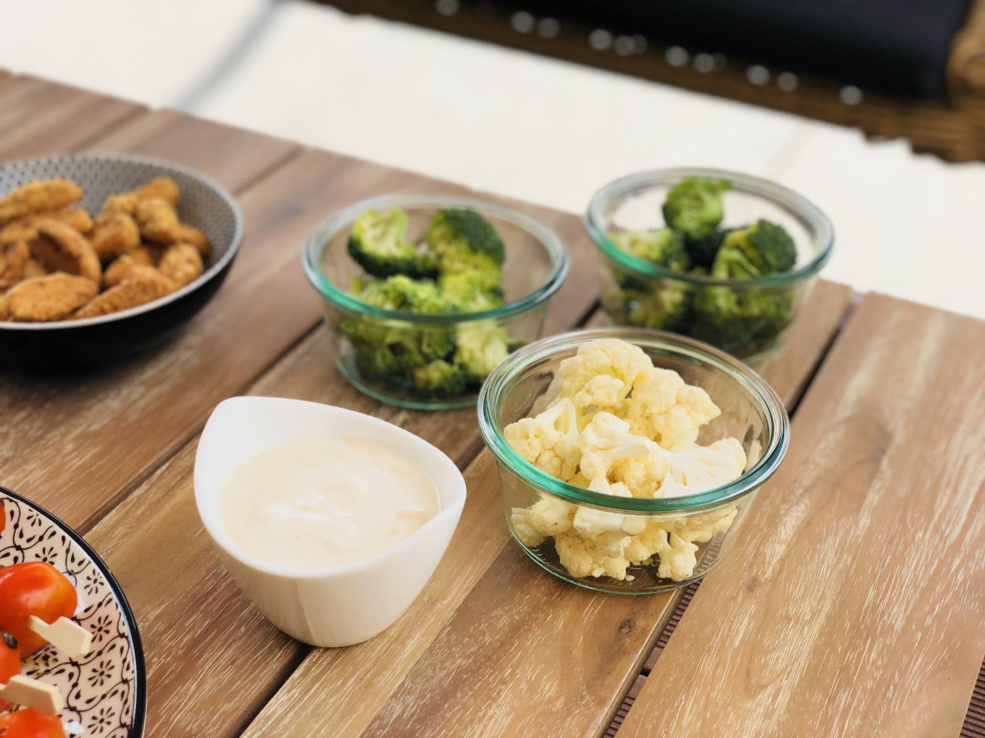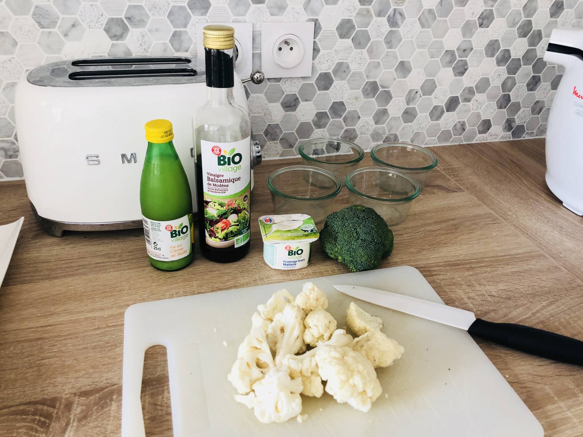 Un apéro healthy sans petits légumes à ripper n’est pas un apéro healthy !! Couper les fleurettes de chou-fleur et de brocolis. Bien les laver. Pour le dip, mélanger un pot de fromage blanc avec un trait de jus de citron et de vinaigre balsamique. Plus rapide, on ne fait pas, et ça a du goût ! C’est la recette d’une copine et je la fais très souvent !