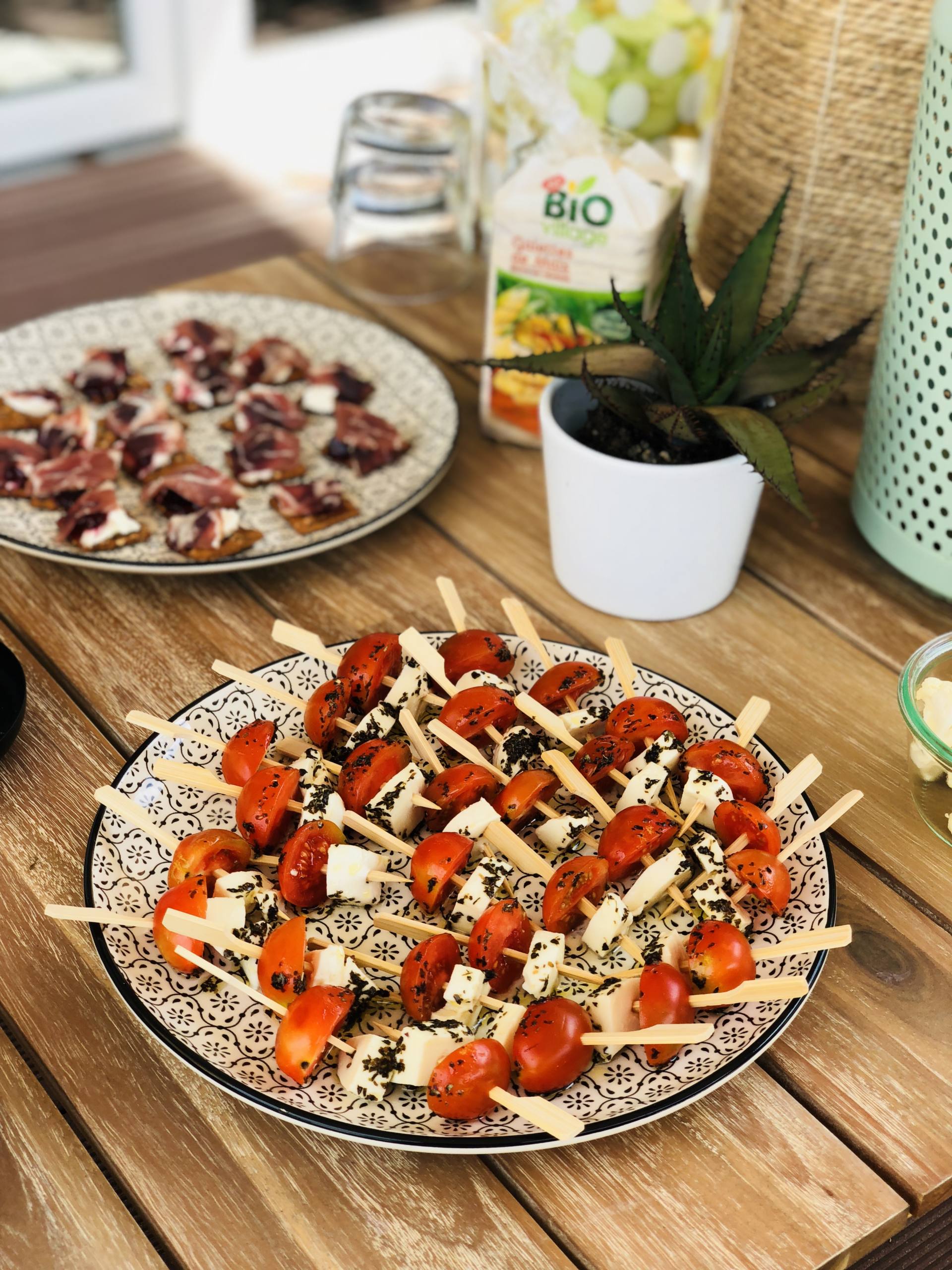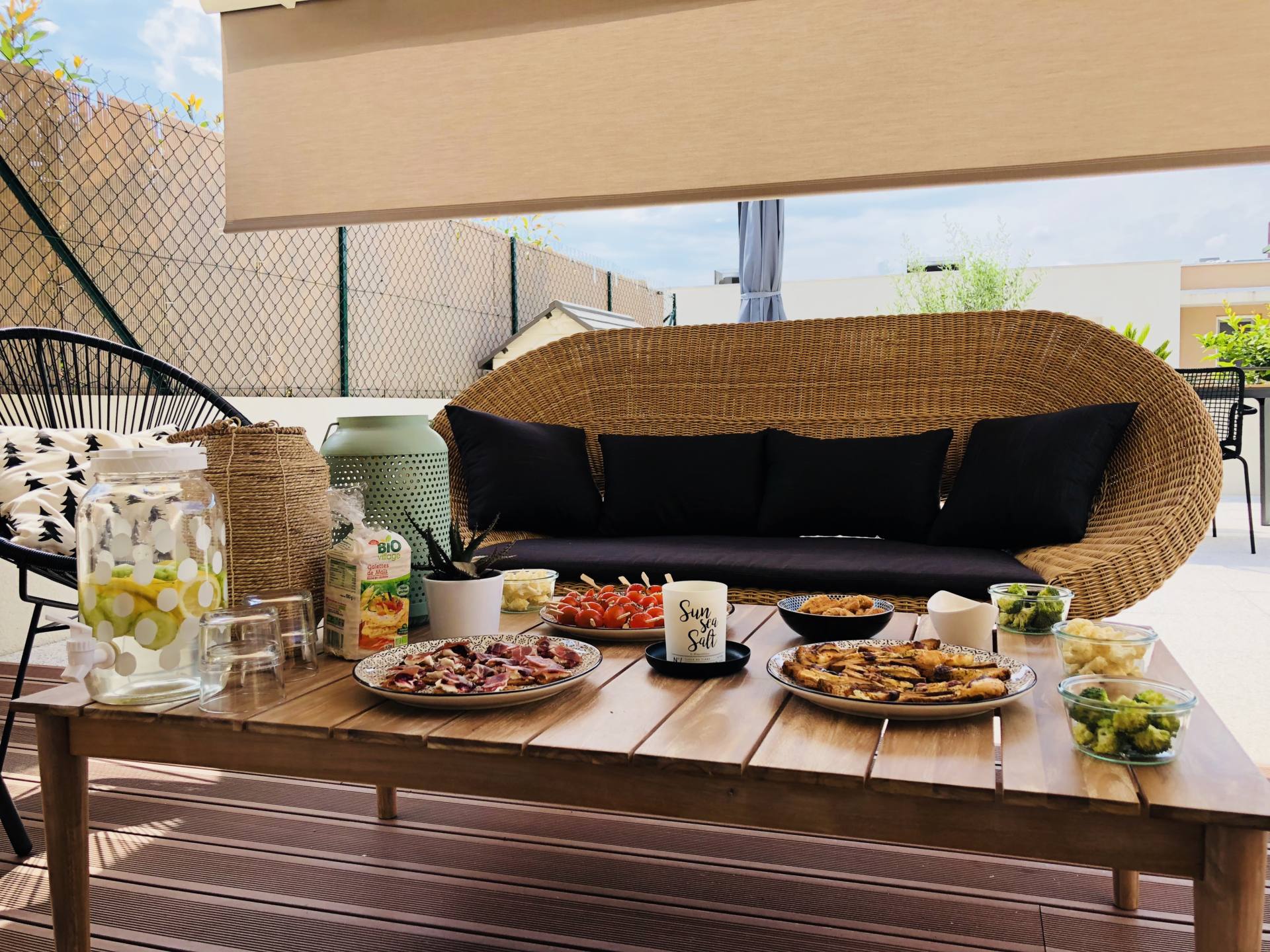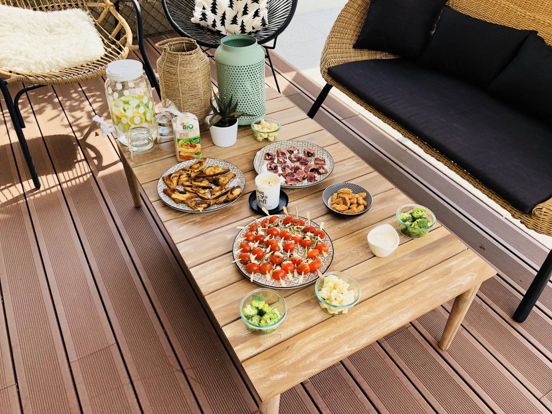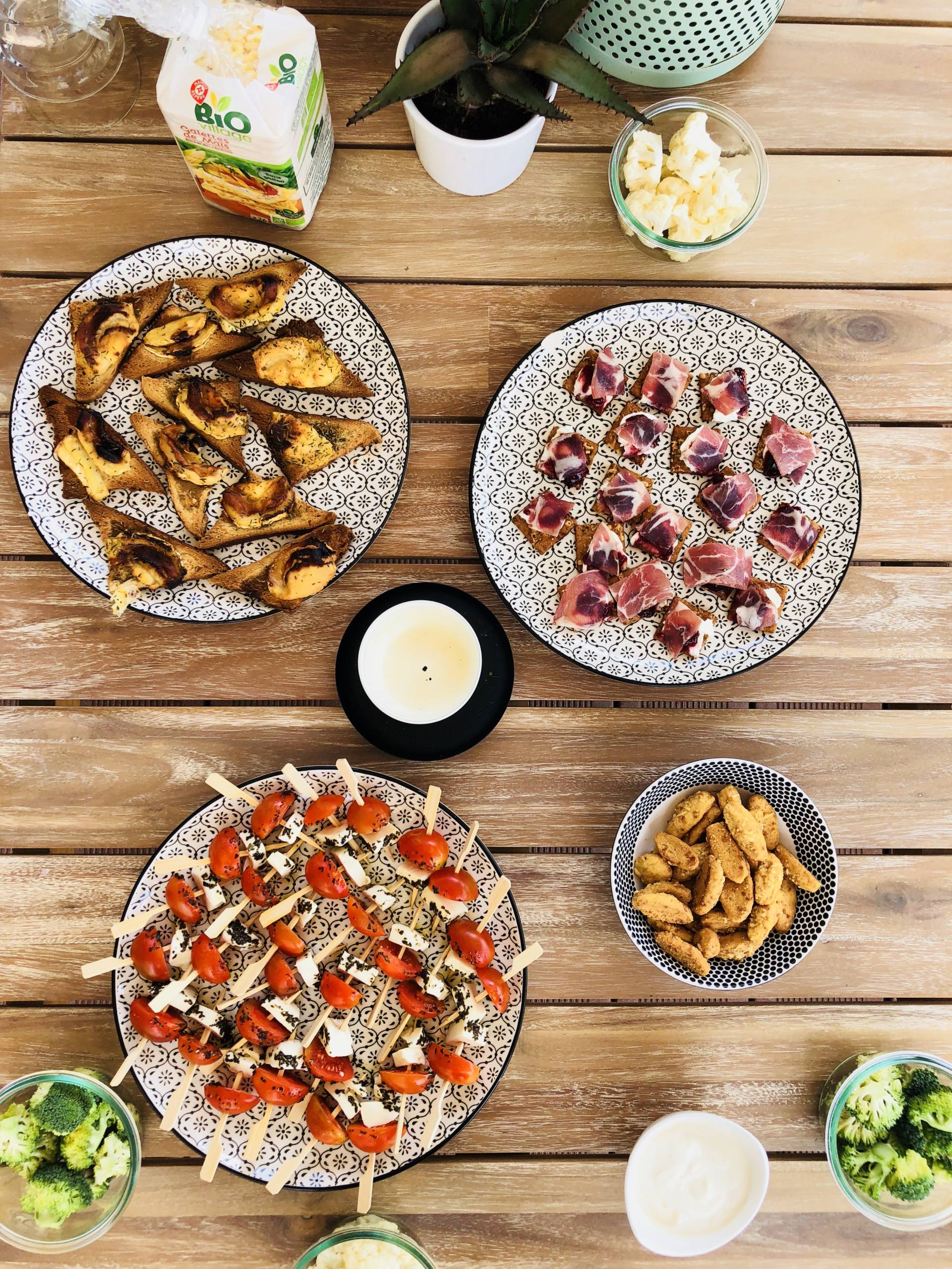 Ça y est, l’été est enfin là, c’est la danse de la joie ! En tous cas, moi je suis en folie, je l’ai attendu ce soleil, la chaleur aussi ! D’ailleurs, je n’ai pas lésiné, depuis 10 jours, j’ai enchaîné bateau, plage, pool party, bateau, barbecues ! Je rattrape ces mois de printemps perdus, et surtout, on profite enfin des extérieurs ! Finalement, notre terrasse n’était pas finie mais ça ne nous a pas manqué ! On reçoit les dernières chaises qui vont avec notre table dans quelques jours et tous les jolis coussins pour habiller les fauteuils arrivent aussi très bientôt. Bref, on est presque prêt pour les apéros et barbecues d’été ! Le weekend dernier, on a fait un apéro avec tous les copains pour fêter l’Iron Man de Steph ! Tout l’été, on adore faire des apéros à la maison, sur notre grande terrasse ! Cette année, je me suis donnée pour être à peu près à l’aise dans mon corps cet été. Du coup, hors de question de sauter sur les chips, la charcuterie et les cacahuètes ! En manger un peu oui, mais pas trop ! Du coup, ce seront des tables avec des apéros plus sains mais hyper gourmands quand même ! Il y a certaines recettes que je fais très souvent donc j’avais envie de vous les récapituler dans un article ! Ça tombe bien, avec la team Leclerc, ils m’ont mis au défi de vous concocter des petites recettes bio, gourmandes, et surtout, à un prix raisonnable, grâce aux produits de la marque Bio Village ! Je l’ai souvent dit mais je fais mes courses au drive Leclerc qui est à 2 minutes de chez moi. C’est pratique, je ne fais que des drives depuis 4 ans maintenant ! Dans le mien, il y a beaucoup de choix donc ça nous convient ! Allez, c’est parti pour des petites recettes pour un apéro healthy !