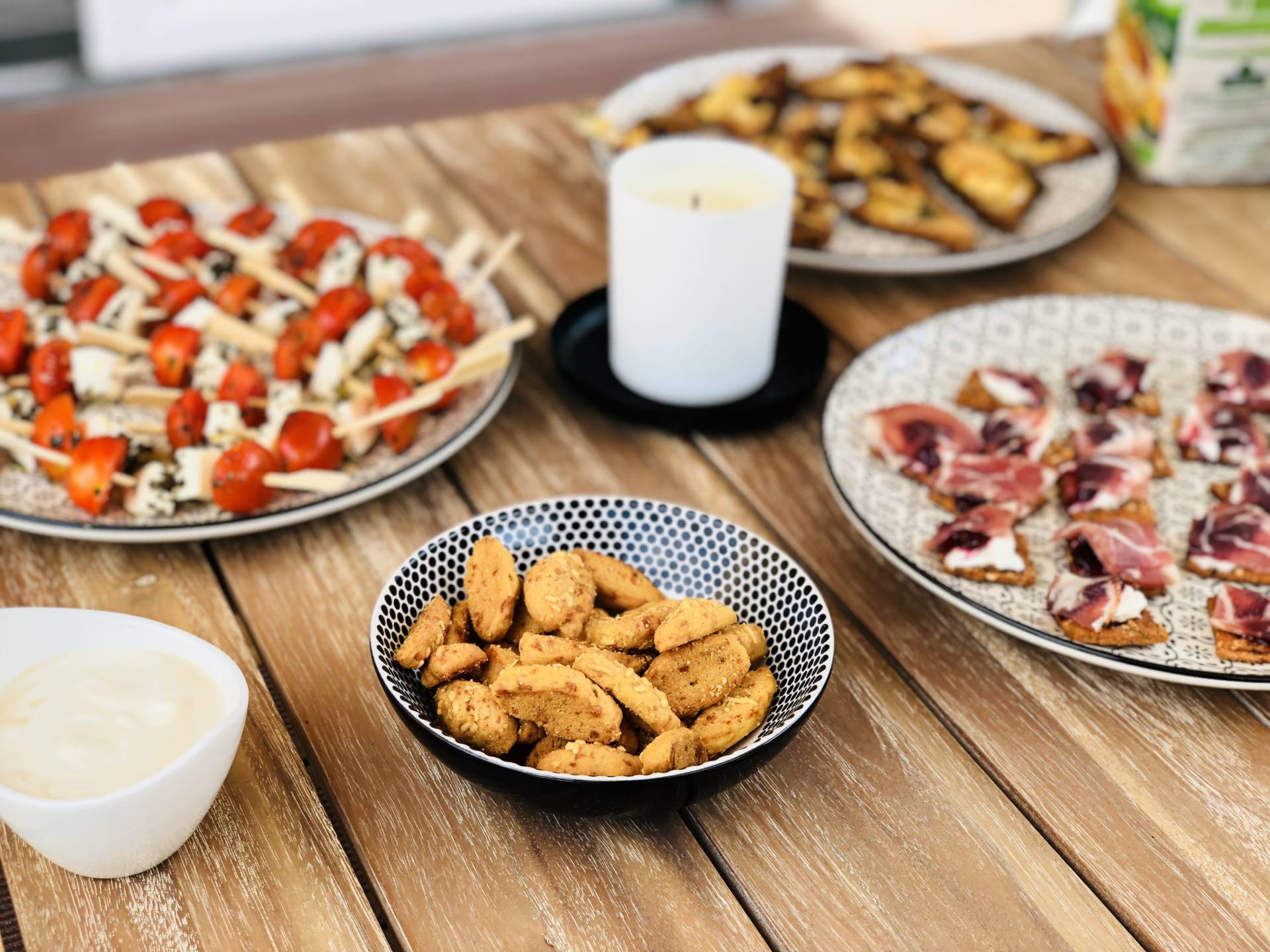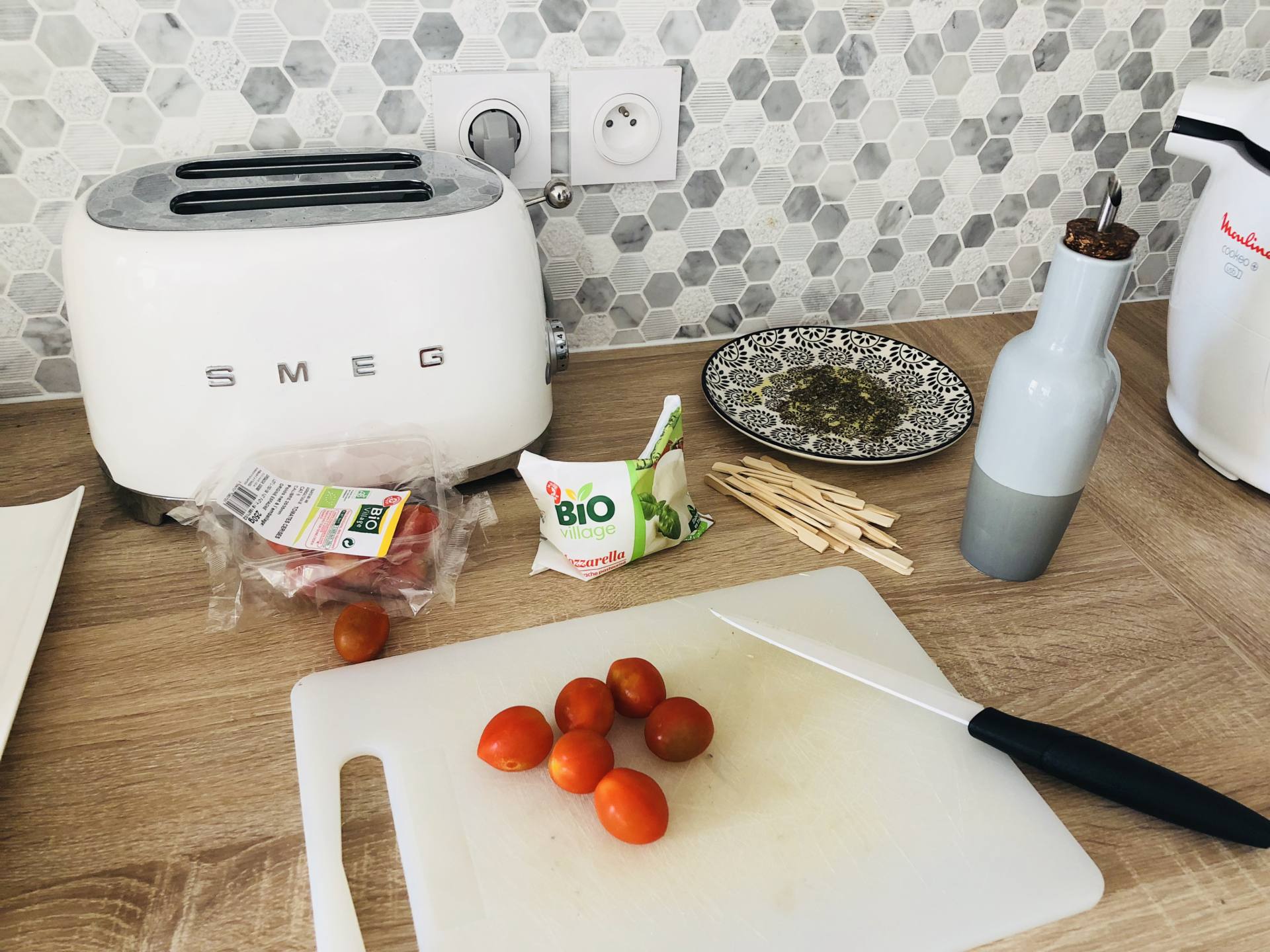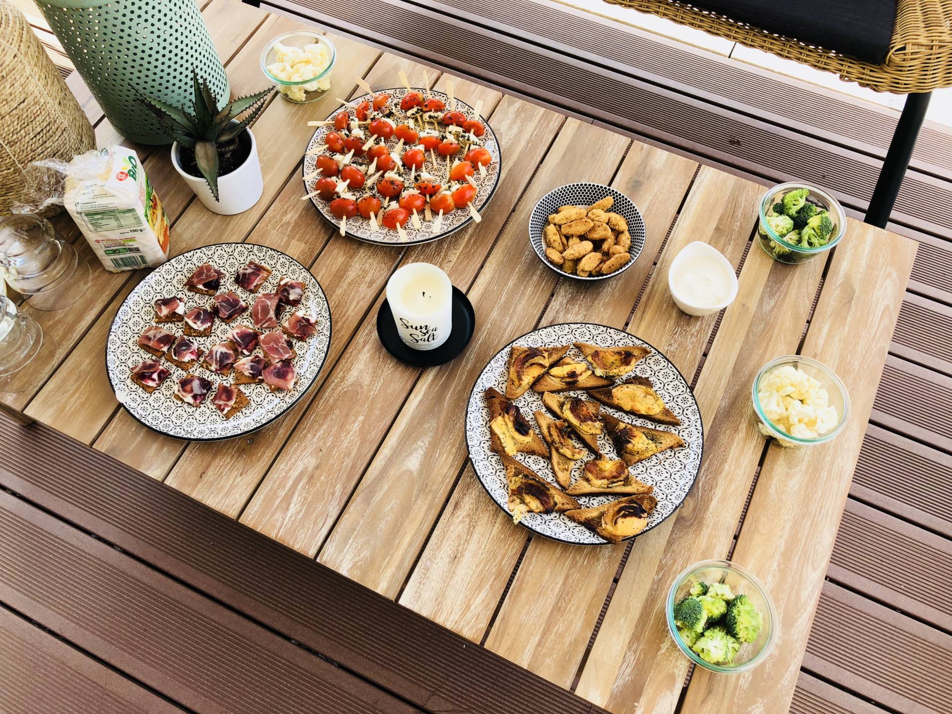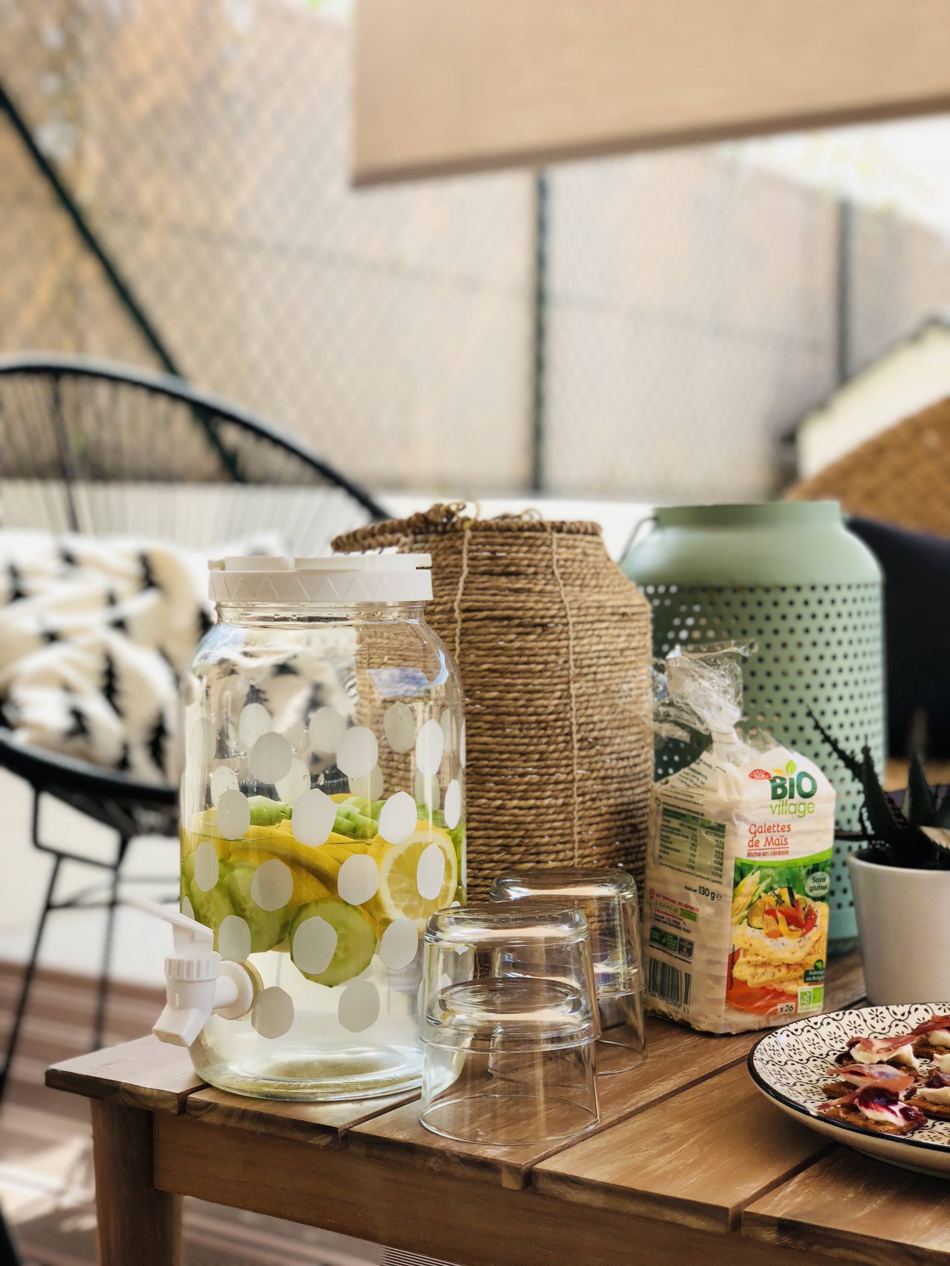Ça y est, l’été est enfin là, c’est la danse de la joie ! En tous cas, moi je suis en folie, je l’ai attendu ce soleil, la chaleur aussi ! D’ailleurs, je n’ai pas lésiné, depuis 10 jours, j’ai enchaîné bateau, plage, pool party, bateau, barbecues ! Je rattrape ces mois de printemps perdus, et surtout, on profite enfin des extérieurs ! Finalement, notre terrasse n’était pas finie mais ça ne nous a pas manqué ! On reçoit les dernières chaises qui vont avec notre table dans quelques jours et tous les jolis coussins pour habiller les fauteuils arrivent aussi très bientôt. Bref, on est presque prêt pour les apéros et barbecues d’été ! Le weekend dernier, on a fait un apéro avec tous les copains pour fêter l’Iron Man de Steph ! Tout l’été, on adore faire des apéros à la maison, sur notre grande terrasse ! Cette année, je me suis donnée pour être à peu près à l’aise dans mon corps cet été. Du coup, hors de question de sauter sur les chips, la charcuterie et les cacahuètes ! En manger un peu oui, mais pas trop ! Du coup, ce seront des tables avec des apéros plus sains mais hyper gourmands quand même ! Il y a certaines recettes que je fais très souvent donc j’avais envie de vous les récapituler dans un article ! Ça tombe bien, avec la team Leclerc, ils m’ont mis au défi de vous concocter des petites recettes bio, gourmandes, et surtout, à un prix raisonnable, grâce aux produits de la marque Bio Village ! Je l’ai souvent dit mais je fais mes courses au drive Leclerc qui est à 2 minutes de chez moi. C’est pratique, je ne fais que des drives depuis 4 ans maintenant ! Dans le mien, il y a beaucoup de choix donc ça nous convient ! Allez, c’est parti pour des petites recettes pour un apéro healthy !