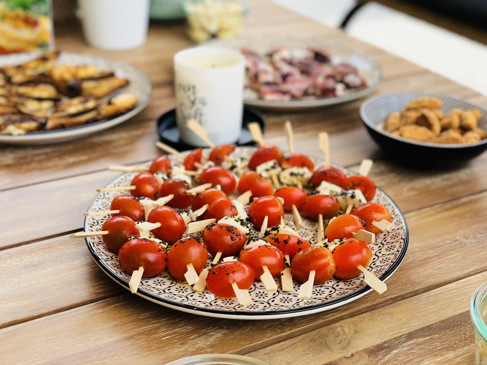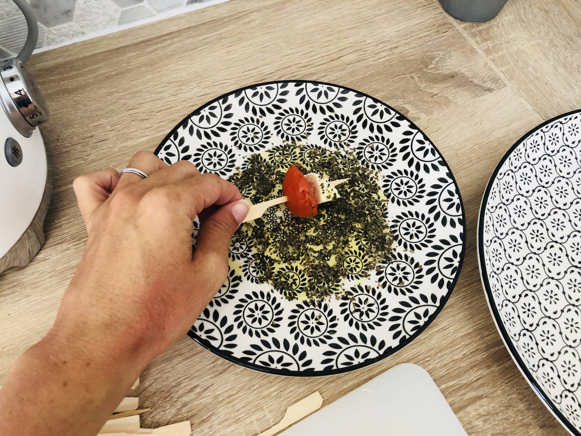 Piquer en alternance des tomates cerise et de la mozzarella. Dans une assiette, mettre du basilic séché et de l’huile d’olive. Rouler chaque brochette dans le mélange !