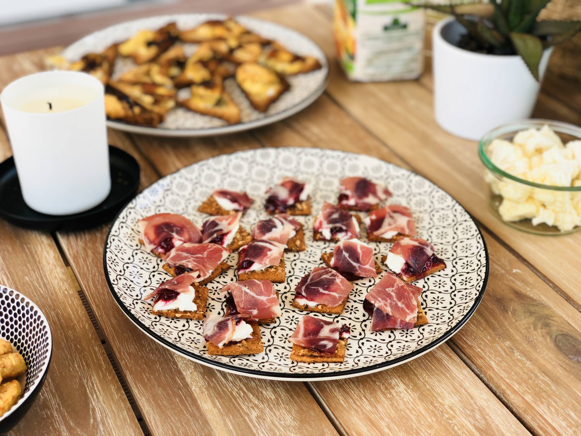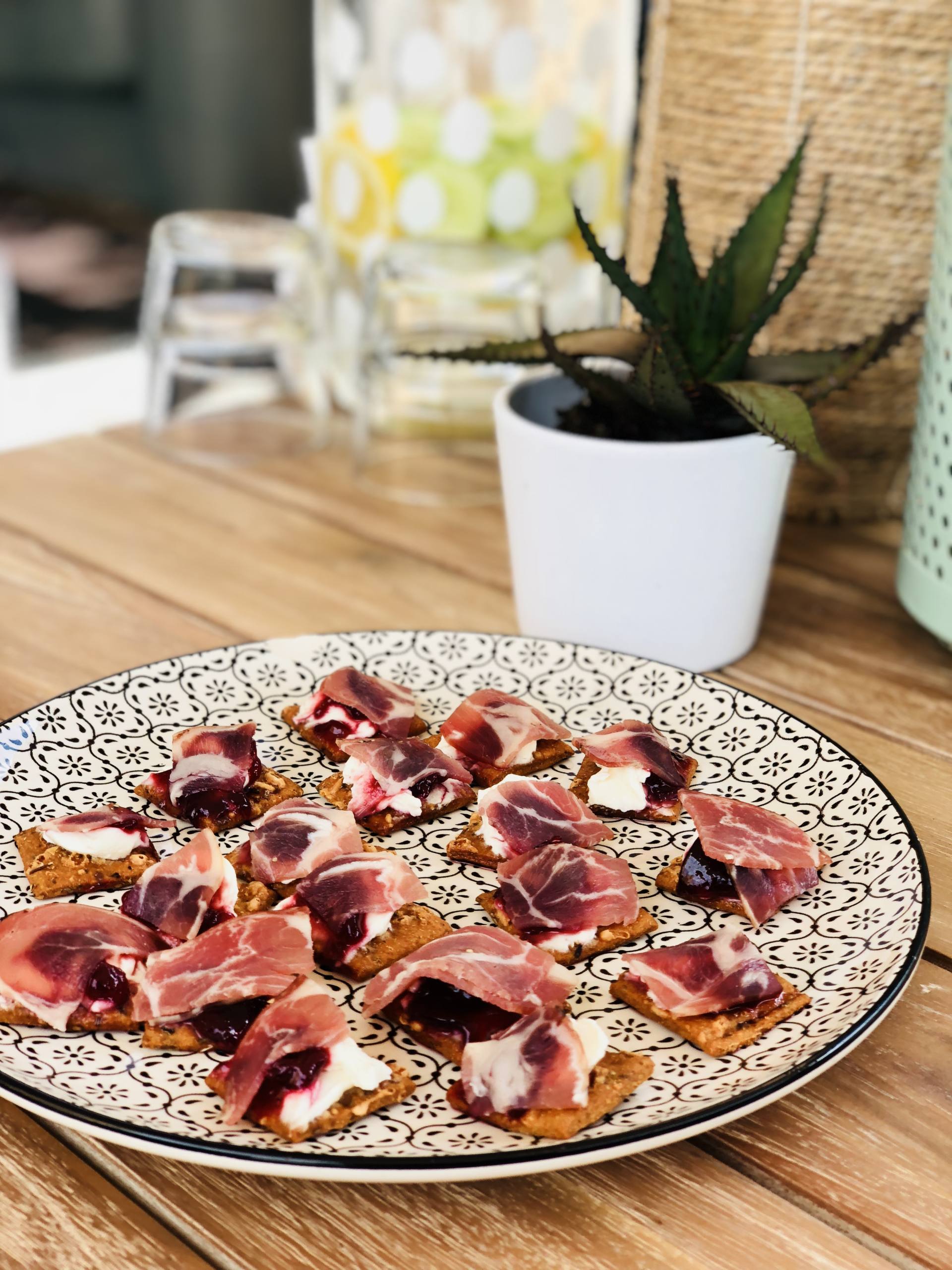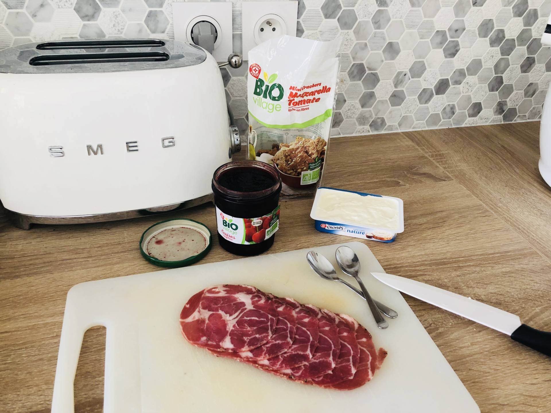 Il y a quelque chose que j’adore dans les produits Bio Village, ce sont les crakers Tomate Mozzarella ! Ils sont DÉLICIEUX ! Pour l’apéro, je mets un peu de fromage frais dessus. Il n’y en a pas chez Bio Village donc pour ce produit, c’est la marque Leclerc classique. Mais, en exclu, je peux vous dire que quelque chose se trame pour la rentrée !! J’ajoute un peu de confiture de cerises et je recouvre de coppa. Je l’avais prise près de chez moi, elle était super bonne ! L’assiette n’a pas fait un pli, je crois que le pote de Steph a bien aimé !