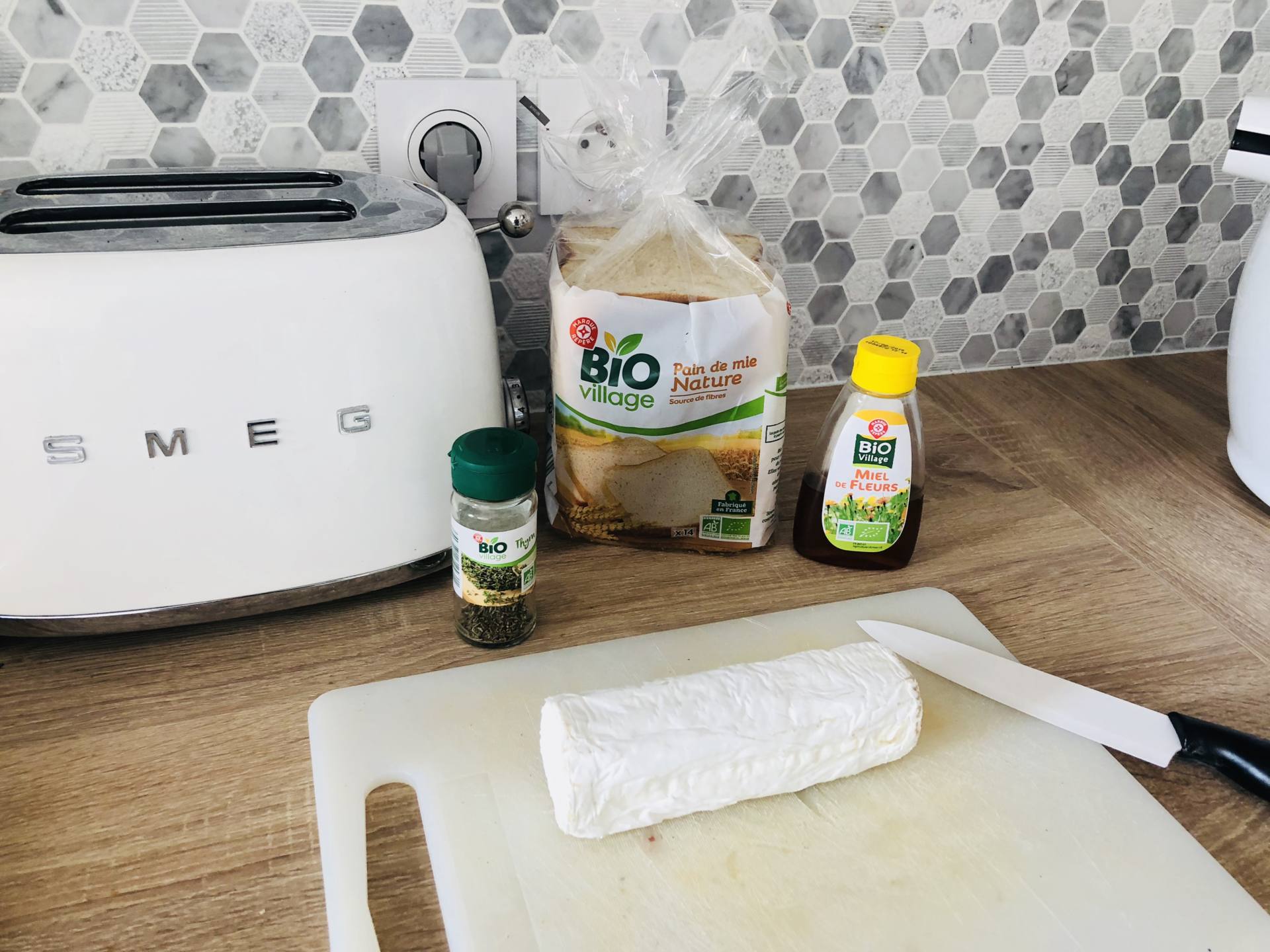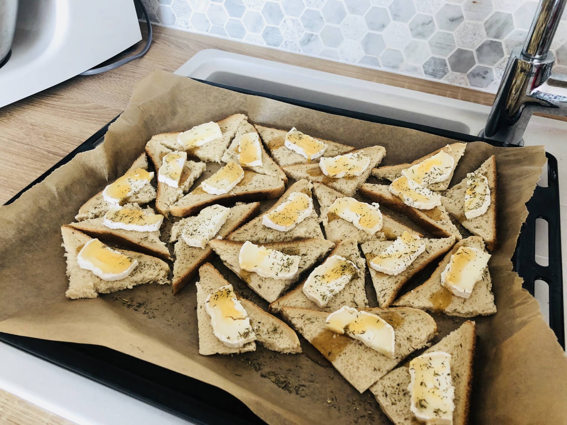 Couper des tranches de pain de mie en 4. Sur chaque morceaux, mettre un peu de fromage de chèvre, une pointe de miel puis du thym. Enfourner 7-8 minutes à 180 degrés. Les miens ont un peu noirçi car je les ai un peu oubliés ! Mais c’est surtout le miel qui avait foncé, ça restait bon !