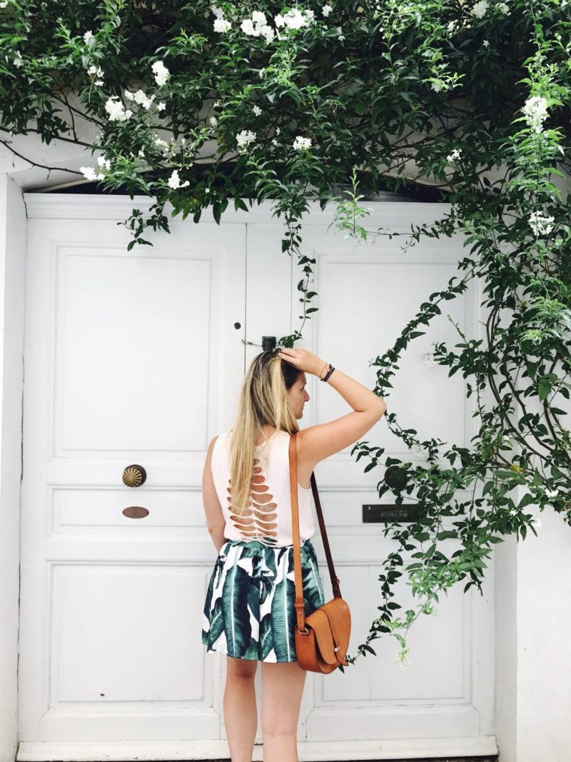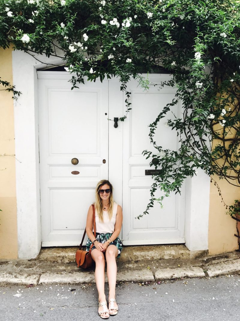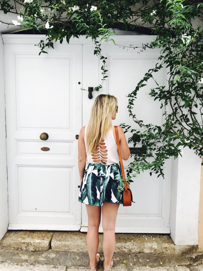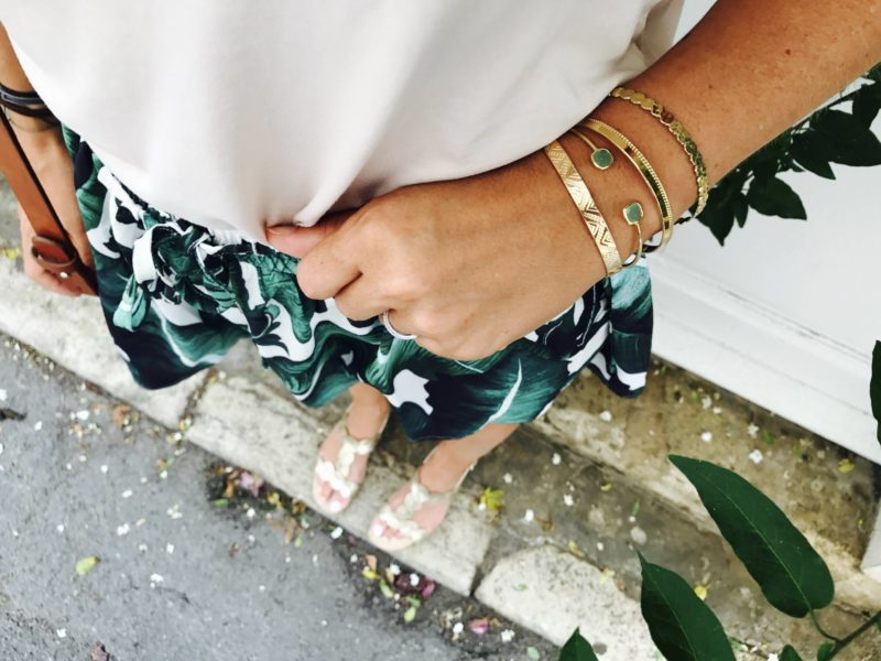 La canicule était prévue donc je lui avais proposé de se ballader dans le Vieil-Antibes, de découvrir le marché provençal, de flâner dans les petites rues avant de déjeuner dans une petite adresse sympa : le Choopy’s ! Pour la petite anecdote, on est resté 3h là-bas ! Ce sont d’abord les filles qui ont mangé, puis nous ! J’ai pris l’assiette oeufs brouillés/saumon/petite salade, c’était parfait. Et leurs cookies sont à tomber ! Les filles se sont endormies au même moment dans leurs poussettes, on a même pu manger tranquille ! Avant de passer chez moi puis de faire un tour à Polygone Riviera, j’ai demandé à Maryline de faire quelques photos de mon look bien coloré avec un tout nouveau short “palmiers” ! J’avais aussi envie de vous montrer mes nouveaux petits bijoux dont ce bracelet vert qui est un véritable coup de coeur ! J’ai craqué devant cette magnifique porte où on a fait mes quelques photos, je n’étais d’ailleurs jamais passée devant mais le blanc et la verdure au-dessus, ça allait bien avec ma tenue ! J’espère que ça vous plaira !