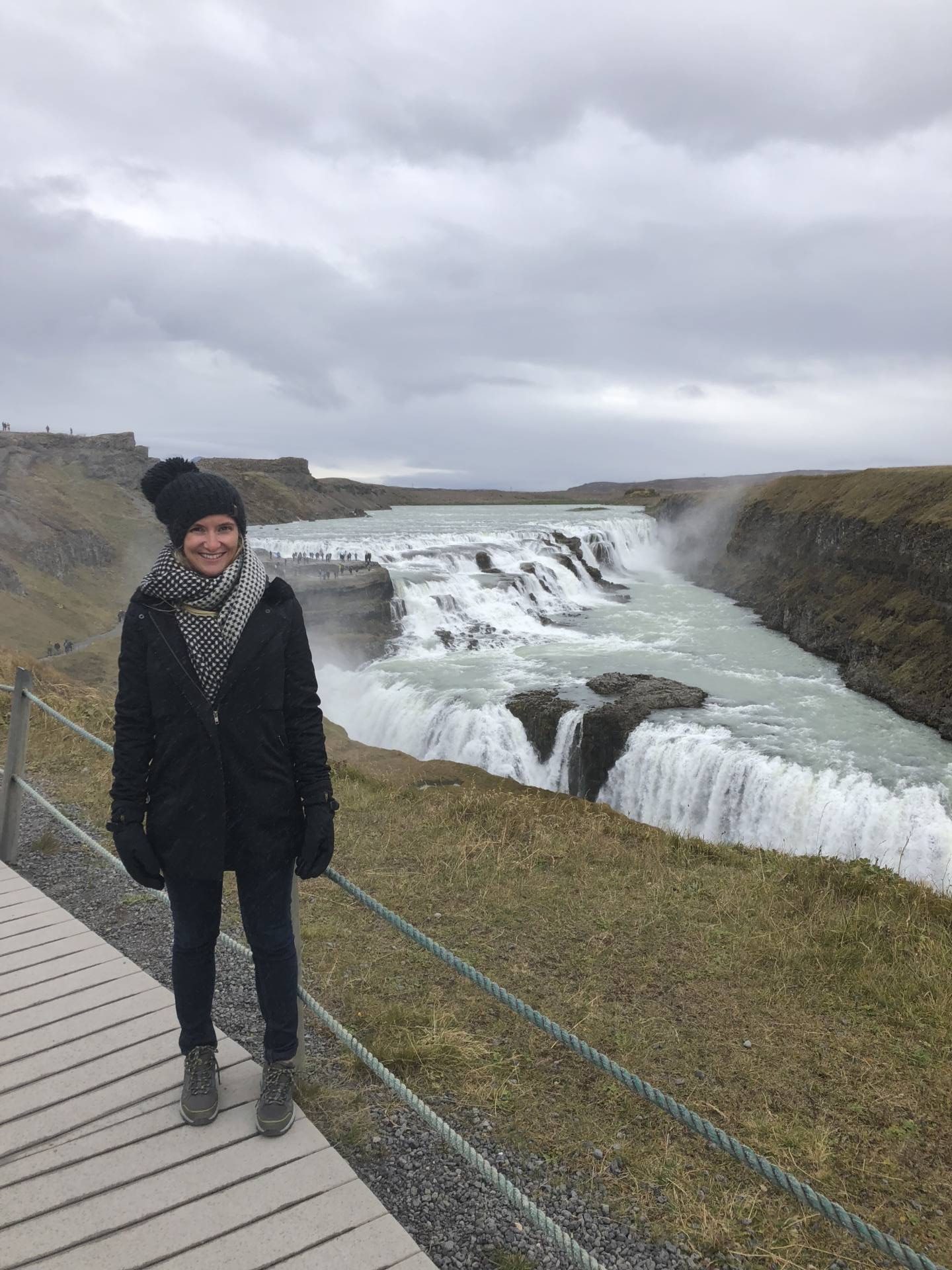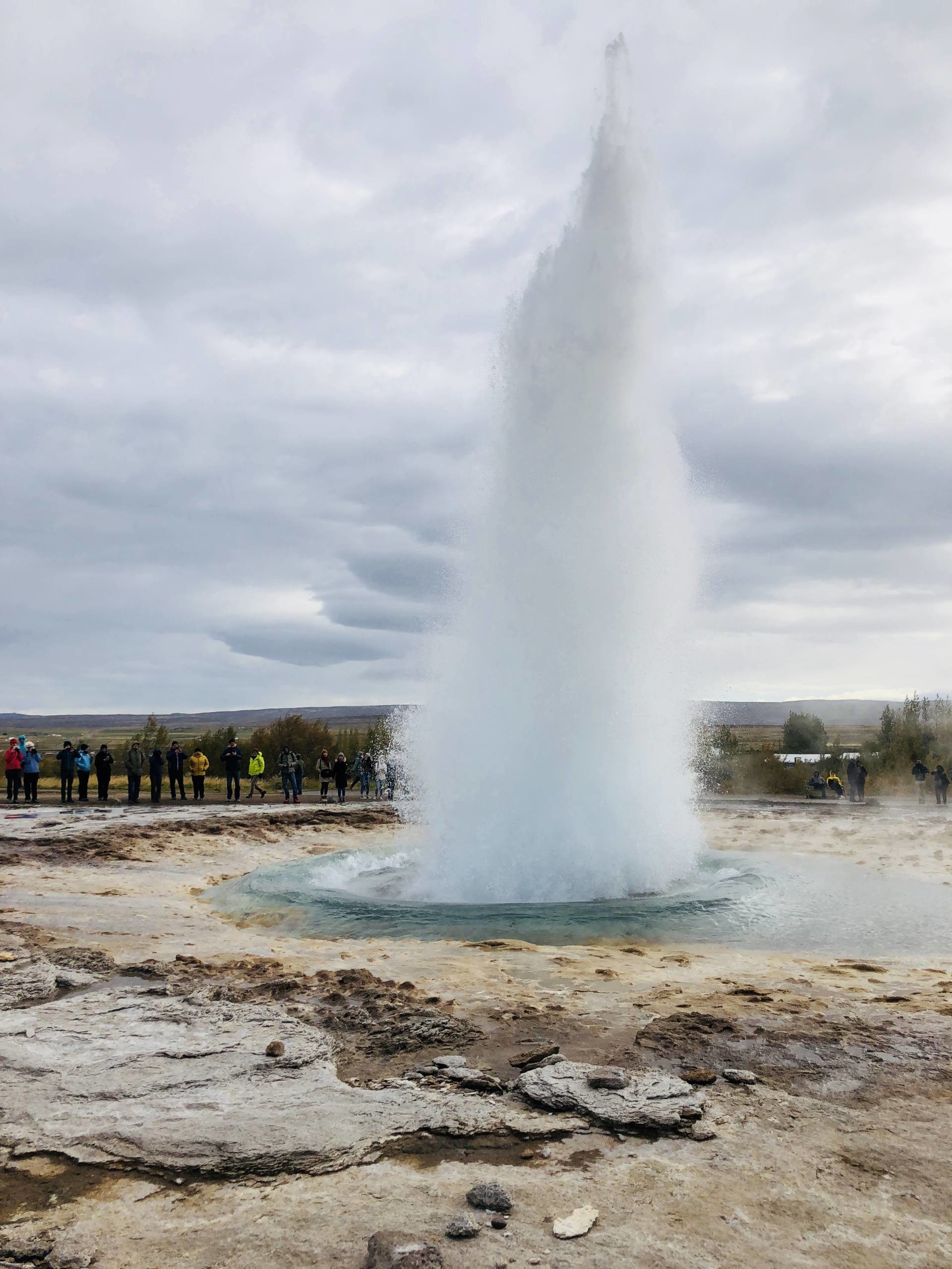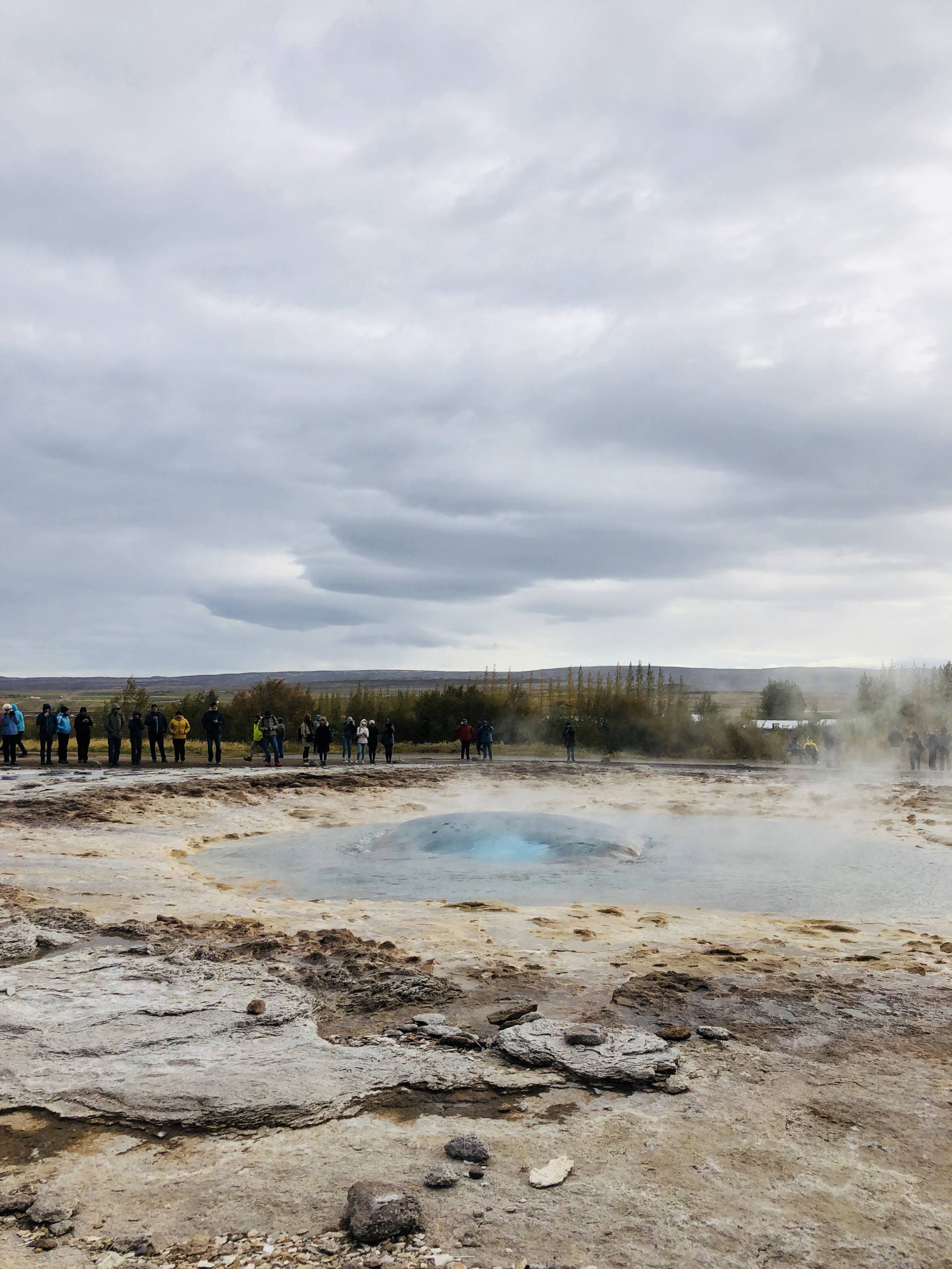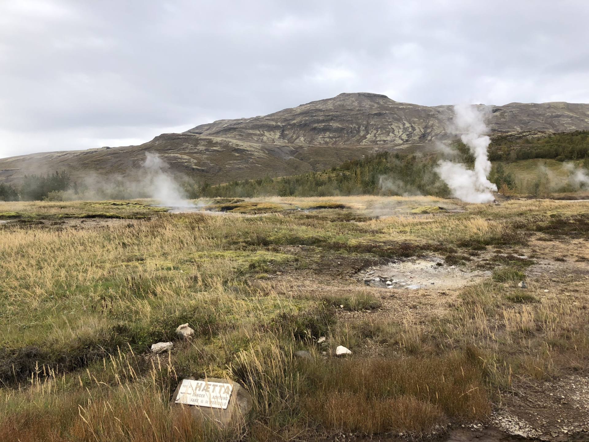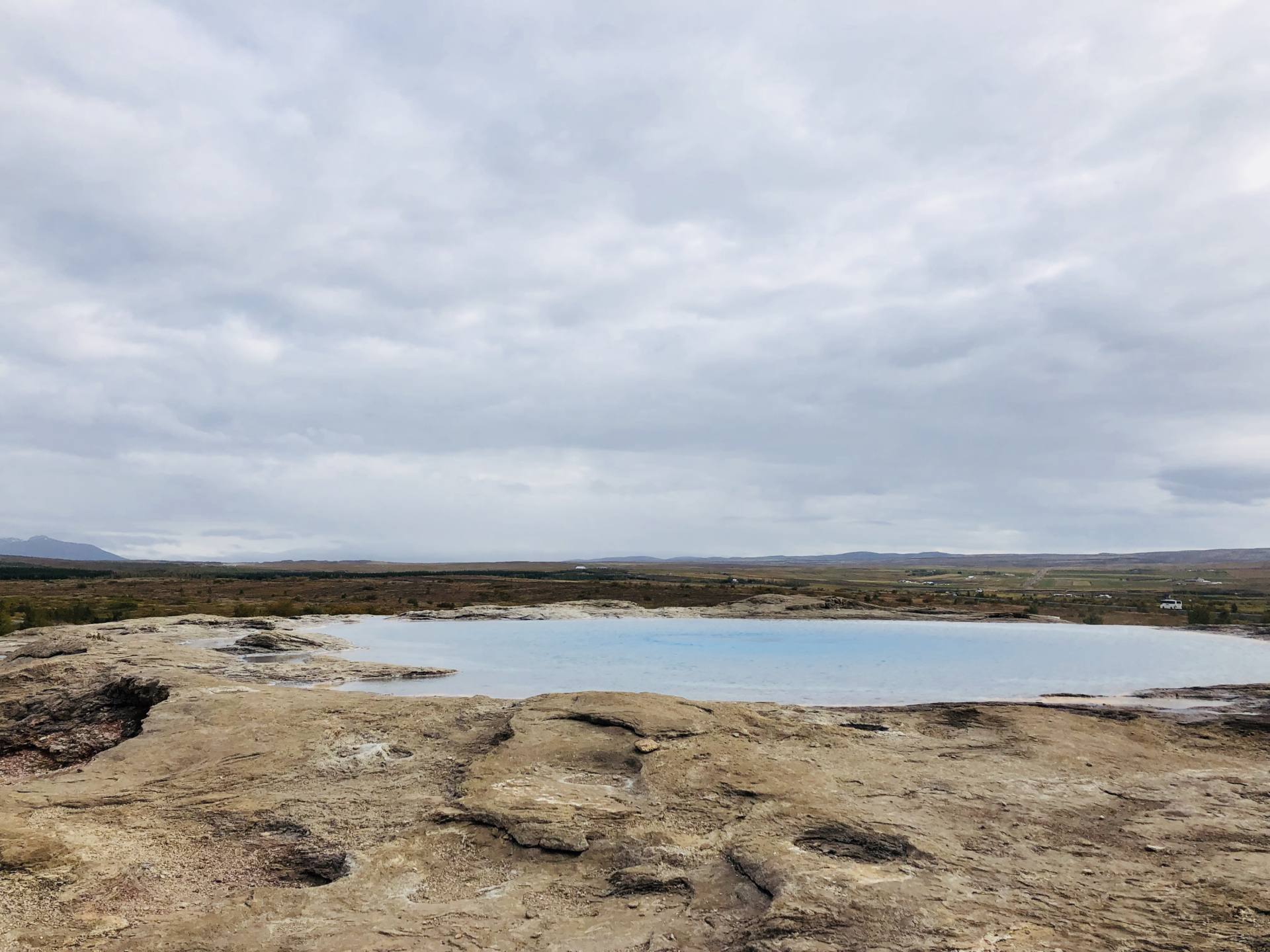 C’est ce que j’avais le plus envie de voir en Islande, le geyser ! C’est vraiment pas loin de la route et en arrivant sur le site, on aperçoit des cratères fumants au sol ! Le geyser “Geysir” qui a donné son nom au site n’est plus actif. Autrefois, il atteignait 80m, et même 120m pendant le séisme de 2000. J’aurais adoré voir ça ! Celui d’a côté, Strokkur, est lui hyper actif. Il jaillit toutes les 10 minutes environ. Une belle couleur bleu polaire apparaît au moment où ça va jaillir, c’est vraiment sublime ce jet de 20m environ ! Tout autour, les geysers brûlants fument, c’est vraiment superbe ! Il y a une forte odeur de soufre, ça sent comme les oeufs !