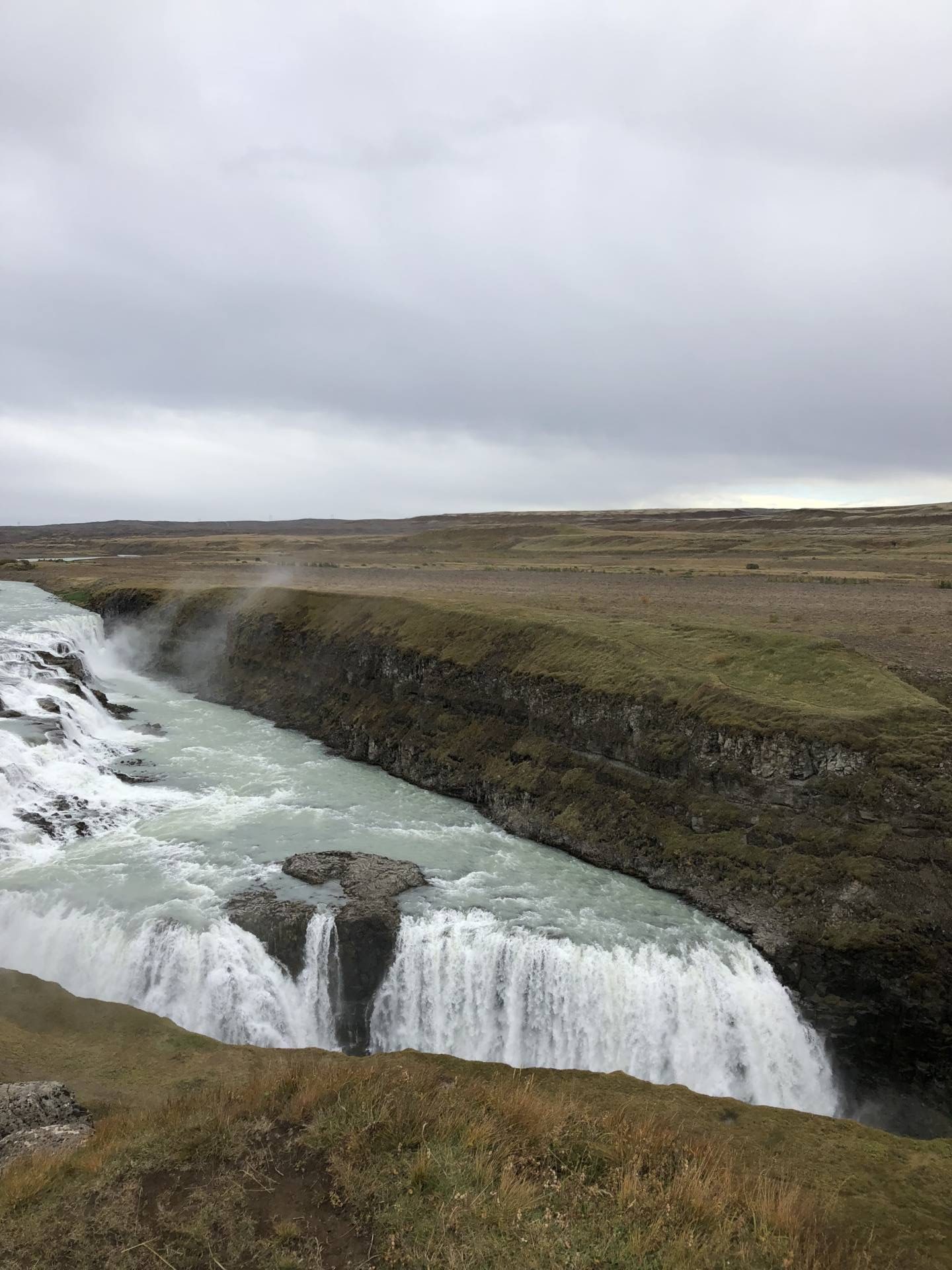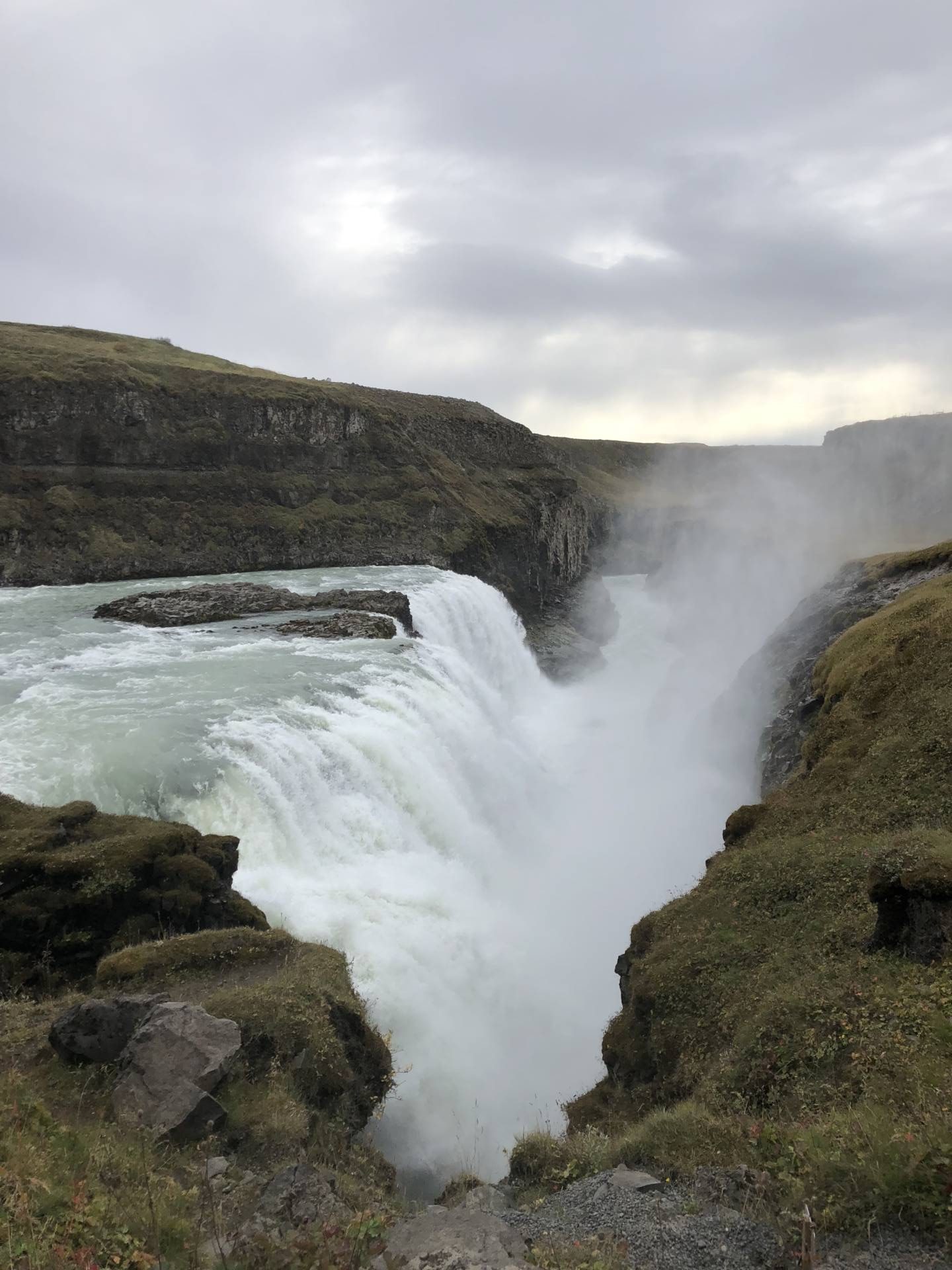 Dernier spot du Cercle d’or, Gullfoss. C’est une énorme cascade. Le site est très impressionnant et très accessible, à 5 minutes du parking ! C’est vertigineux, immense, puissant, bruyant, vraiment incroyable ! En fait, c’est une succession de deux cascades de 10m puis de 20m. Mais le plus impressionnant, c’est la largeur (70m) et surtout le débit ! C’est comme si vous aviez retenu un immense lac et que d’un seul coup, vous ouvriez les vannes ! C’est d’une puissance incroyable ! Il y a un chemin aménagé pour la voir d’en haut et un autre pour la voir de plus près. C’est juste hyper impressionnant. Il y a une telle pression que l’eau fait des embruns jusqu’en haut du site ! Ca mouille ! Elle est surnommée la Chute d’Or !
