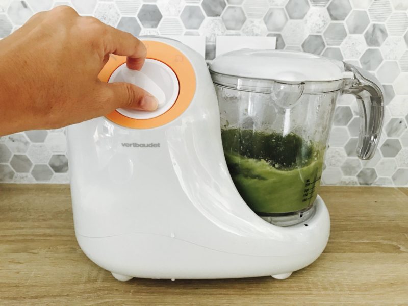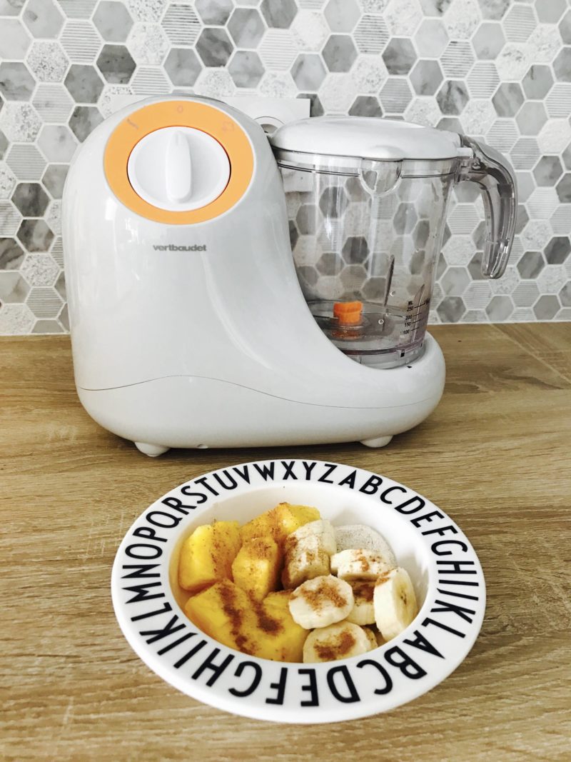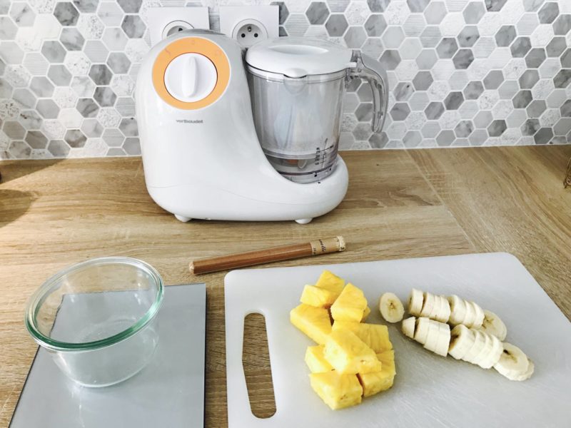 Coucou les futures mamans ou jeunes mamans ! A priori, pour cet article, on sera entre nous car je ne vois pas qui d’autres pourrait être intéressé par cet article. Vous l’avez vu en story, Louise a commencé sa diversification et je vais d’ailleurs vous en parler prochainement car l’article à ce sujet est déjà rédigé. Au moment de faire notre liste de naissance, on m’avait incité à mettre un robot pour bébé. Je m’étais dit que je trouvais cette dépense inutile car j’avais déjà un cuit-vapeur et un robot comprenant un blender et un bol multi-fonctions. Je m’étais dit que ça irait, que je ferais des recettes “en masse” et que je congèlerais. Je vous expliquerai dans mon article sur la diversification que tout ne s’est pas passé comme prévu, et notamment au sujet de l’équipement. Je me suis vite rendue compte que le robot classique ne donnait pas une belle texture de purée. Quand les quantités sont trop faibles, tout part sur les parois et cela ne mixe pas. Certains légumes ne se mixent pas avec le bol ou le blender comme les poireaux ou les haricots verts car c’est trop filandreux. J’ai aussi eu des soucis avec le melon. Bref, je me suis vraiment tâtée. Puis début août, je suis allée au mariage d’une de mes amies et une autre amie a sorti la purée de sa fille. C’est la révélation ! La texture est juste WAOU, exactement comme je voudrais mais je n’y arrive pas. Ca a fini de me convaincre, il nous faut un robot pour bébé. La semaine suivante, comme si on nous avait entendu (on leur a bien soufflé !), mes parents nous ont offert un robot. Le graal ! Vous avez été nombreuses à me dire que c’était le cadeau le plus utile à cet âge et que j’allais adorer ! Plusieurs d’entre vous m’on même dit qu’elles avaient un robot à double bol ou carrément deux robots pour gagner du temps. Nous sommes partis en vacances, puis, à notre retour de vacances, j’avais un email de la team Vert Baudet qui m’indiquait m’avoir fait une surprise en m’envoyant leur robot multi-fonctions 5 en 1 que je pourrais tester pour faire de belles purées. Oups, j’en ai 2 maintenant ! Au début, je me suis dit que j’allais leur renvoyer pour en faire profiter quelqu’un d’autres. Puis après coup, je me suis dit que j’aurais bien l’usage d’un deuxième ! Quand je me prends 1h pour faire des petits plats salés, autant optimiser le temps et faire du sucré ! Résultat, j’utilise mon premier robot pour le salé, et le robot Vert Baudet pour le sucré. Vous vous doutez bien que, comme toute règle, il y a des exceptions ! J’ai déjà fait des petits plats salés aussi dedans.