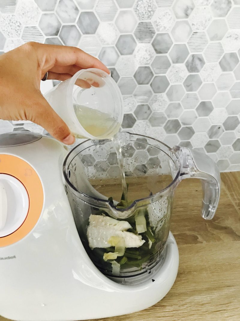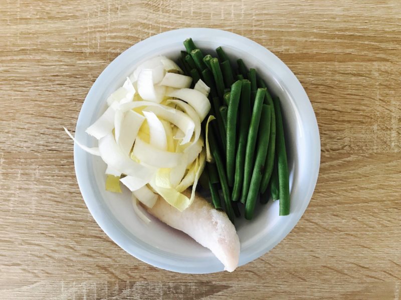 Je mets dans le bac à cuisson vapeur le morceau de poisson, les haricots verts et les endives. Une fois cuit, je mets tout cela dans le grand bol. J’ajoute le filet d’huile d’olive, les condiments et le citron. Je mixe jusqu’à obtenir la texture souhaitée, pour l’instant, toujours lisse car elle n’a pas de dents !