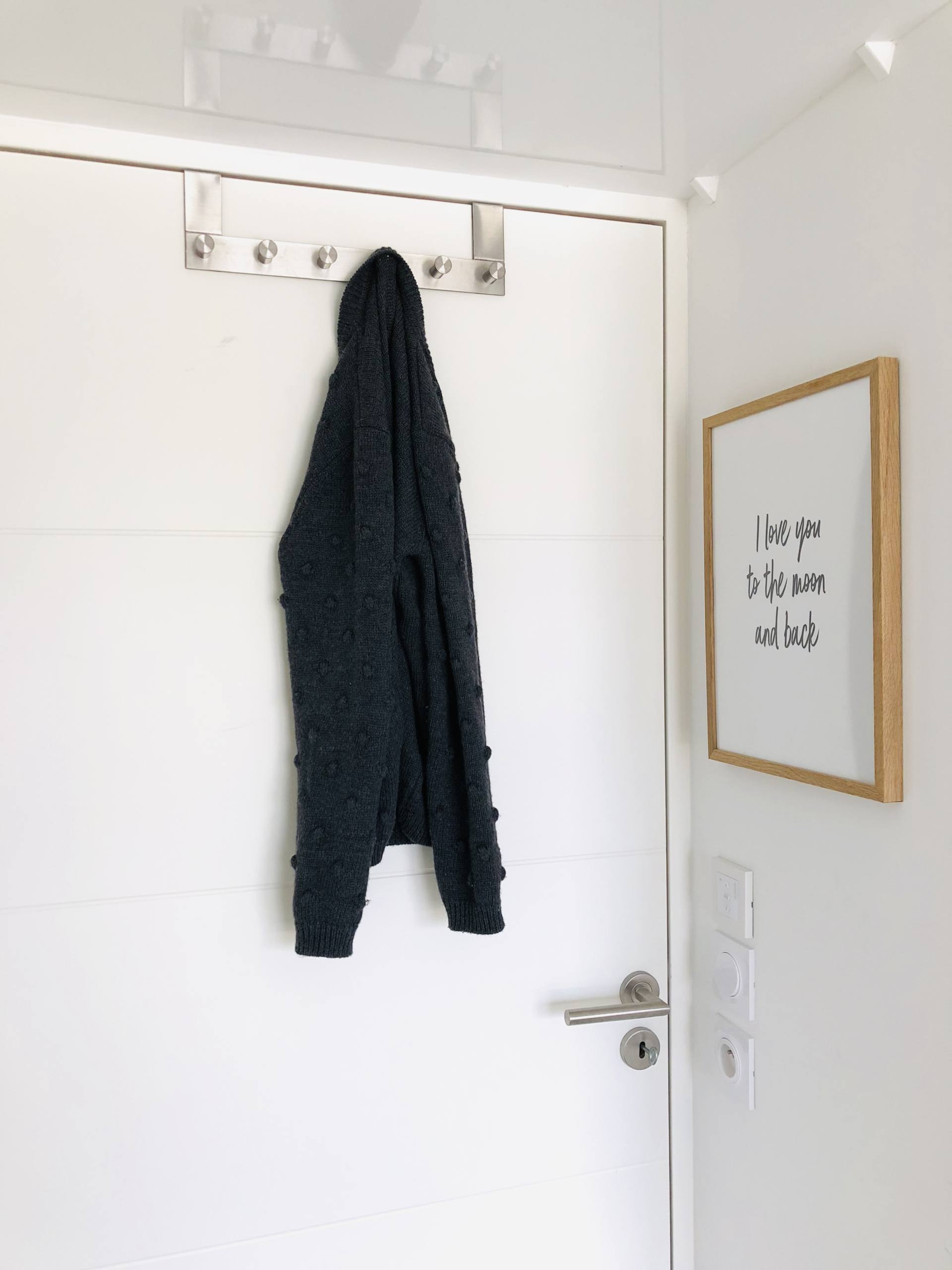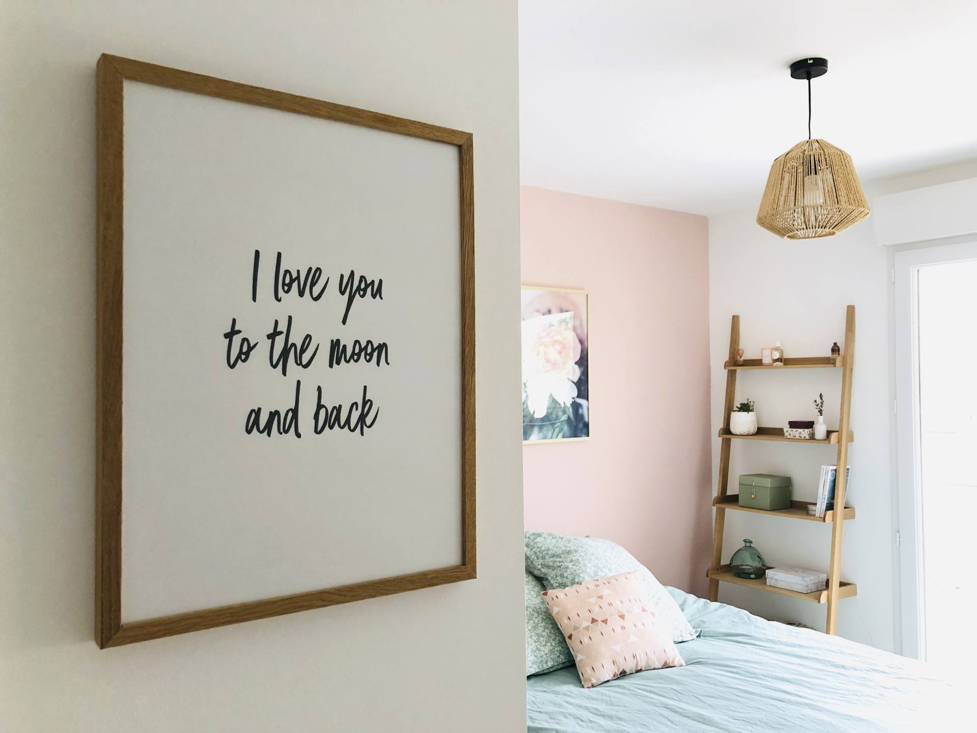 A l’entrée de la chambre, c’est encore un cadre de chez Desenio qui donne le ton : I love you to the moon and back ! C’est la chambre des amoureux ici !