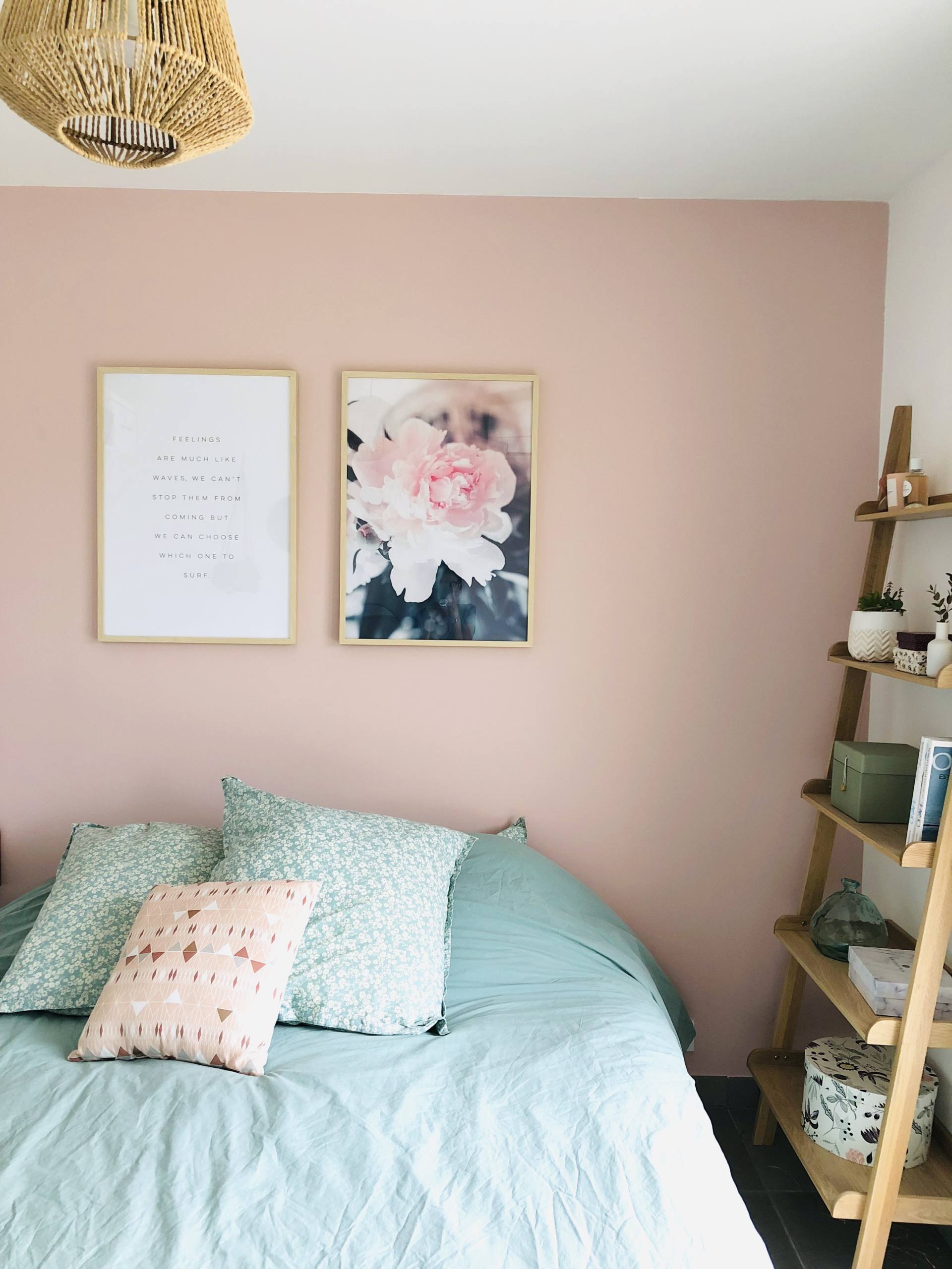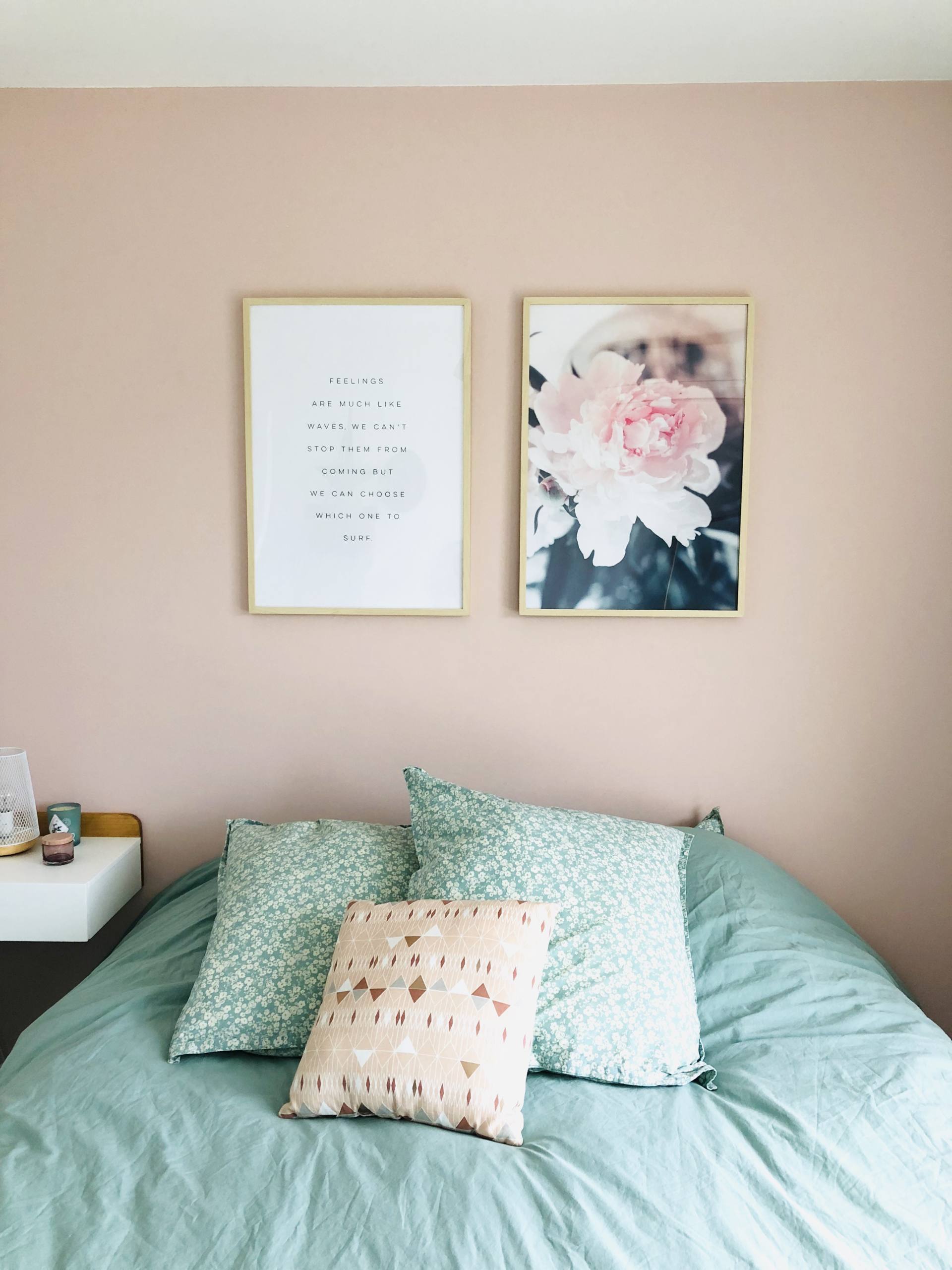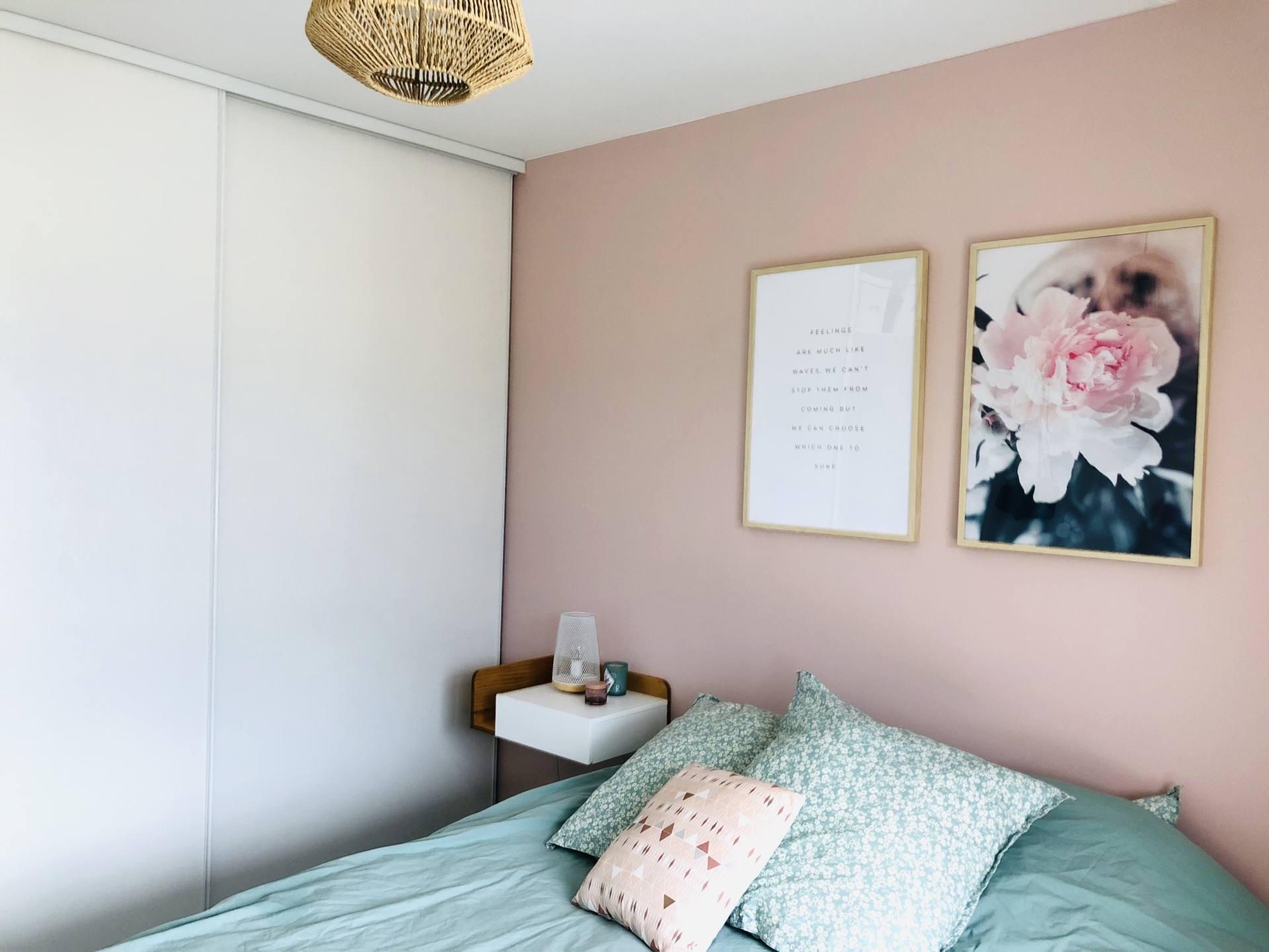 Bientôt deux ans qu’on a emménagé, alleluia, notre chambre est terminée ! C’est fou comme on a pu trainer. Et encore, on a pas aménagé notre balcon ! En même temps, je vous l’accorde, on y est vraiment pas souvent ! Notre chambre, elle est à l’étage de l’appartement donc on y est vraiment que le soir et la nuit ! Ceci dit, on avait envie d’un endroit cosy, agréable où on se sente bien. J’avais envie d’une ambiance chaleureuse, je ne voulais pas laisser les murs blancs notamment. Alors je suis partie sur deux couleurs douces et qui vont bien ensemble, le vert amande que j’aime tant et le rose poudré pour la douceur. Pour le mur, on a choisi une peinture Little Shop of Colors et le rendu est trop beau. J’avais peur de me retrouver avec un rose trop girly, c’est tellement pas évident de choisir sur un tout petit carré. Mais ce n’est pas girly du tout, c’est très beau. Sur ce mur, depuis le début, je voulais deux grands cadres pour décorer. Comme pour tous les cadres de l’appartement, on les a pris chez Desenio, en format 50 x 70 cm pour qu’ils prennent vraiment de la place sur le mur. Je les avais commandés depuis près de 2 mois, juste avant l’Islande mais on a mis du temps à les poser, comme d’habitude ! J’avais envie d’une photo d’illustration et d’un texte, je trouve que le rendu est plutôt canon ! Franchement, je les ai beaucoup vus passer ces cadres sur les réseaux sociaux, mais il n’y a pas à dire, le choix est énorme sur le site et ils sont top ! Ce texte que j’ai choisi, ça m’inspirait beaucoup, une vraie philosophie de vie de choisir là où on veut aller ! La vie, on la choisit, on ne la subit pas ! Si cela vous intéresse, voici les liens pour l’affiche avec la citation, pour l’affiche avec la fleur, pour l’affiche similaire avec “Love you to the moon and back” et pour les cadres ! Si vous avez une commande à passer pour votre home sweet home ou si vous voulez découvrir le site, j’ai le code MAUDINETTE qui vous donne -25% sur toutes les affiches Desenio du 13 au 15 novembre 2018, hors cadres et posters de la catégorie Handpicked/Collaboration. Je ne suis d’ailleurs pas à l’abri de commander à nouveau ! Vu que je suis leur compte, chaque fois que je vois passer les nouveautés, ça me donne envie ! Vu que je m’étais trompée de taille pour un des cadres du salon et que j’en veux un autre sur un autre mur, il se peut que je me serve de mon propre code !!! Si vous voulez voir la composition que j’ai faite dans le salon, c’est par ici !