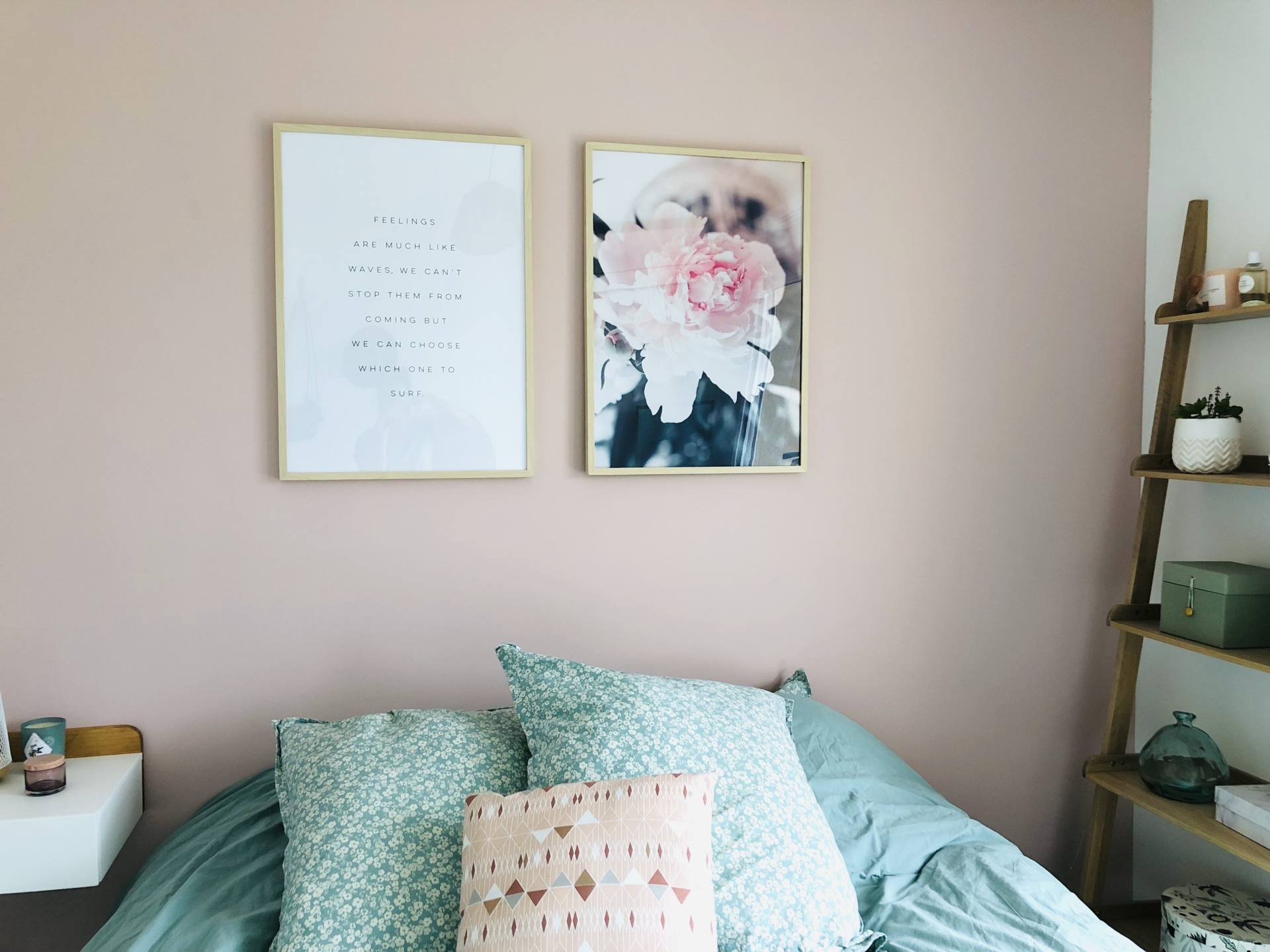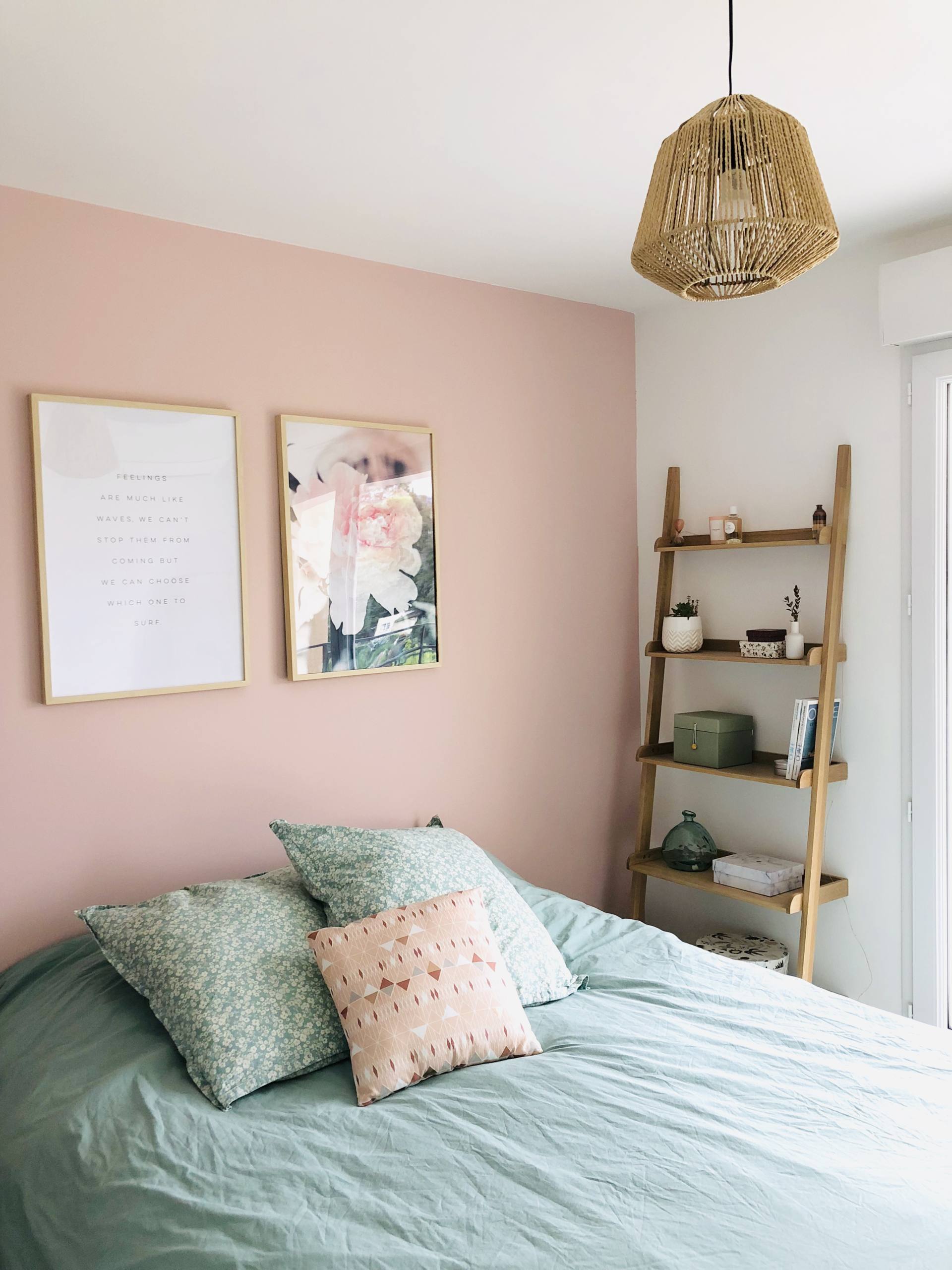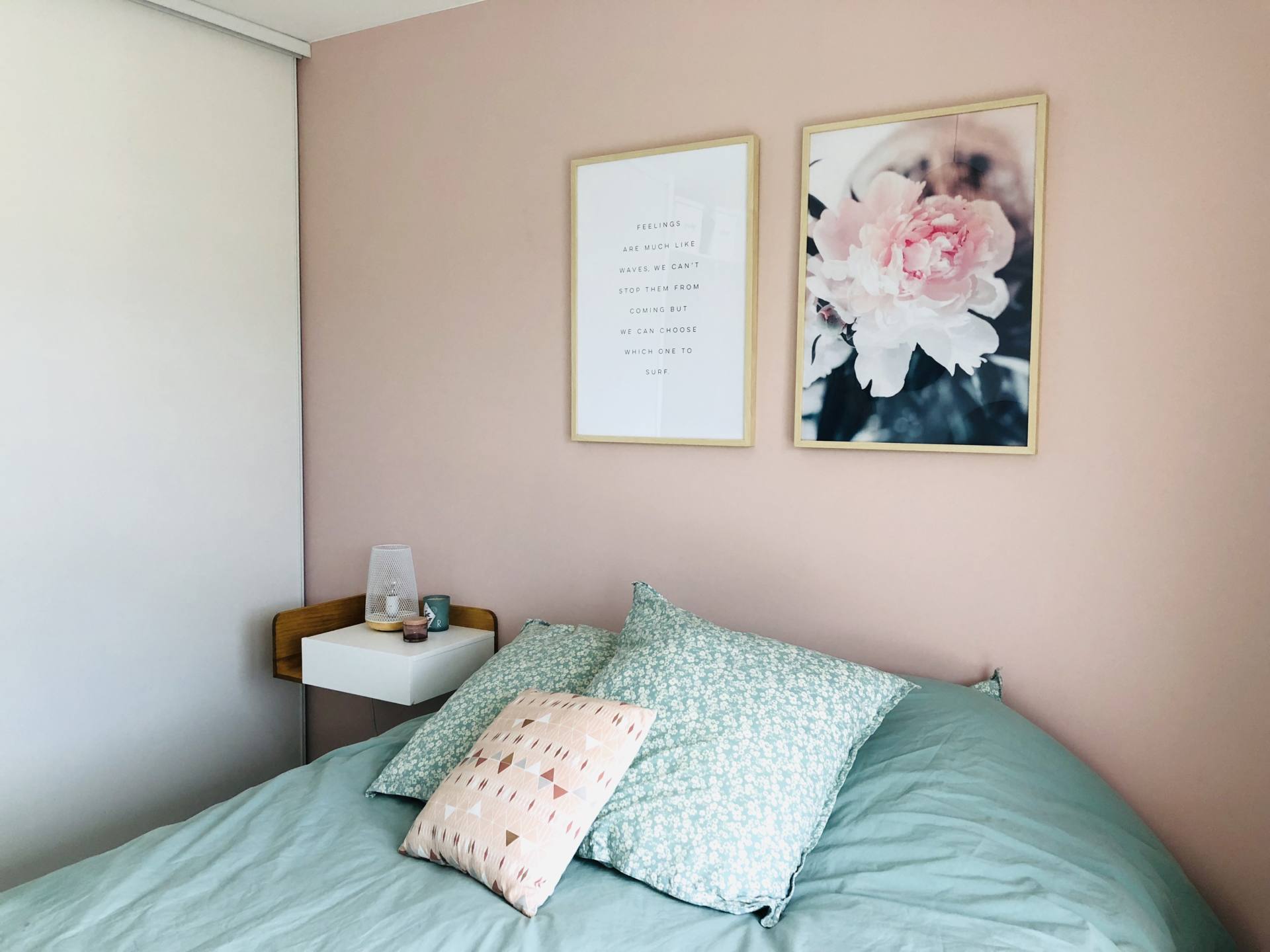 Bientôt deux ans qu’on a emménagé, alleluia, notre chambre est terminée ! C’est fou comme on a pu trainer. Et encore, on a pas aménagé notre balcon ! En même temps, je vous l’accorde, on y est vraiment pas souvent ! Notre chambre, elle est à l’étage de l’appartement donc on y est vraiment que le soir et la nuit ! Ceci dit, on avait envie d’un endroit cosy, agréable où on se sente bien. J’avais envie d’une ambiance chaleureuse, je ne voulais pas laisser les murs blancs notamment. Alors je suis partie sur deux couleurs douces et qui vont bien ensemble, le vert amande que j’aime tant et le rose poudré pour la douceur. Pour le mur, on a choisi une peinture Little Shop of Colors et le rendu est trop beau. J’avais peur de me retrouver avec un rose trop girly, c’est tellement pas évident de choisir sur un tout petit carré. Mais ce n’est pas girly du tout, c’est très beau. Sur ce mur, depuis le début, je voulais deux grands cadres pour décorer. Comme pour tous les cadres de l’appartement, on les a pris chez Desenio, en format 50 x 70 cm pour qu’ils prennent vraiment de la place sur le mur. Je les avais commandés depuis près de 2 mois, juste avant l’Islande mais on a mis du temps à les poser, comme d’habitude ! J’avais envie d’une photo d’illustration et d’un texte, je trouve que le rendu est plutôt canon ! Franchement, je les ai beaucoup vus passer ces cadres sur les réseaux sociaux, mais il n’y a pas à dire, le choix est énorme sur le site et ils sont top ! Ce texte que j’ai choisi, ça m’inspirait beaucoup, une vraie philosophie de vie de choisir là où on veut aller ! La vie, on la choisit, on ne la subit pas ! Si cela vous intéresse, voici les liens pour l’affiche avec la citation, pour l’affiche avec la fleur, pour l’affiche similaire avec “Love you to the moon and back” et pour les cadres ! Si vous avez une commande à passer pour votre home sweet home ou si vous voulez découvrir le site, j’ai le code MAUDINETTE qui vous donne -25% sur toutes les affiches Desenio du 13 au 15 novembre 2018, hors cadres et posters de la catégorie Handpicked/Collaboration. Je ne suis d’ailleurs pas à l’abri de commander à nouveau ! Vu que je suis leur compte, chaque fois que je vois passer les nouveautés, ça me donne envie ! Vu que je m’étais trompée de taille pour un des cadres du salon et que j’en veux un autre sur un autre mur, il se peut que je me serve de mon propre code !!! Si vous voulez voir la composition que j’ai faite dans le salon, c’est par ici !