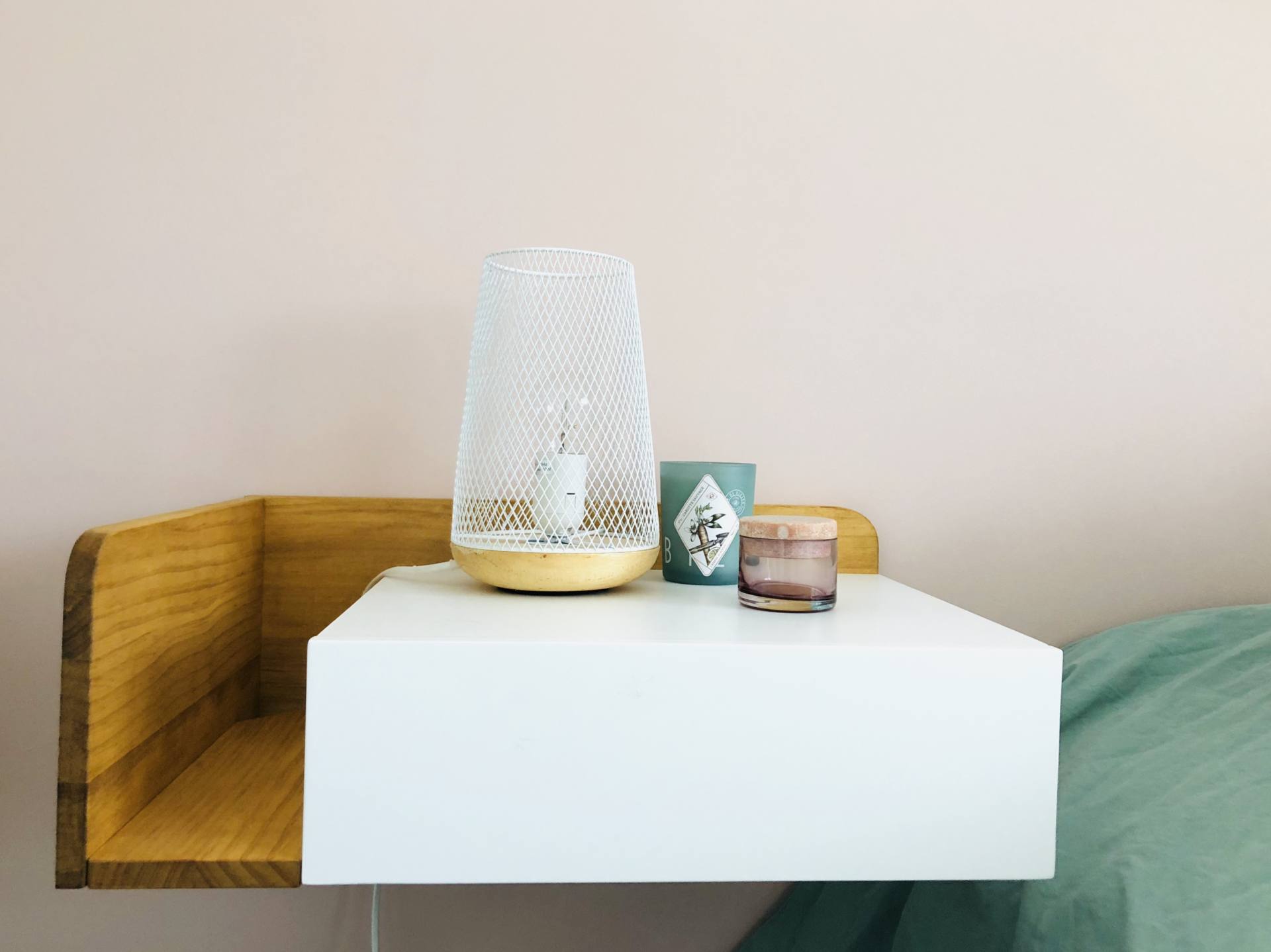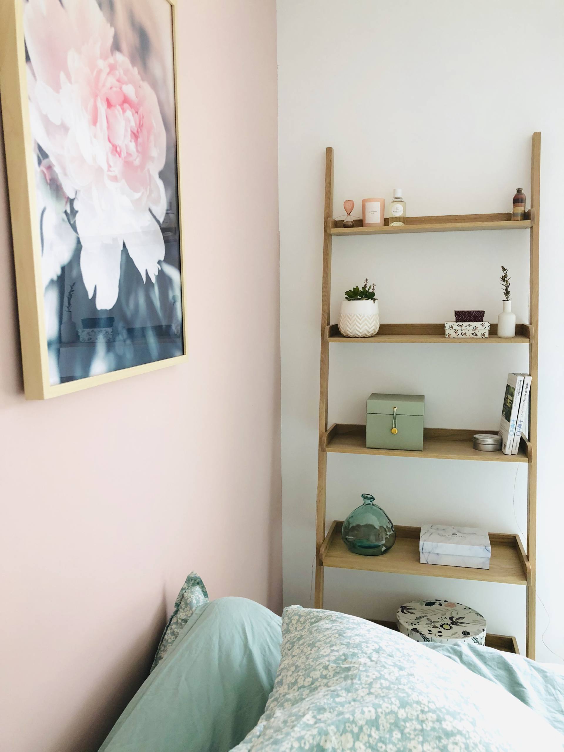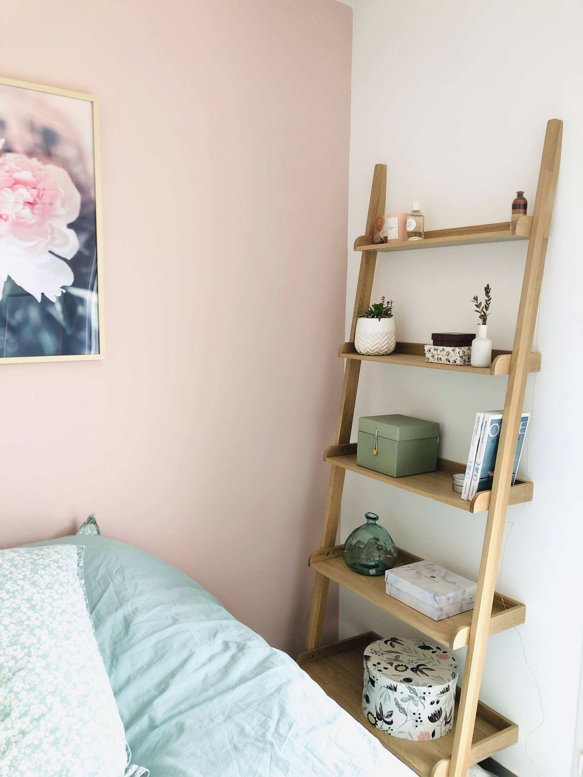 De mon côté, c’est à dire à droite, je n’avais pas spécialement envie/besoin d’une table de chevet. Je n’ai que mon téléphone à poser et je peux le poser par terre, on ne le voit pas en entrant dans la pièce ! Par contre, j’avais trop envie d’une étagère-échelle pour décorer et habiller la pièce. Ca tombe bien, on avait trouvé celle-ci chez Fly et elle avait la dimension parfaite, tout comme le coloris d’ailleurs. Bon, je me souviens qu’il y a eu 6-8 semaines de délais, elle est souvent marquée indisponible mais on a patienté, elle réapparait toujours ! Sur cette échelle, pas mal de petites choses sont posées. Tout en haut, c’est un petit sablier en verre rose ramené de Copenhague, une bougie rose Oh My Cream, une Eau de Givenchy (à la fleur d’oranger !) et un petit pot de sable ramené de l’île Maurice. En dessous, il y a une plante grasse qui est d’ailleurs à changer, et des petites boîtes de chez So Strene Grene où je range une boîte de boules Quies. Le mini-vase est de chez H&M. Encore en-dessous, c’est une grosse boîte So Strene Grene où on retrouve les livres que je suis en train de lire en ce moment. A côté, ce sont 2 livres de vie d’Estelle Lefébure que j’adore : Orahe et Orahe Le bien-être pour les enfants. Je les cale avec une jolie bougie qu’on retrouve sur Lepetitcoton.fr ! Tout en bas, il y a un vase en verre vert, une Glossy Box qui sert de rangement et une grosse boite So Strene Grene où il y a des maillots de bain ! De son côté du lit, Stéphane voulait une table de chevet. On ne pouvait pas mettre un meuble qui soit posé au sol car cela aurait gêné l’ouverture du tiroir sous le lit. Du coup, on a opté pour une table de chevet qui a l’allure d’une tablette avec un tiroir et un peu de rangement sur le côté. C’est largement suffisant, il peut ranger 2-3 trucs, poser une lampe, un bouquin et son téléphone. On l’a trouvée sur La Redoute et elle est en ce moment à -30%. La lampe posée dessus vient de chez Atmosphera, on la trouvait sympa avec cet effet de grille, ça fait un rendu sympa le soir. Le petit pot rose vient de chez Bolia, je l’avais ramené de Stockholm. Quant à la bougie, je les adore, ce sont les Kerzon ! Le tapis qui est en-dessous vient de chez H&M mais il est vieux et c’est un blanc qui va bientôt le remplacer !