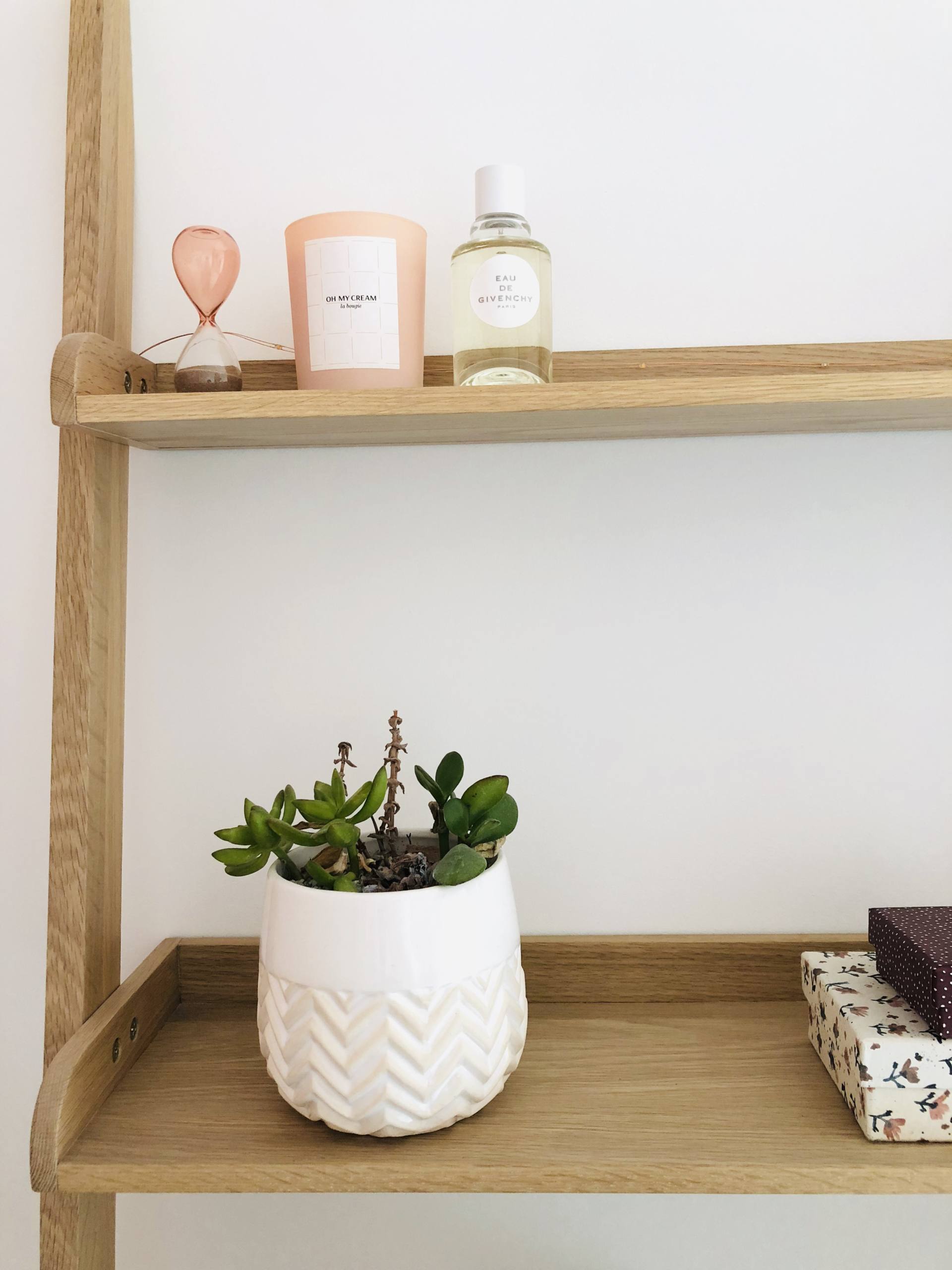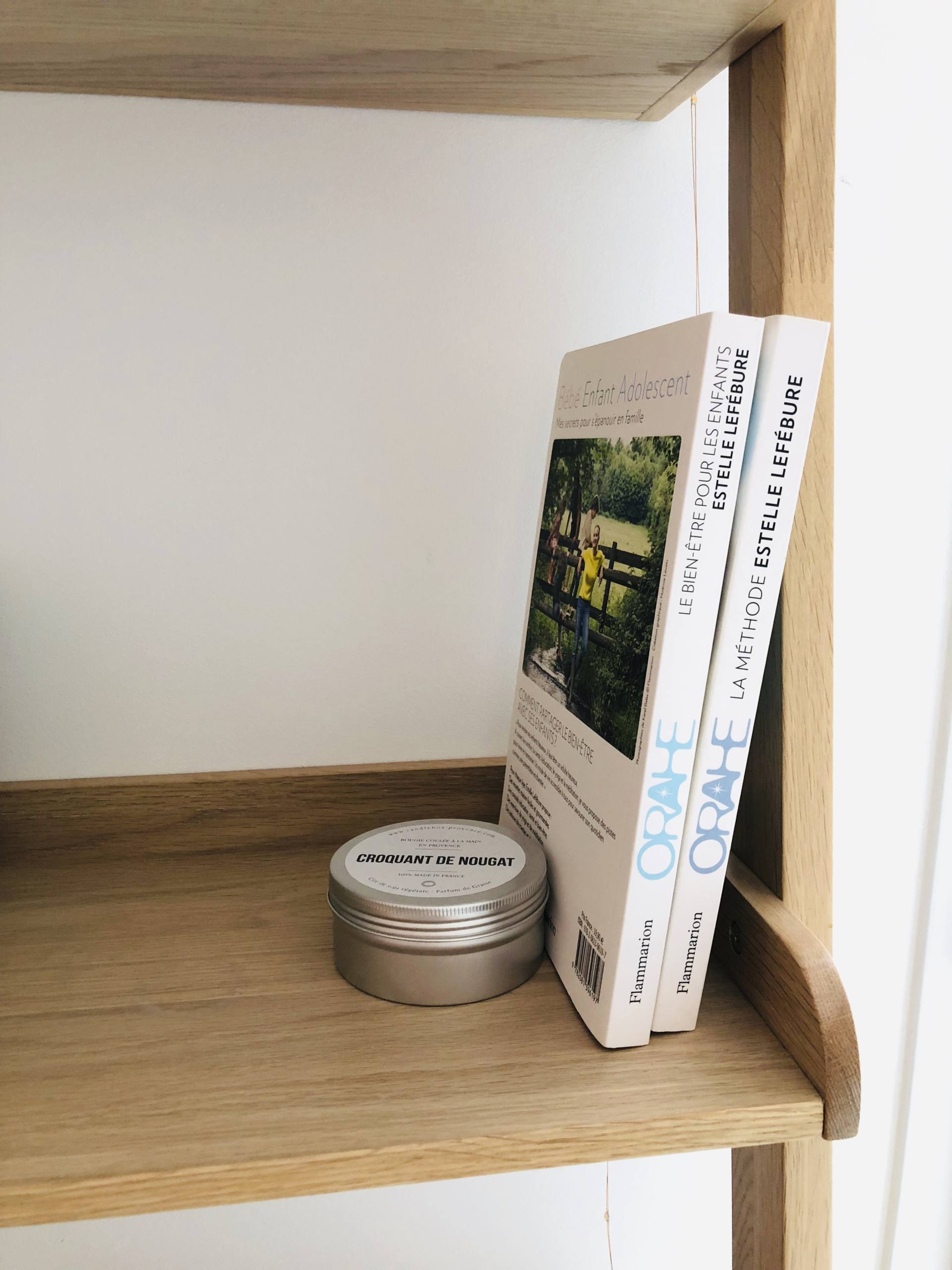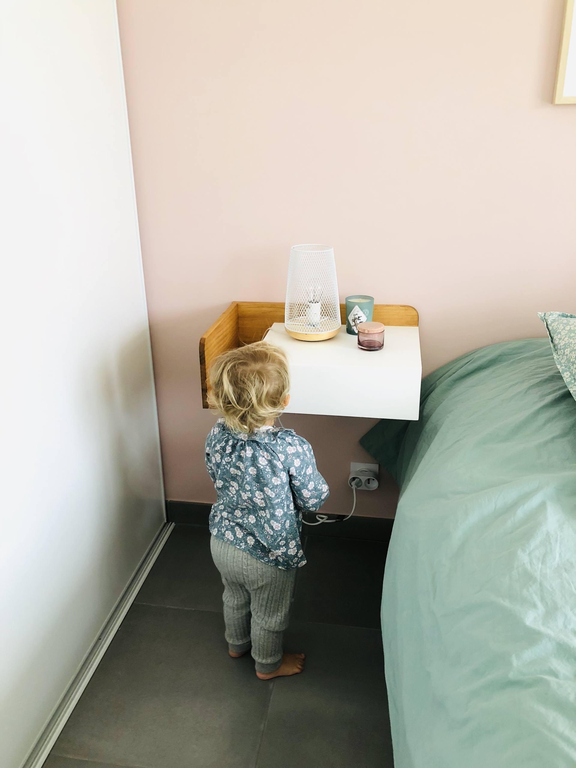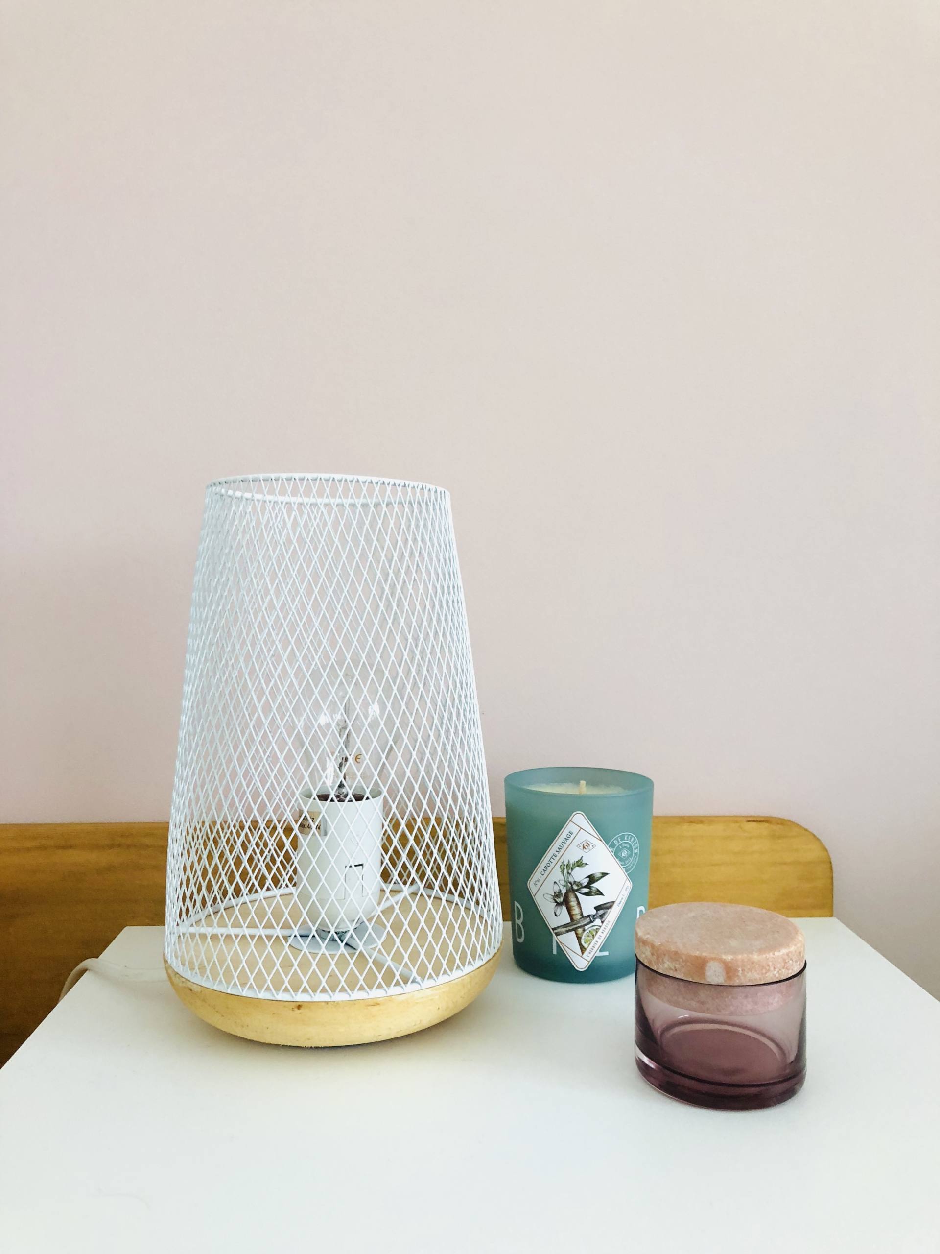 De mon côté, c’est à dire à droite, je n’avais pas spécialement envie/besoin d’une table de chevet. Je n’ai que mon téléphone à poser et je peux le poser par terre, on ne le voit pas en entrant dans la pièce ! Par contre, j’avais trop envie d’une étagère-échelle pour décorer et habiller la pièce. Ca tombe bien, on avait trouvé celle-ci chez Fly et elle avait la dimension parfaite, tout comme le coloris d’ailleurs. Bon, je me souviens qu’il y a eu 6-8 semaines de délais, elle est souvent marquée indisponible mais on a patienté, elle réapparait toujours ! Sur cette échelle, pas mal de petites choses sont posées. Tout en haut, c’est un petit sablier en verre rose ramené de Copenhague, une bougie rose Oh My Cream, une Eau de Givenchy (à la fleur d’oranger !) et un petit pot de sable ramené de l’île Maurice. En dessous, il y a une plante grasse qui est d’ailleurs à changer, et des petites boîtes de chez So Strene Grene où je range une boîte de boules Quies. Le mini-vase est de chez H&M. Encore en-dessous, c’est une grosse boîte So Strene Grene où on retrouve les livres que je suis en train de lire en ce moment. A côté, ce sont 2 livres de vie d’Estelle Lefébure que j’adore : Orahe et Orahe Le bien-être pour les enfants. Je les cale avec une jolie bougie qu’on retrouve sur Lepetitcoton.fr ! Tout en bas, il y a un vase en verre vert, une Glossy Box qui sert de rangement et une grosse boite So Strene Grene où il y a des maillots de bain ! De son côté du lit, Stéphane voulait une table de chevet. On ne pouvait pas mettre un meuble qui soit posé au sol car cela aurait gêné l’ouverture du tiroir sous le lit. Du coup, on a opté pour une table de chevet qui a l’allure d’une tablette avec un tiroir et un peu de rangement sur le côté. C’est largement suffisant, il peut ranger 2-3 trucs, poser une lampe, un bouquin et son téléphone. On l’a trouvée sur La Redoute et elle est en ce moment à -30%. La lampe posée dessus vient de chez Atmosphera, on la trouvait sympa avec cet effet de grille, ça fait un rendu sympa le soir. Le petit pot rose vient de chez Bolia, je l’avais ramené de Stockholm. Quant à la bougie, je les adore, ce sont les Kerzon ! Le tapis qui est en-dessous vient de chez H&M mais il est vieux et c’est un blanc qui va bientôt le remplacer !
