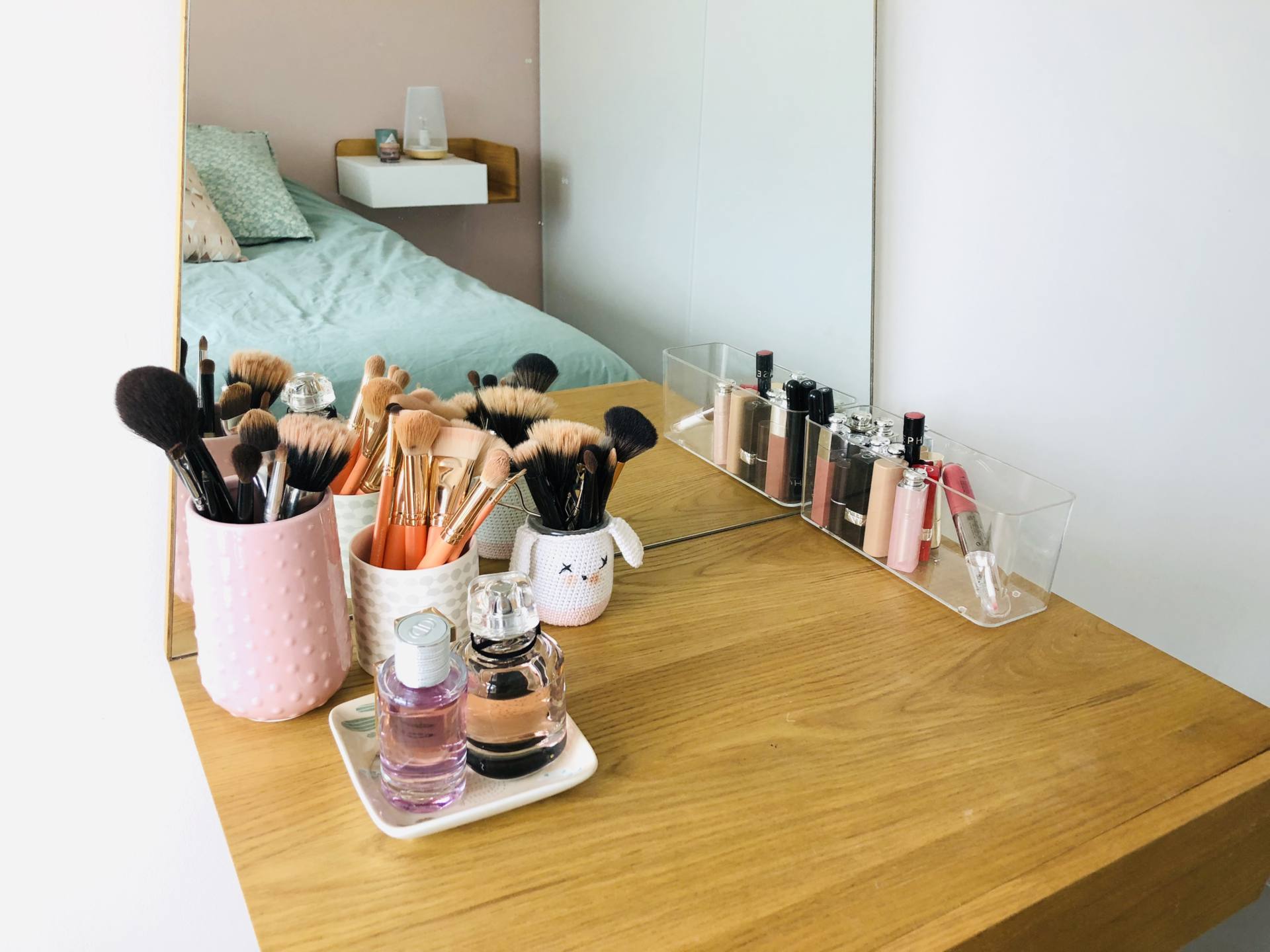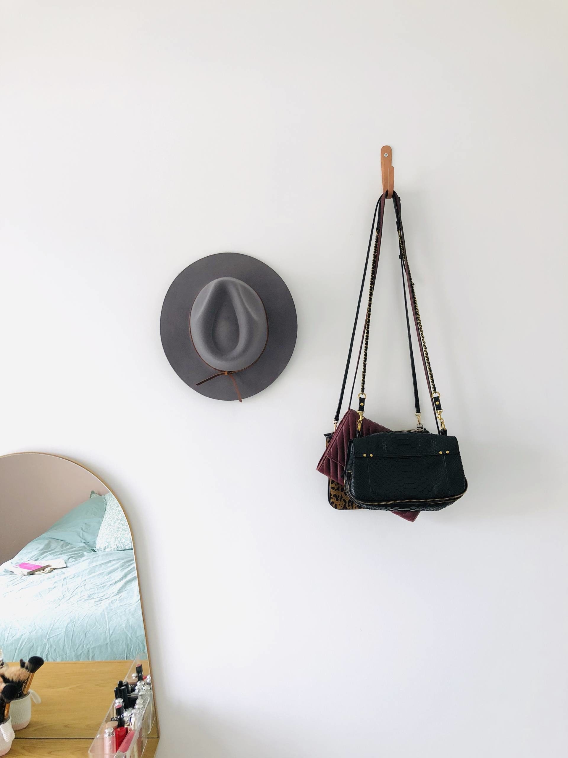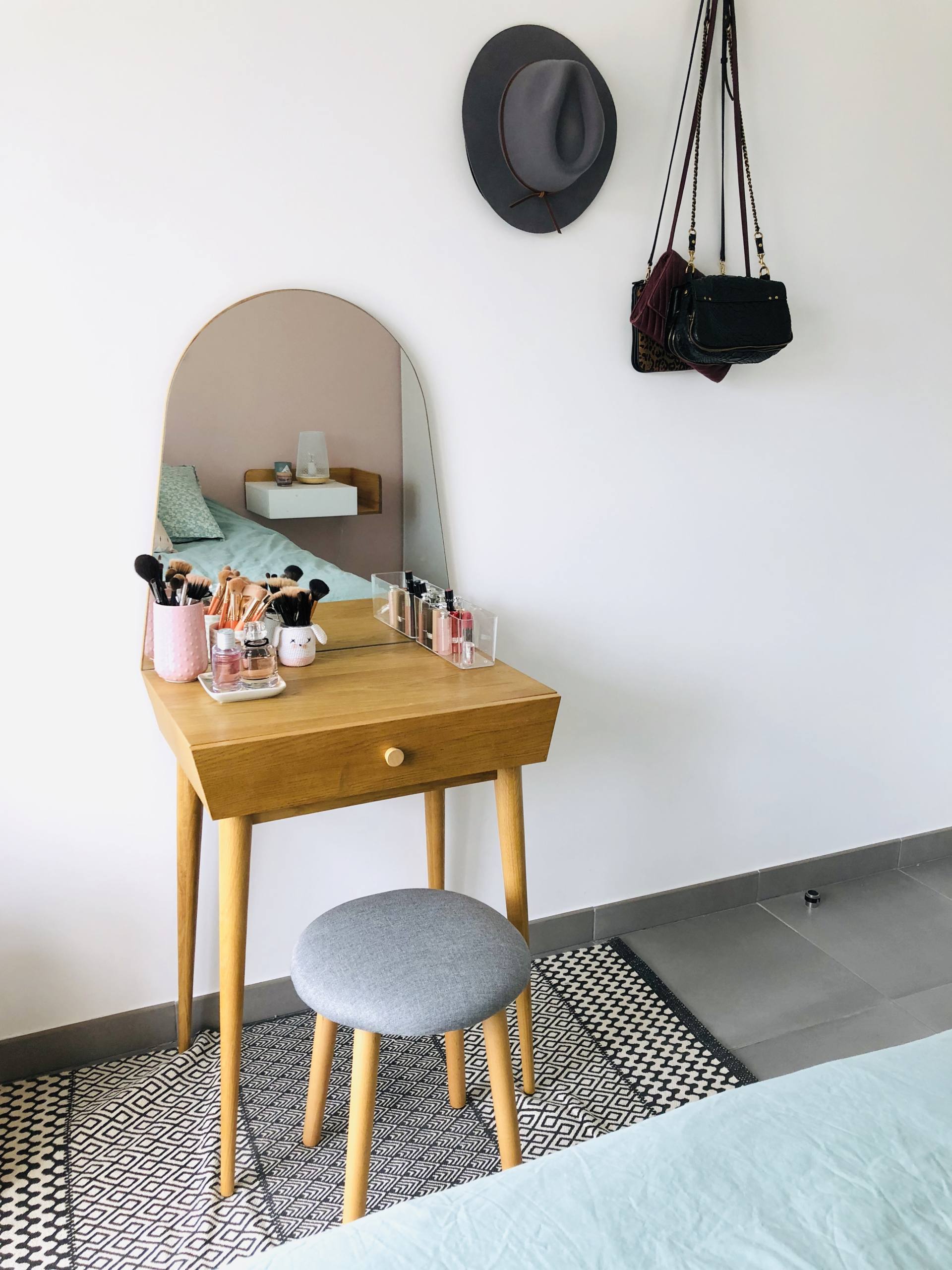 Changement de côté ! De l’autre côté, c’est plus classique et pas vraiment terminé, j’ai du mal à l’habiller ce côté-là ! On retrouve mon miroir que je veux changer ! Celui-ci vient de chez Fly mais j’en voudrais un autre bien plus large qui va aux moins jusqu’aux prises pour les cacher. Il y a aussi ma coiffeuse qui vient de chez La Redoute et qui est très pratique avec ce tiroir pour ranger mon maquillage. Je ne me souviens plus d’où vient le tabouret par contre ! Sur le plateau, on retrouve un pot rose qui est en réalité un vase Hema (similaire en blanc ici), un pot blanc et gris Maisons du Monde et un petit pot créer par une amie ! Juste à côté, je suspends mes chapeaux et sacs à mains à des clous. Du côté de la porte, toujours pour optimiser l’espace, j’avais proposé à Stéphane de mettre des tablettes au-dessus des portes, pour y poser des boîtes. J’avais vu cette astuce sur Pinterest et c’est juste génial. Par exemple, dans une boite se trouve nos sacs à dos/sacs weekends vides, et dans l’autre boite se trouve tout ce qui est relatif à la plage : foutas, serviettes, sac de plage, trousses et oreillers de plages. Mine de rien, c’est une grande place économisée dans nos placards. En parlant de placard, c’est Stéphane qui l’a fait.