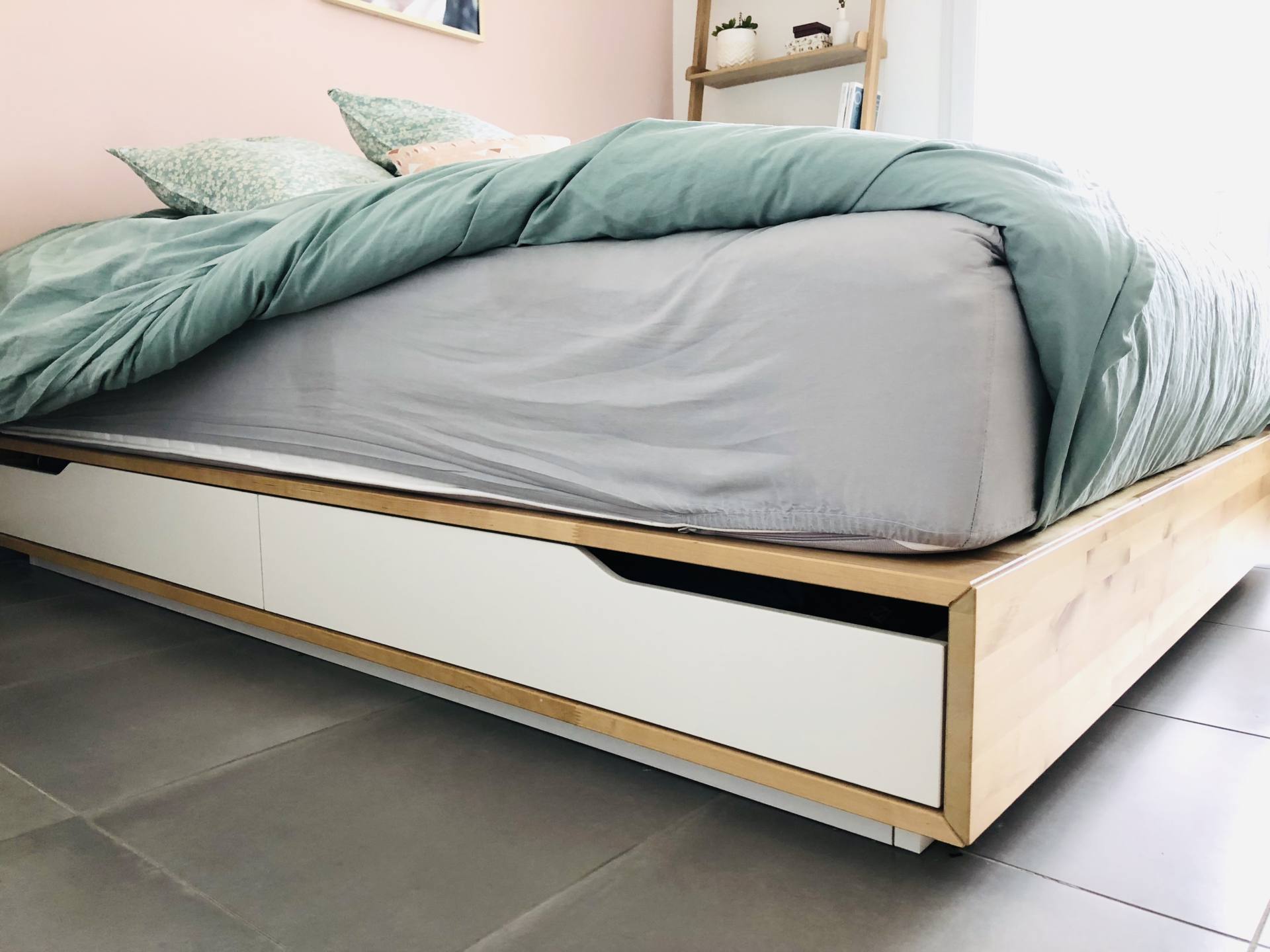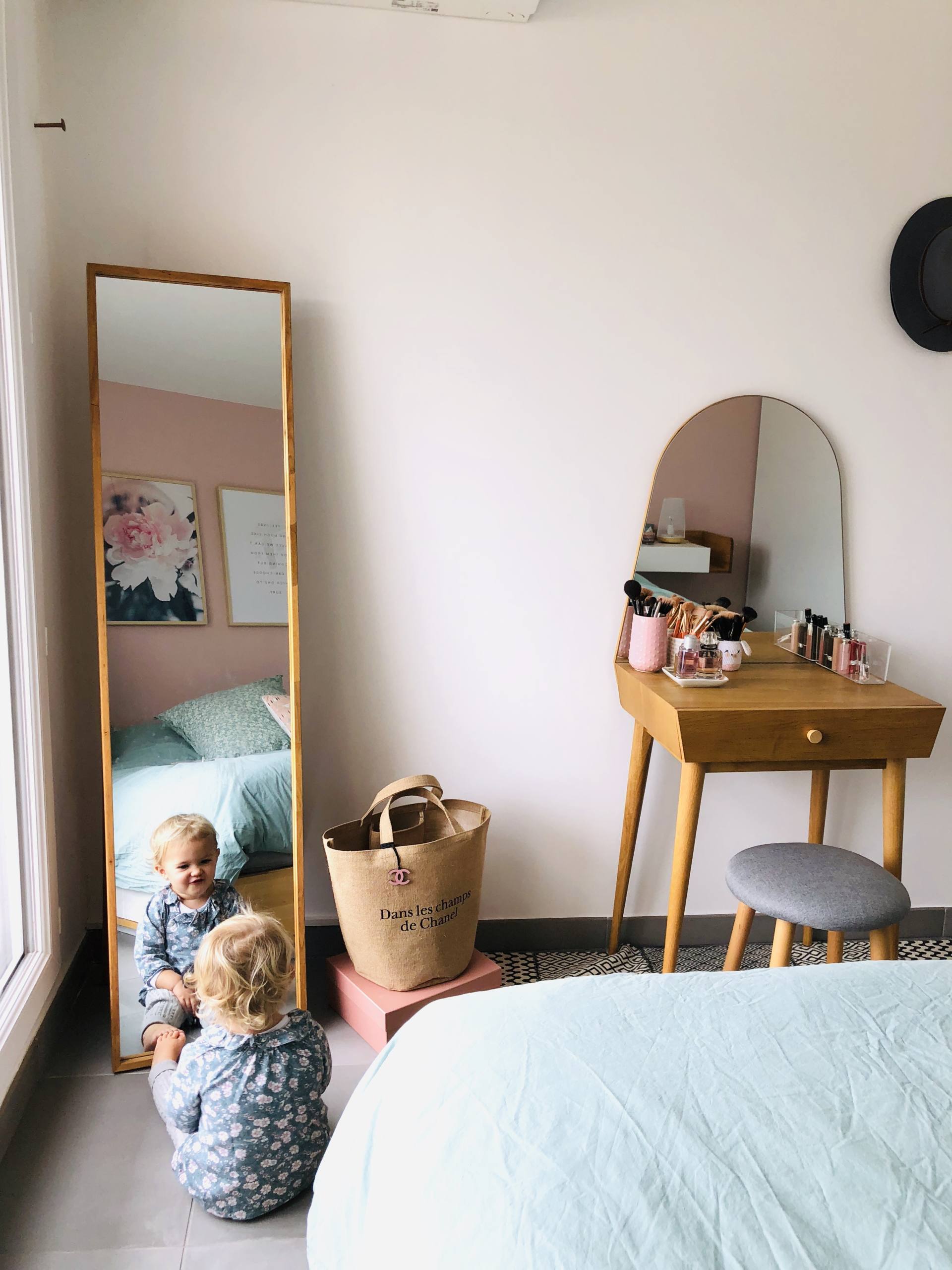 Element central de la chambre, notre lit ! On l’a changé en emménageant dans cet appartement. On voulait absolument un lit 160cms car c’est ce qu’on avait avant et on était habitué, on ne se voyait pas revenir au 140cms. Alors, c’est vrai que ça prend de la place, mais le confort avant tout ! On a trouvé celui-ci chez Ikea et ce qui nous a plu, c’est le coloris bois et blanc, et le fait qu’il y ait des tiroirs de rangement dessous. On savait que Louise arrivait et qu’on aurait plus de chambre d’amis ni de placard supplémentaire de rangements. Du coup, il fallait optimiser et cette place est précieuse. L’avantage de ce lit par rapport à un autre est que la structure du lit va jusqu’au sol, du coup, les tiroirs du lit sont comme si c’était dans un placard. La poussière ne passe pas et l’intérieur des placards reste propre. On a pas non plus à laver sous le lit. C’est l’idéal car souvent, les rangements sous les lits, ça prend la poussière ! On y range notamment tous nos vêtements de sport, et pour ma part, mes sacs à mains. Un des deux placards est aussi dédié à ce que je reçois pour le blog, qui est en attente de test, pour éviter que ça traîne ! En ce qui concerne la parure de lit, c’est en réalité tout dépareillé. Pour le drap-housse, on a un gris et un blanc, tous deux viennent de La Redoute, j’adore la matière, c’est doux et ils vieillissent très bien. Evidemment, le blanc, on le rachète de temps en temps car ça vieillit moins bien. La housse de couette vert amande est en lin et vient de chez Cyrillus. Les taies d’oreiller à motif floral viennent aussi de chez Cyrillus. J’aime beaucoup ce que cette marque propose comme linge de maison ! Elles n’existent plus mais il y en a de similaires ici. Je pense que les prochaines, ce seront celles-ci, je les adore. Juste au-dessus du lit, le lustre vient de chez Atmosphera, on y a vraiment trouvé de jolis luminaires. On doit installer les autres !