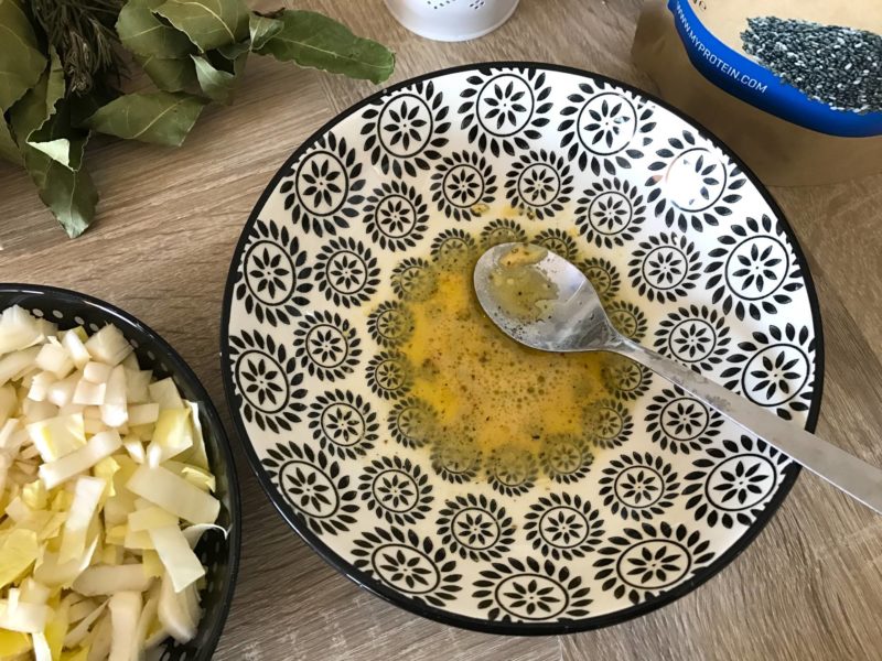 – Assaisonnement : une pointe de moutarde, une cs de vinaigre de noix, une cs d’huile d’olive, sel Herbamare, poivre