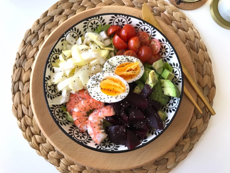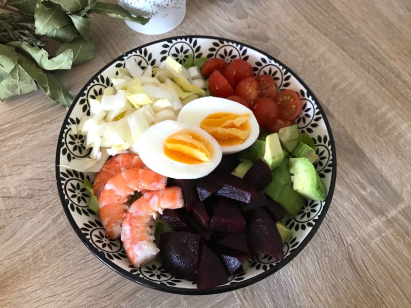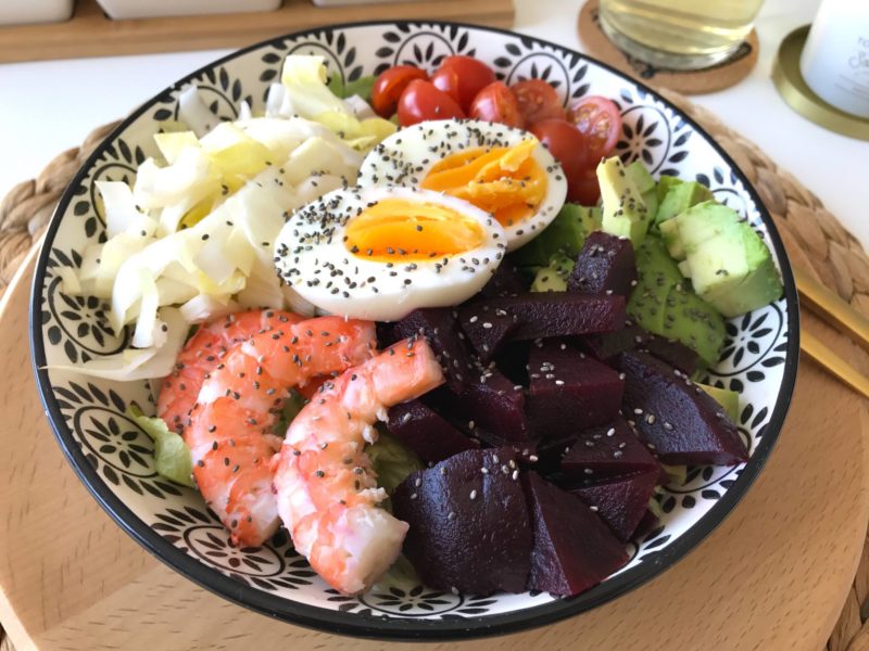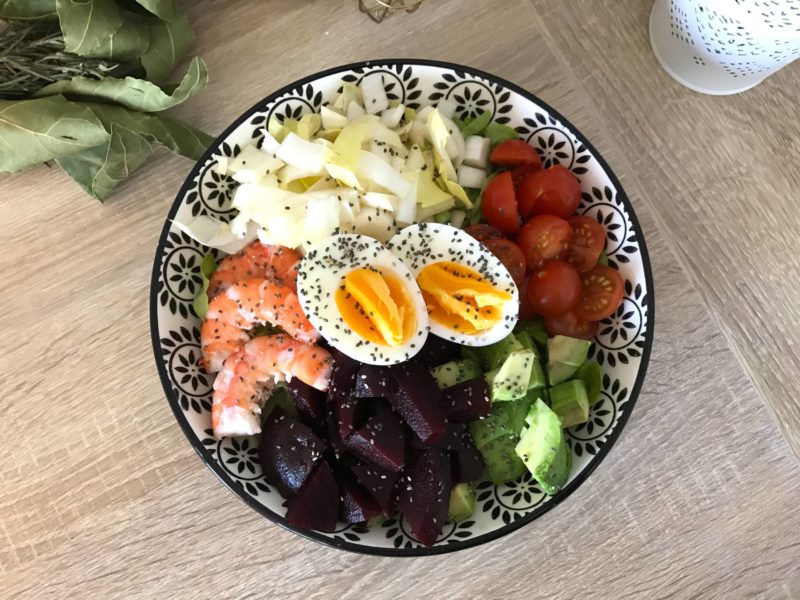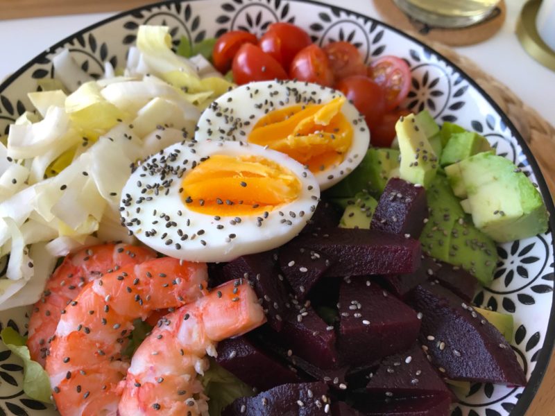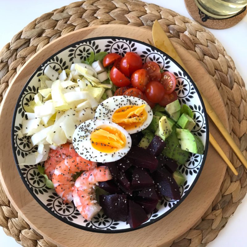 Résultat, retour en cuisine et petites salades sont au menu ! Cette semaine, j’avais envie de crevettes ! Vous êtes nombreuses à m’avoir demandé sur Snapchat si j’avais le droit ! Tant qu’elles sont bien cuites, a priori, pas de problèmes ! Je me suis donc fait une jolie salade pleine de couleurs avec des crudités, des crevettes et un oeuf quasi dur ! Je vous conseille de le faire mollet, c’est meilleur, mais pas idéal pendant la grossesse … Quelques graines en plus, et voilà une jolie salade post-fêtes !