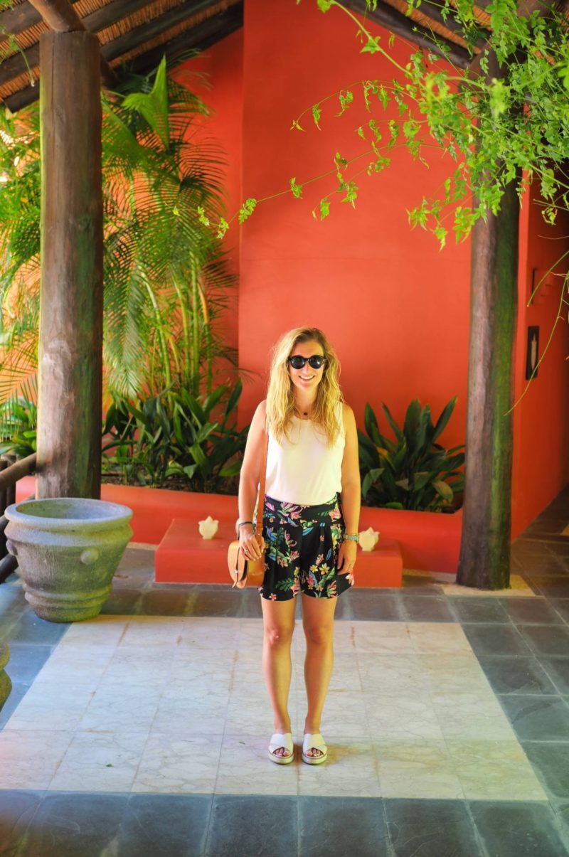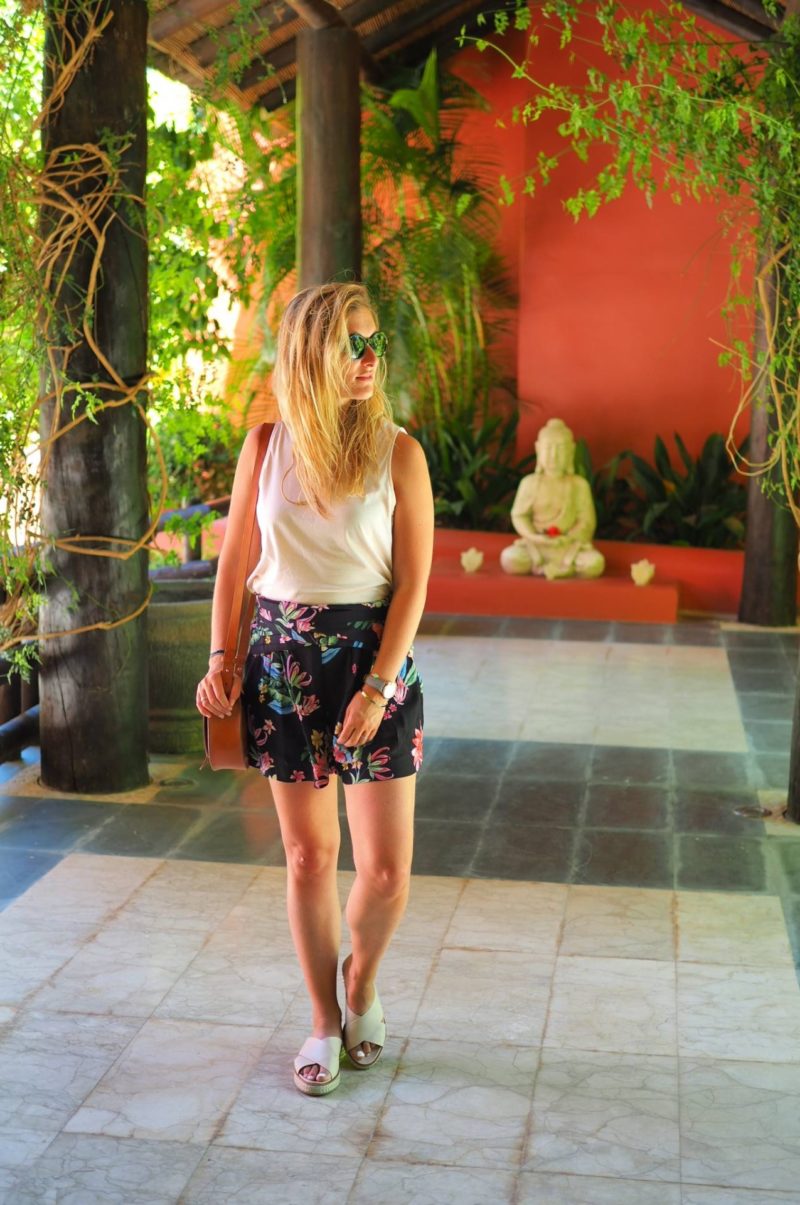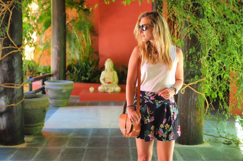 J’avais repéré un couloir extérieur très sympa dans l’hôtel. J’ai eu envie d’y retourner pour faire quelques photos. Ni une ni deux, on en a profité pour shooter le look du jour à cet endroit ! Je portais un petit short fleuri que j’ai acheté récemment et dont j’aime bien ce côté très fluide ! J’avais mon top préféré du moment avec un dos très ouvert donc très agréable à porter. Côté chaussures, je me suis bien habituée à mes mules compensées beige, je les adore, elles vont me suivre tout l’été, c’est sûr ! J’ai fini ce look avec quelques bijoux et mon sac chéri ! D’ailleurs, j’ai hâte de voir si de nouveaux coloris vont sortir pour l’automne.