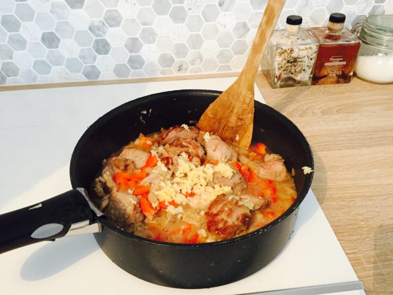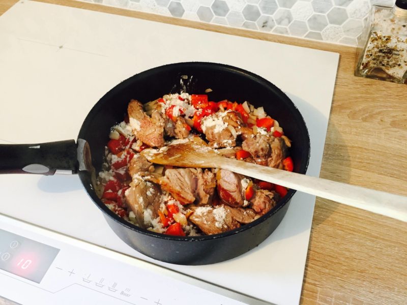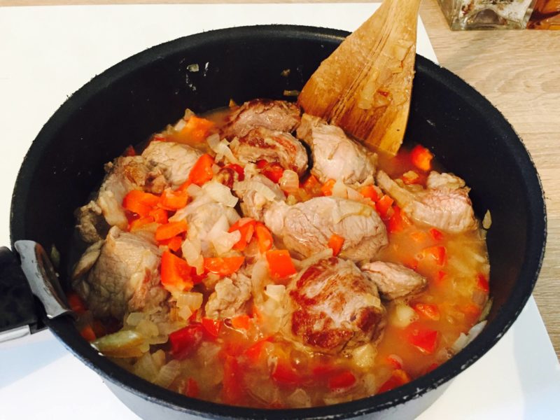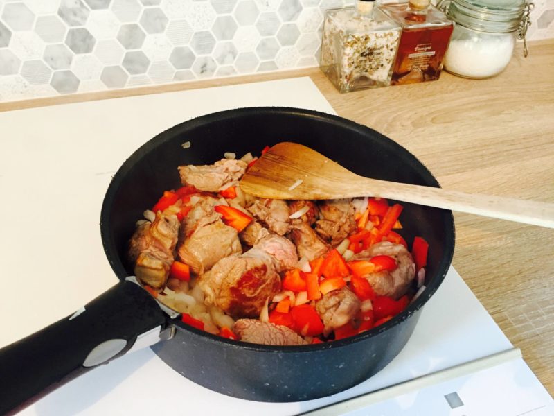 – Saisir les pièces de viande à feu vif et ajouter l’oignon et le poivron coupés en morceaux.