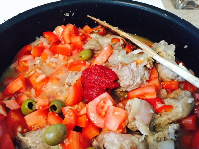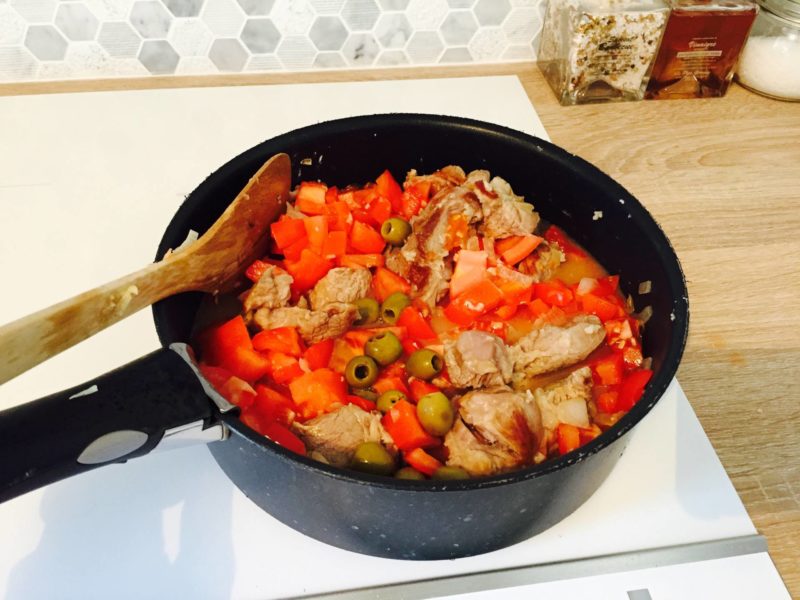 – Presser l’ail et le mettre dans la sauteuse, ajouter également les tomates coupées en dés et les olives.