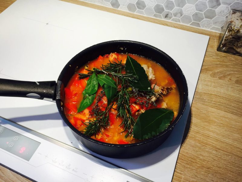 – Ajouter 25 cL d’eau, couvrir, baisser le feu et laisser mijoter pendant 1h.