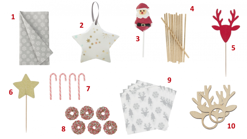 TABLE // 1. Nappe – 4€ / 2. Biscuit chinois – 1,25€ / 3. Sucette Père Noël – 1,25€ / 4. Pailles dorées – 1,75€ / 5. Pic apéro Renne (20) – 1€ / 6. Pic apéro Etoile (20) – 1€ / 7. Sucres d’orge (12) – 3€ / 8. Couronnes gourmandes – 2€ / 9. Serviettes – 1,50€ / 10. Ronds de serviette bois (2) – 3,50€ //