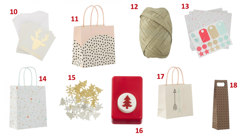 CADEAUX // 1. Pochettes cadeaux (6) – 1,50€ / 2. Masking Tape doré – 3€ / 3. Cordon blanc et doré – 1,50€ / 4. Pochettes cadeaux (6) – 1,50€ / 5. Mini-boîtes (6) – 2€ / 6. Tampons – 2,50€ / 7. Rouleaux de papier cadeau (3) – 1,50€ / 8. Boîte – 2€ / 9. Etiquettes (6) – 1,50€ / 10. Cartes (5) – 1€ / 11. Sac à pois – 0,50€ / 12. Ruban – 1€ / 13. Kit emballages cadeaux – 2€ / 14. Sac étoiles pastel – 0,75€ / 15. Confettis – 1,50€ / 16. Perforatrice sapin – 1,25€ / 17. Sac flèches – 0,50€ / 18. Sac pour une bouteille – 0,75€ //