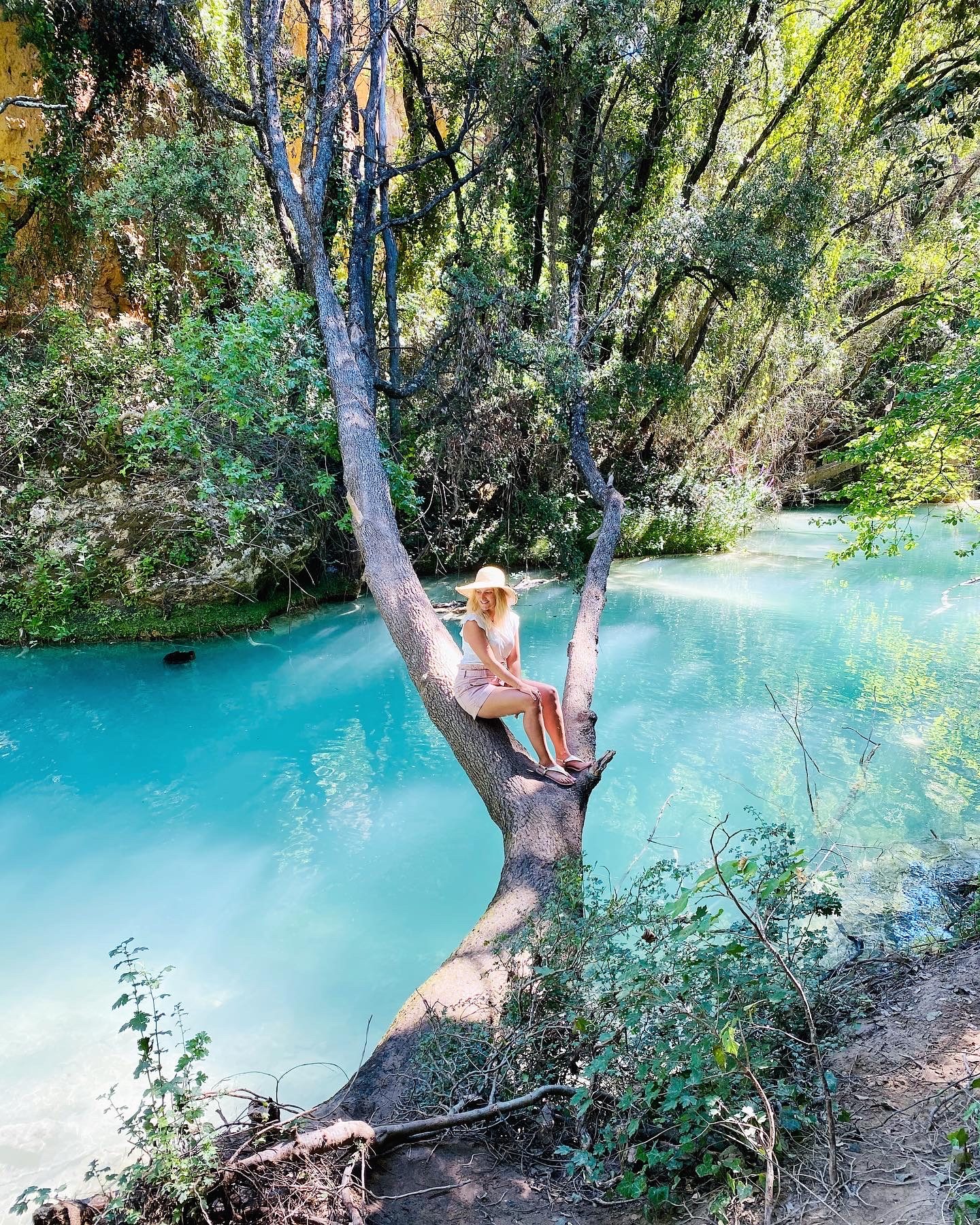 Pour cette deuxième ballade, elle dure environ 30-35 minutes aller-retour. Au début, c’est du goudron. Ensuite, on entre sur une partie chemin avant d’attaquer une descente de pas mal d’escaliers en pierre. C’est irrégulier et glissant donc je vous recommande de bonnes baskets, et plutôt un porte-bébé si vous avez un tout-petit ! Une fois en bas, vous ne pouvez pas rater le belvédère qui surplombe cette magnifique cascade se déversant sur une petite étendue d’eau turquoise. C’est vraiment sublime et inattendu ! Je ne pensais pas trouver un si beau spot mais effectivement, on est vraiment aux portes du Verdon car ce bleu est vraiment le même que celui du lac de Sainte-Croix !
