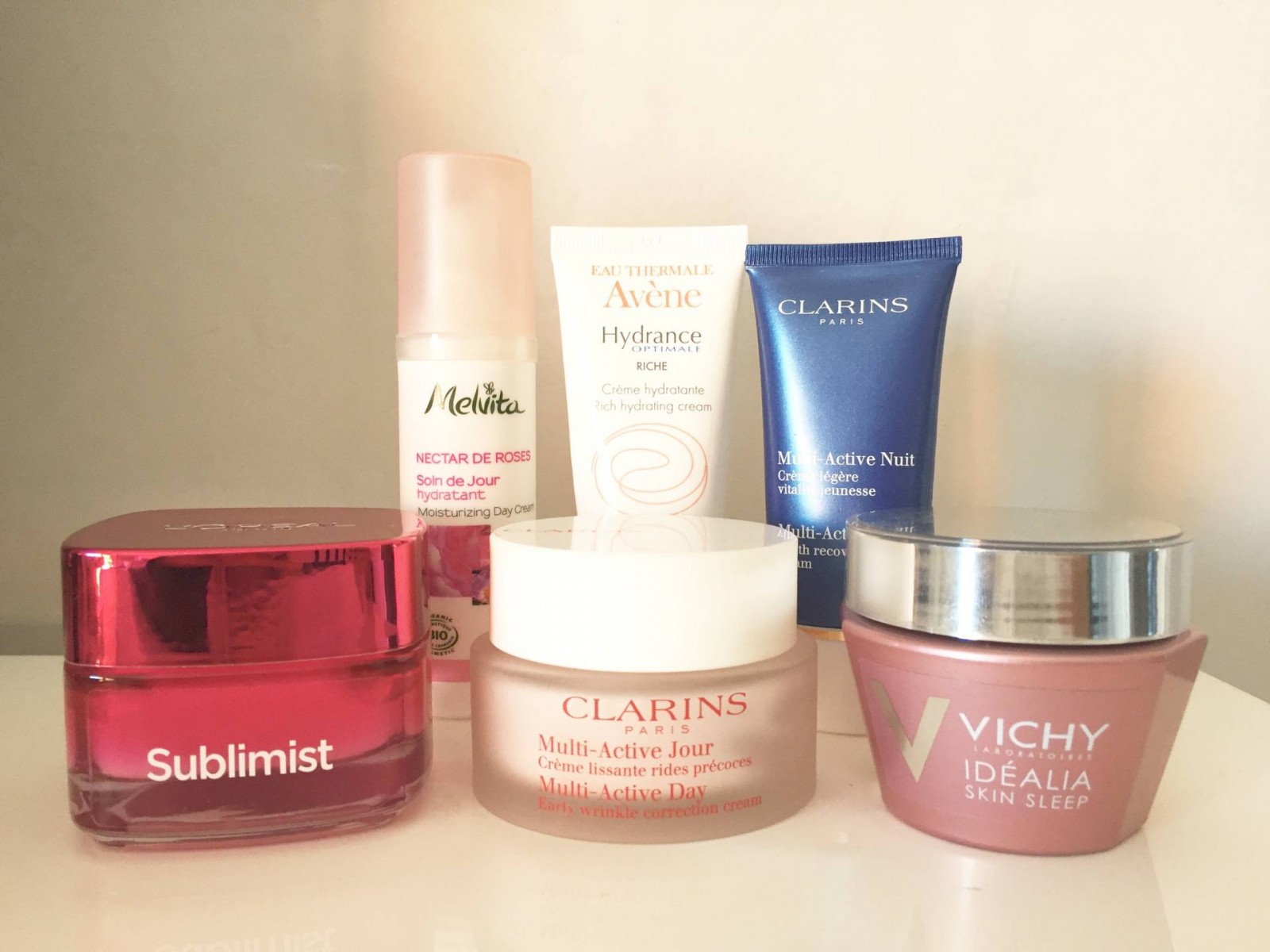 – Clarins Multi-Active Jour et Nuit pour “toutes peaux”. J’utilise ces crèmes depuis 5-6 ans et j’en ai toujours été hyper satisfaite. Les + : texture parfaite, odeur neutre, effet anti-ridules top, bonne hydratation. Les – : le prix évidemment, une soixantaine d’euros !