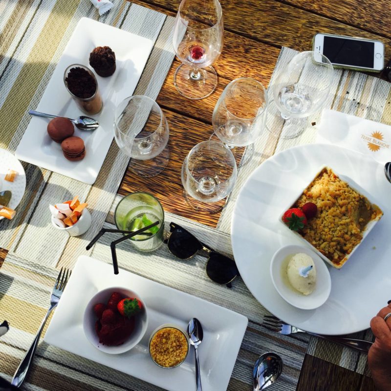 Dès l’arrivée, le décor est planté, il y a une magnifique arche “Terre Blanche” qui ne donne qu’une envie : entrer ! Et là, on découvre un magnifique domaine sans fin. Il y a un hôtel, plusieurs restaurants, un spa sublimissime, un golf, et le tout, dans un espace très vert où on se gare à l’entrée pour ensuite ne se déplacer qu’en voiturette de golf. Et nous, on a adoré pour le côté ludique, le côté vacances et le côté écologique évidemment ! On a commencé par déjeuner dans le restaurant “Les Caroubiers”. Si vous pouvez, au moment de la réservation, demandez à être face à la vue sur le golf, c’était vraiment canon ! On peut choisir ses plats à la carte ou optez pour une formule. Pour 39€ par exemple, il y a une formule entrée à la carte, suggestion du jour et dessert à la carte. Pour ma part, j’ai goûté la soupe de poissons en entrée qui était divine. J’ai continué avec la suggestion du jour : un filet de vive et sa fricassée de légumes. Et enfin, j’ai pris une terrine façon cheesecake avec son sorbet fruits rouges. Tout était vraiment délicieux ! Mes parents ont opté pour le saumon avec une crème légère en entrée, mon papa a pris un suprême de volaille rôti et légumes de saison. Le jus avait un goût de folie ! Et en dessert, ils ont choisi un café gourmand tout chocolat et un crumble de fruits d’été. On a eu de la chance, le soleil était au rendez-vous pour nous offrir un panorama très sympa ! Et ils nous ont même mis une petite bougie sur le dessert de ma maman !