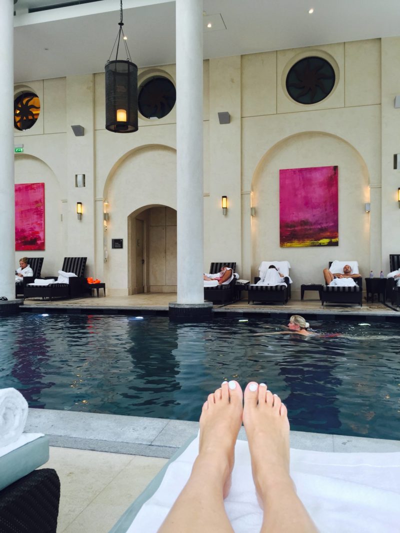 Après un superbe déjeuner, direction le spa Terre Blanche pour se détendre un peu ! J’y pensais depuis le début de la semaine tellement que j’avais envie de me poser un peu. Et on a été vraiment gâtées ! A peine entrées, on voit tout de suite la superbe piscine face à nous. Elle est immense, entourée de colonnes façon thermes romains, et au loin, le jacuzzi extérieur qui bouillonne. Vite, on file se changer et en plus d’être bien reçues, le plaisir commence dès les vestiaires avec une lumière tamisée et une vraie notion de service. Tout est à disposition pour s’habiller et pour se doucher, se nettoyer le visage et se re-préparer pour repartir. On a profité de l’espace spa pendant près de deux heures, sur des transats face à la piscine, dans la piscine puis dans le jacuzzi. J’adore les jacuzzis extérieurs où on sent la fraîcheur extérieure qui contraste avec la chaleur de l’eau. Le lieu est vraiment exceptionnel. Le sauna, le hammam et le laconium sont juste à proximité donc c’est vraiment idéal. J’aurais presque pu y rester la journée, voire même la semaine !