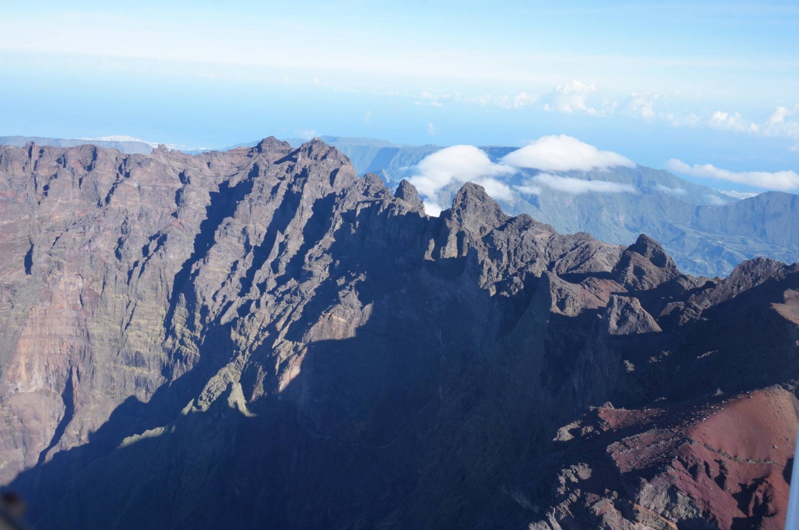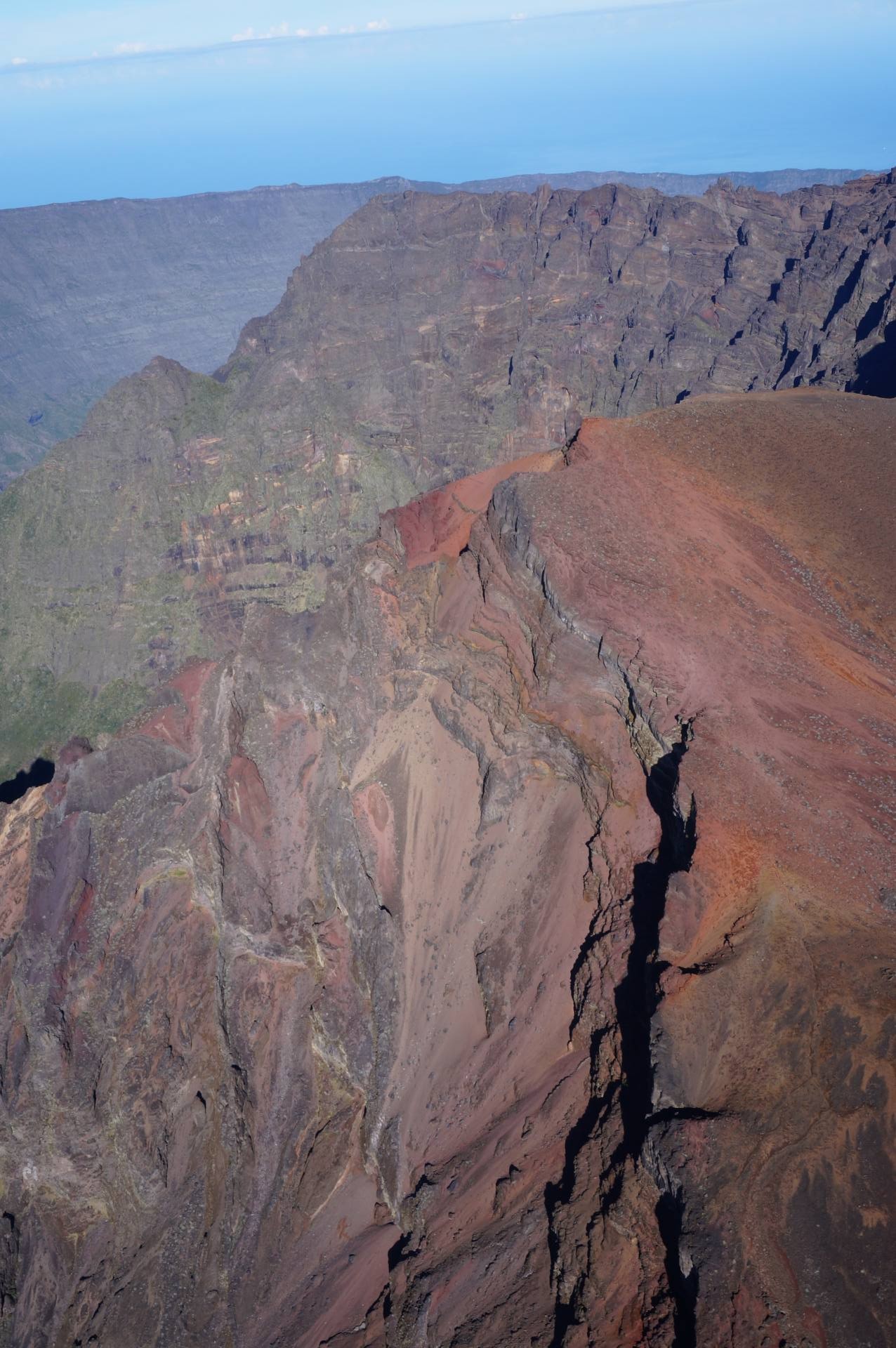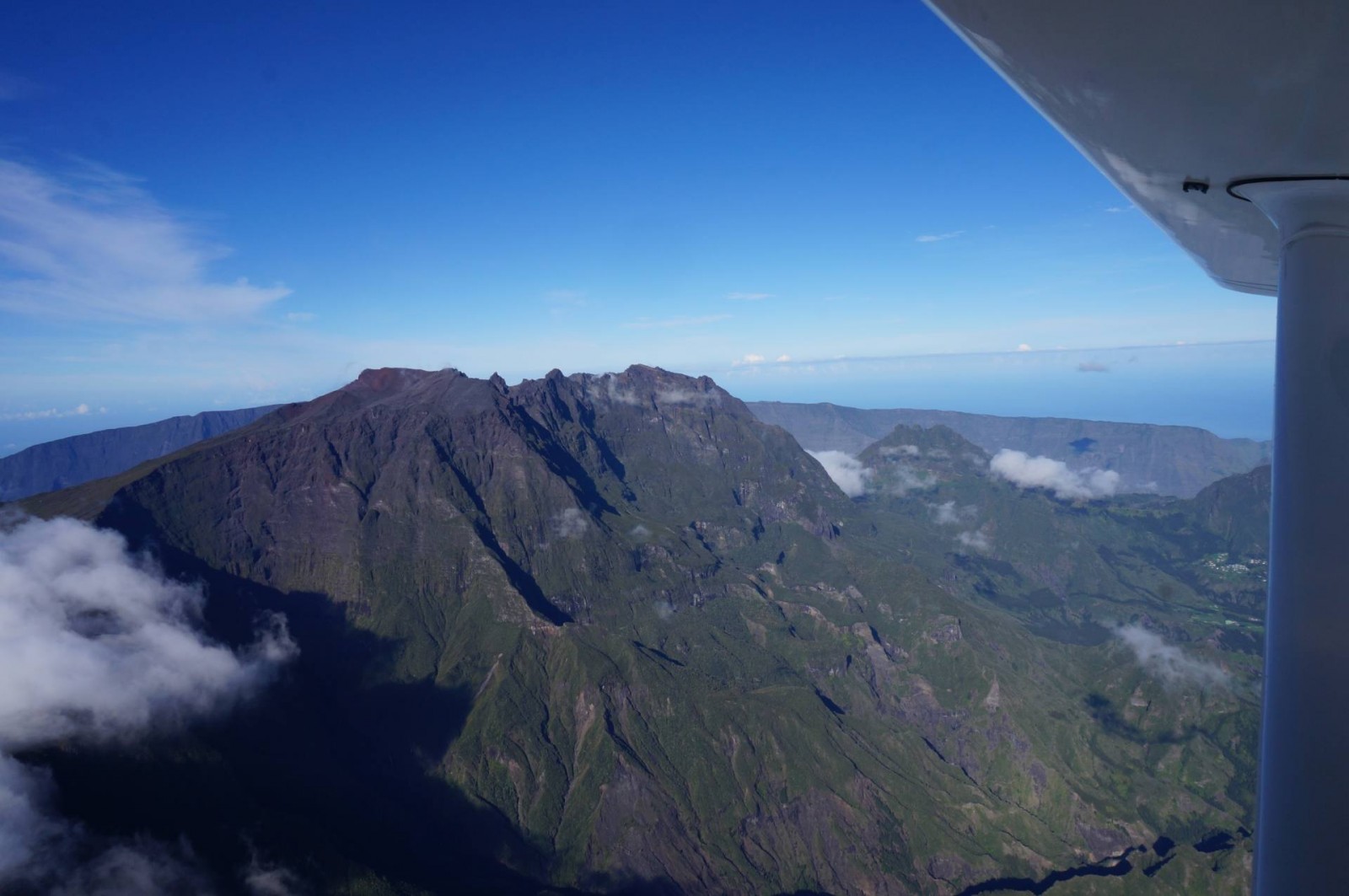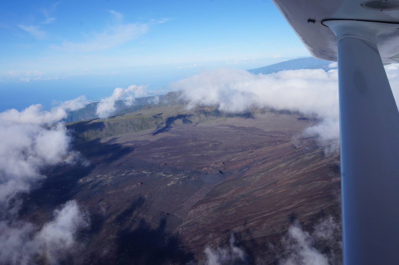 Le survol a commencé évidemment par Saint Pierre puis la Grande Anse. Ensuite, nous avons longé Petite Île et Saint Joseph avant de rentrer dans les terres. Les nuages étaient déjà arrivés dans ce coin là donc j’ai pu voir de belles mers de nuages. Et d’un seul coup, le Piton de la Fournaise est apparu. J’avais l’impression d’apercevoir un sol lunaire, c’est vraiment impressionnant. Après deux tours autour du cratère, j’ai pu l’apercevoir et même voir plusieurs petits cratères annexes. C’est vraiment une très belle vue. Nous avons ensuite commencé à remonter en direction des cirques. On a d’abord survolé la Plaine des Sables et commencé à apercevoir le Piton des Neiges. C’est un ancien volcan qui n’est plus actif mais qui a permis, par son activité passée, de créer les trois cirques : Mafate, Cilaos et Salazie.