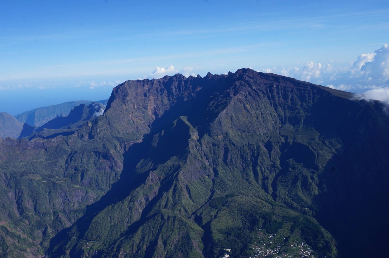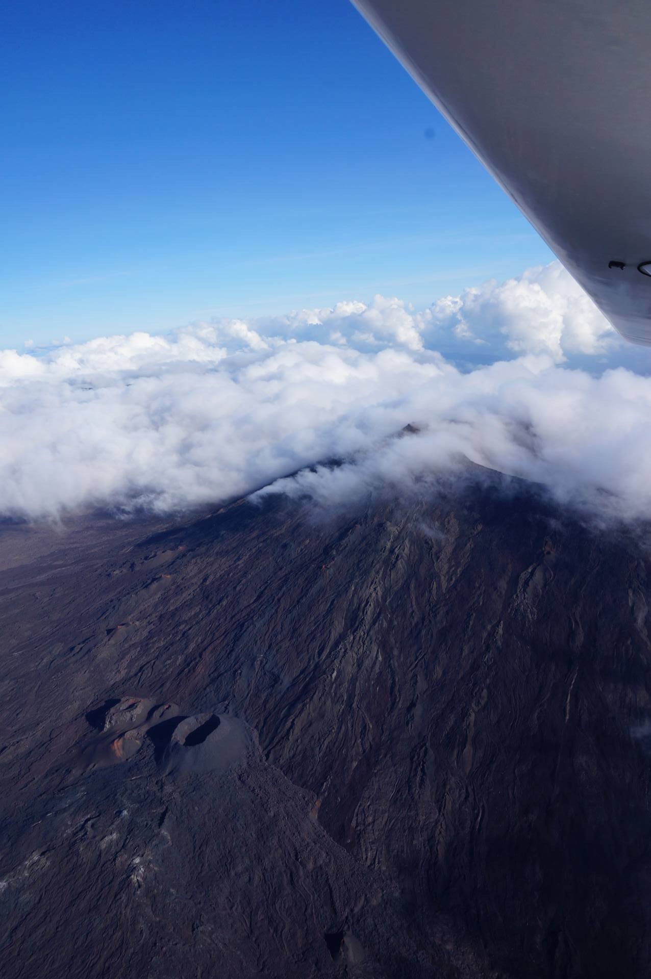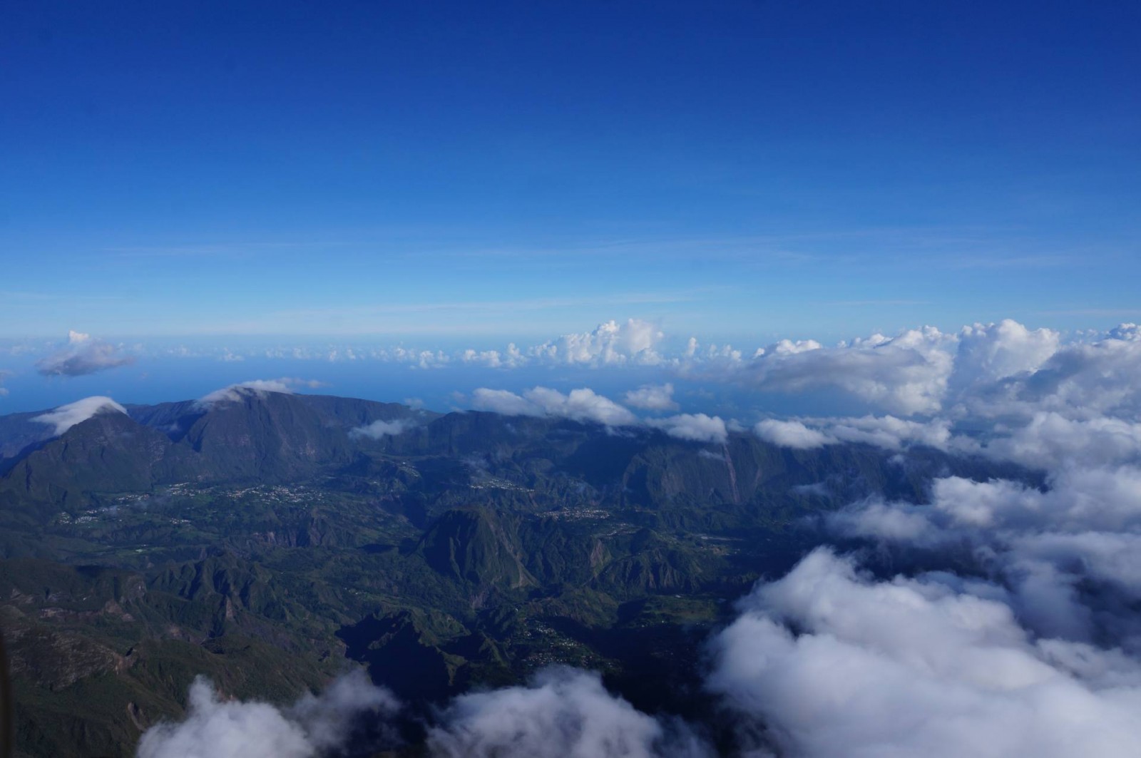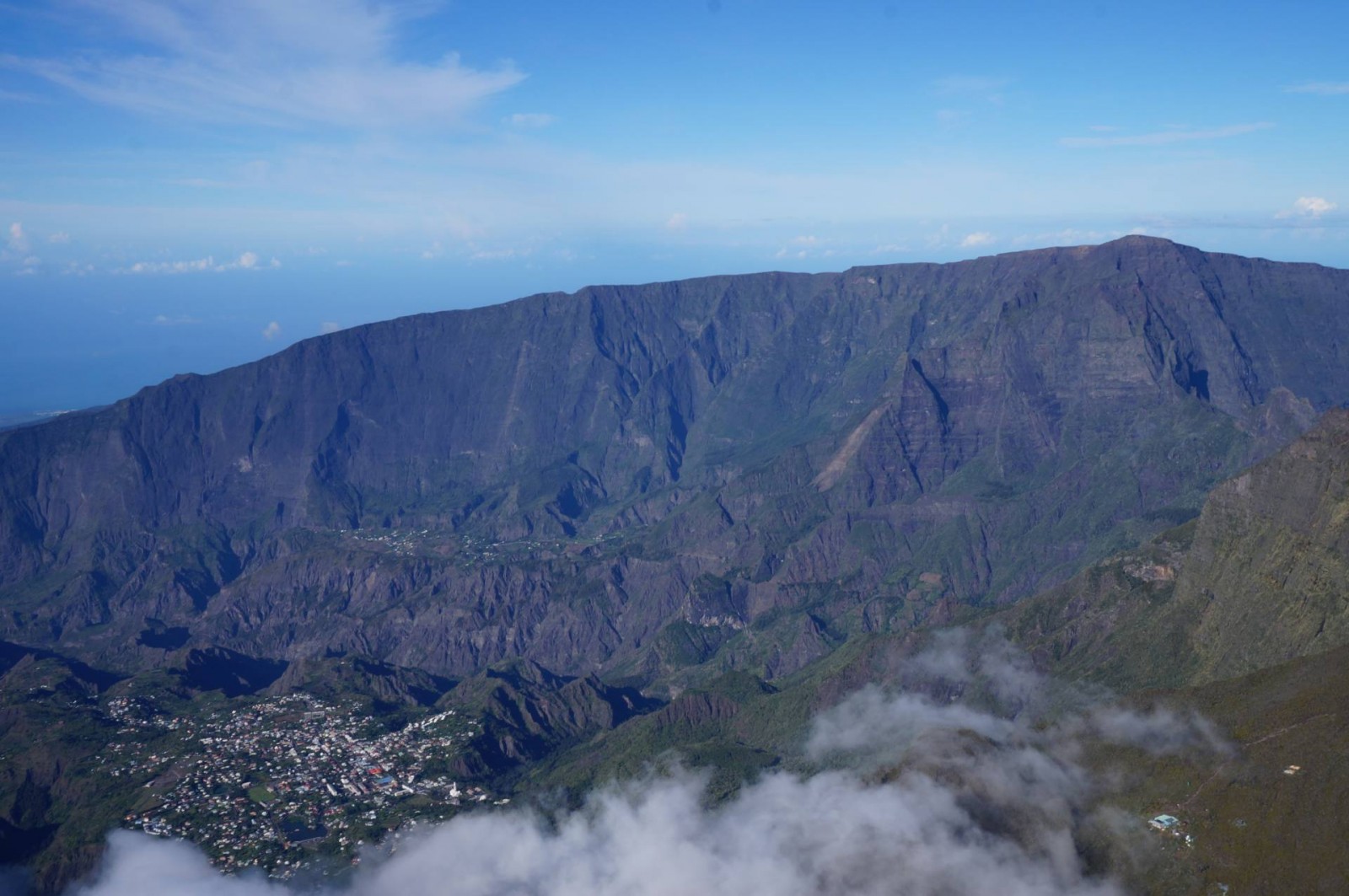 Le survol a commencé évidemment par Saint Pierre puis la Grande Anse. Ensuite, nous avons longé Petite Île et Saint Joseph avant de rentrer dans les terres. Les nuages étaient déjà arrivés dans ce coin là donc j’ai pu voir de belles mers de nuages. Et d’un seul coup, le Piton de la Fournaise est apparu. J’avais l’impression d’apercevoir un sol lunaire, c’est vraiment impressionnant. Après deux tours autour du cratère, j’ai pu l’apercevoir et même voir plusieurs petits cratères annexes. C’est vraiment une très belle vue. Nous avons ensuite commencé à remonter en direction des cirques. On a d’abord survolé la Plaine des Sables et commencé à apercevoir le Piton des Neiges. C’est un ancien volcan qui n’est plus actif mais qui a permis, par son activité passée, de créer les trois cirques : Mafate, Cilaos et Salazie.
