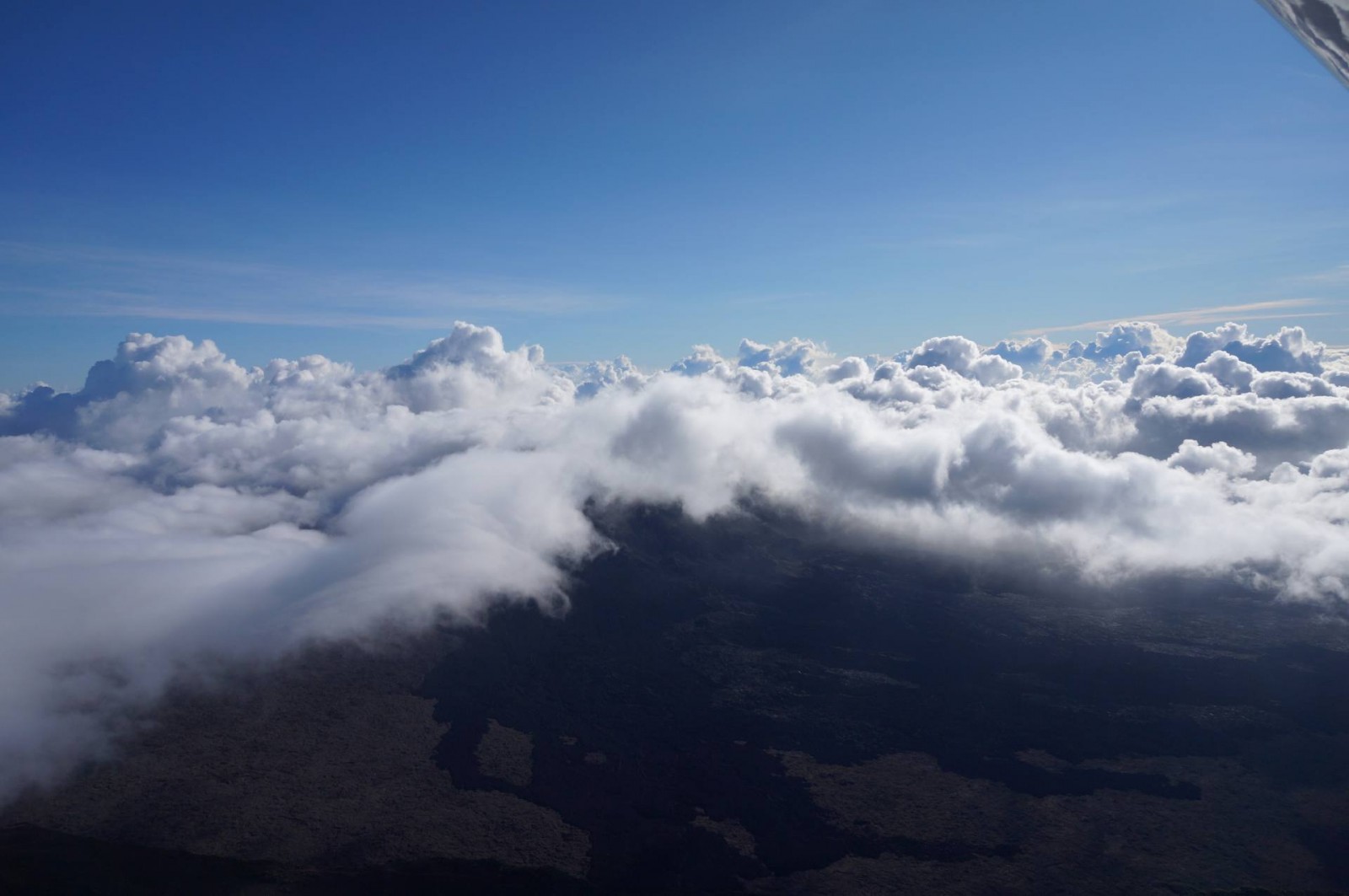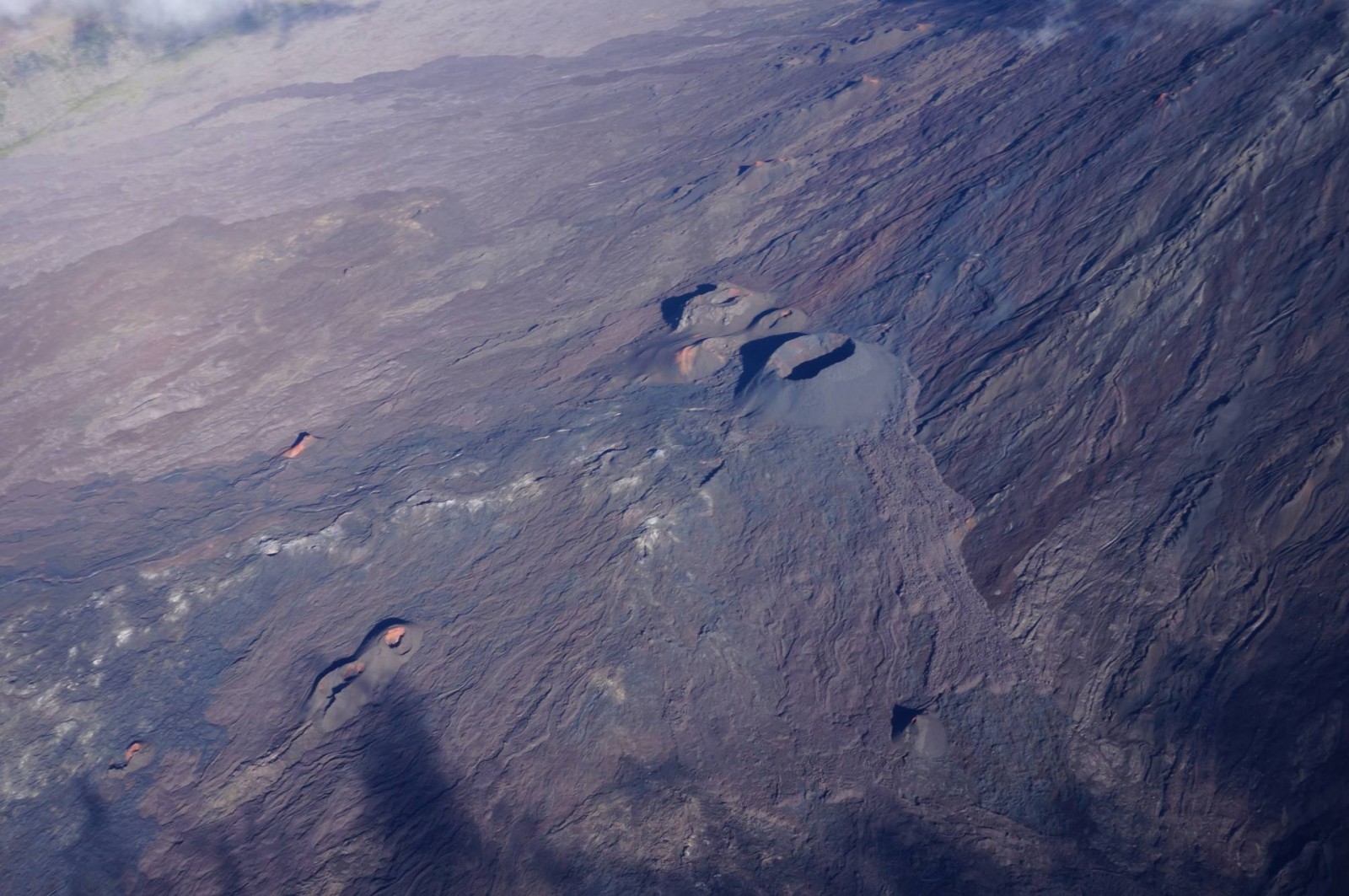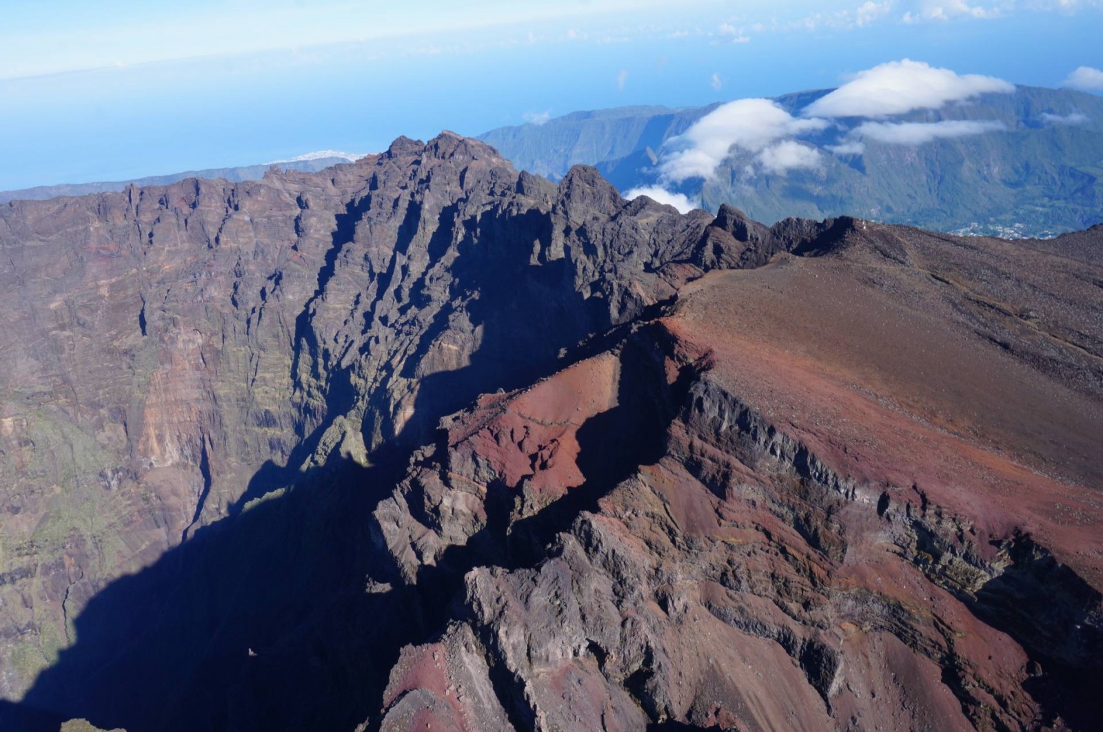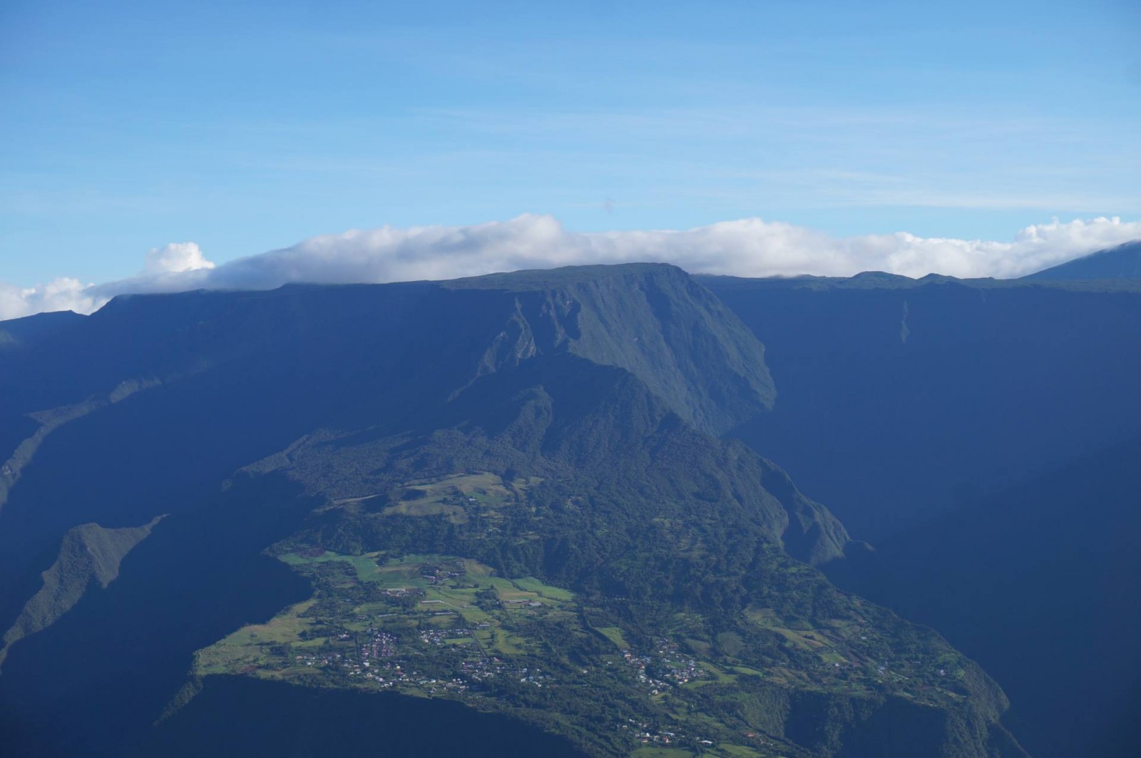 Le survol a commencé évidemment par Saint Pierre puis la Grande Anse. Ensuite, nous avons longé Petite Île et Saint Joseph avant de rentrer dans les terres. Les nuages étaient déjà arrivés dans ce coin là donc j’ai pu voir de belles mers de nuages. Et d’un seul coup, le Piton de la Fournaise est apparu. J’avais l’impression d’apercevoir un sol lunaire, c’est vraiment impressionnant. Après deux tours autour du cratère, j’ai pu l’apercevoir et même voir plusieurs petits cratères annexes. C’est vraiment une très belle vue. Nous avons ensuite commencé à remonter en direction des cirques. On a d’abord survolé la Plaine des Sables et commencé à apercevoir le Piton des Neiges. C’est un ancien volcan qui n’est plus actif mais qui a permis, par son activité passée, de créer les trois cirques : Mafate, Cilaos et Salazie.