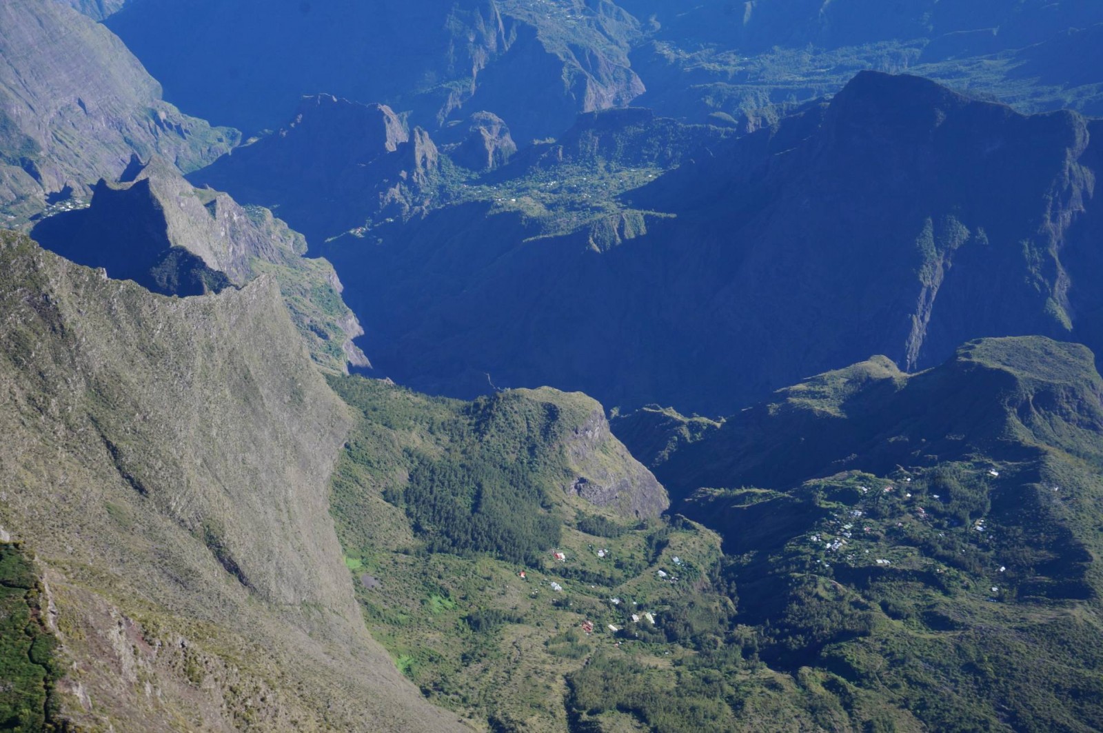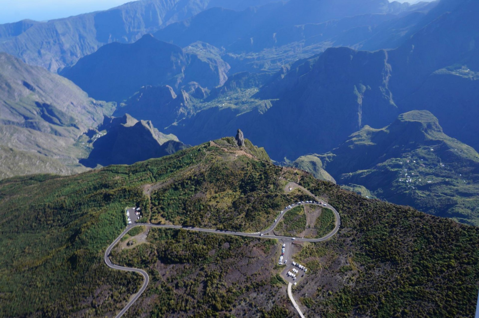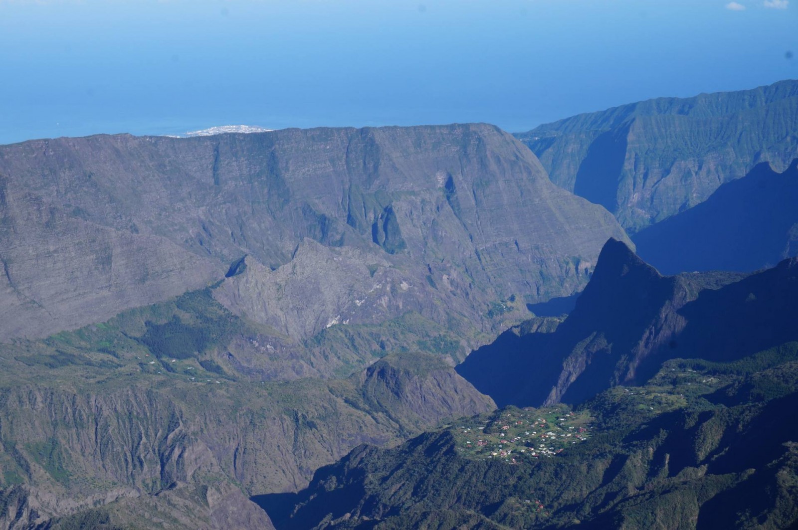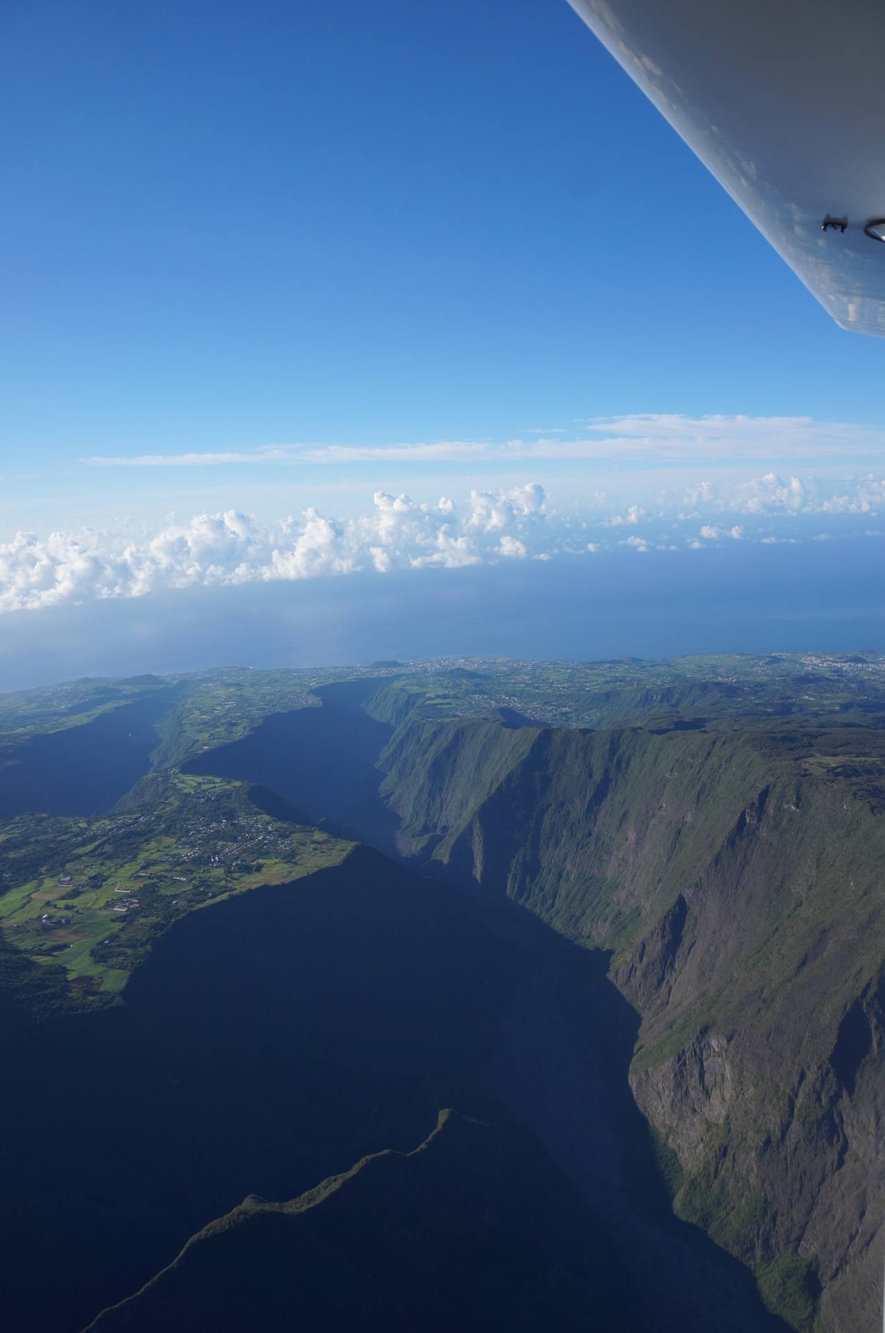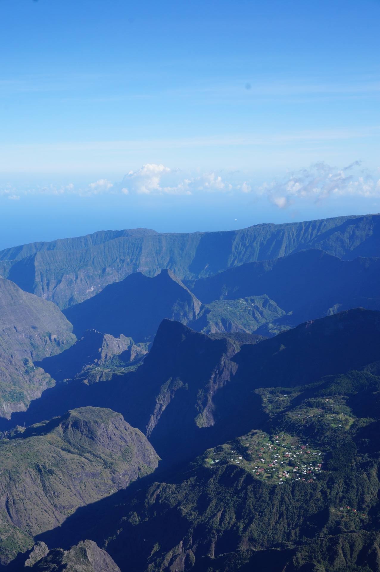 On a d’abord survolé le cirque de Salazie avec notamment le Trou de Fer. Il s’agit en fait d’un trou de verdure avec des cascades au centre. J’ai eu de la chance, il y avait plein de nuages autour, et juste un espace pour voir le Trou de Fer. Ensuite, on a contourné le Piton des Neiges une première fois à distance, puis une deuxième fois beaucoup plus proche. La vue était très dégagée et ensoleillée, on a bien pu voir les couleurs au sommet. On a naturellement dévié vers le cirque de Cilaos où l’on voit très nettement le village de Cilaos qui semble être de loin le plus grand, tous cirques confondus. Avec les différences de relief, l’avion bougeait pas mal, mais Johnny de Zen Altitude, toujours plein d’humour me dit que tout va bien, que la chute n’est pas prévue pour tout de suite ! Cap sur Mafate ! C’est le cirque que j’avais envie de visiter en randonnée mais on avait vu la météo et je savais que ce ne serait pas possible. Du coup, j’avais trop hâte de le survoler après l’avoir déjà vu depuis le Maïdo dont je vous ai parlé ici. C’est vraiment impressionnant de voir à quel point les villages sont coupés du monde. Il n’y a aucune route pour accéder à ces villages et le relief est vraiment important. D’ailleurs, là aussi, on a eu quelques trous d’air mais Johnny m’a bien rassurée !