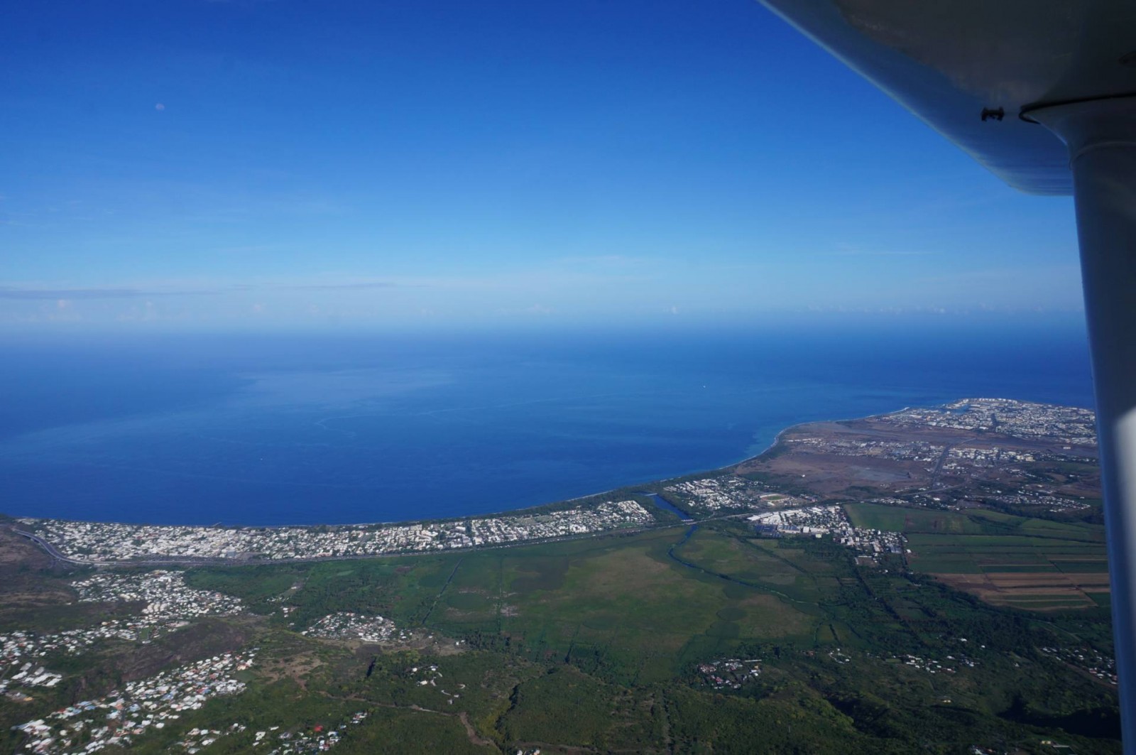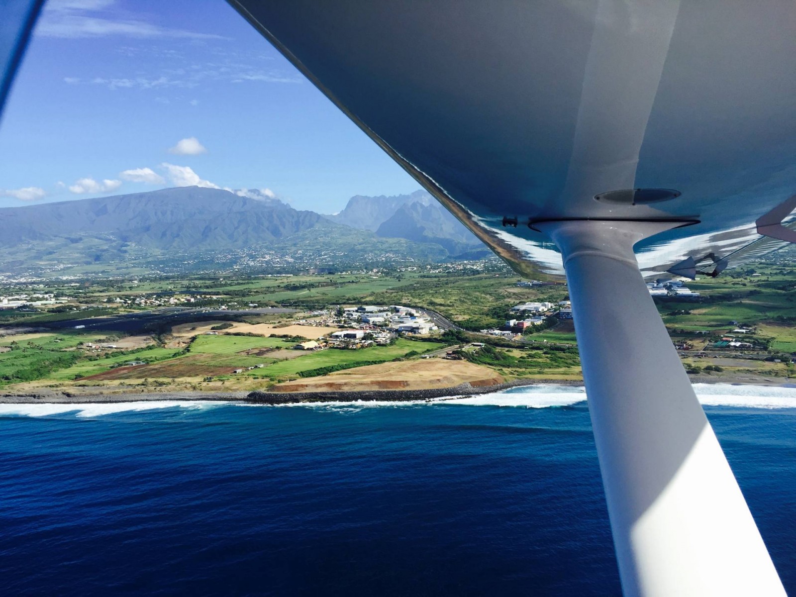 Après les cirques, nous sommes passés au-dessus du Piton Maïdo puis de la Crête des Orangers. Avant de partir en direction de Saint Denis, nous avons aperçu le village de Dos d’Âne. Nous n’avons pas survoler Saint Denis dans ce vol mais ce n’était pas ma priorité. Nous avons directement volé parallèlement au lagon pour profiter des sublimes couleurs du ciel et de l’océan. Le tour se boucle avec le survol de la Baie de Saint Paul, Boucan Canot, Saint Gilles, L’Ermitage, Trou d’Eau, Saint Leu, la Pointe au Sel et la Pointe du Diable. Au bout d’1h40 de plaisir, l’atterrissage se profile. Johnny me dit que c’est en général très doux. Je suis donc plutôt tranquille et j’ai eu bien raison car j’ai pas senti grand chose !