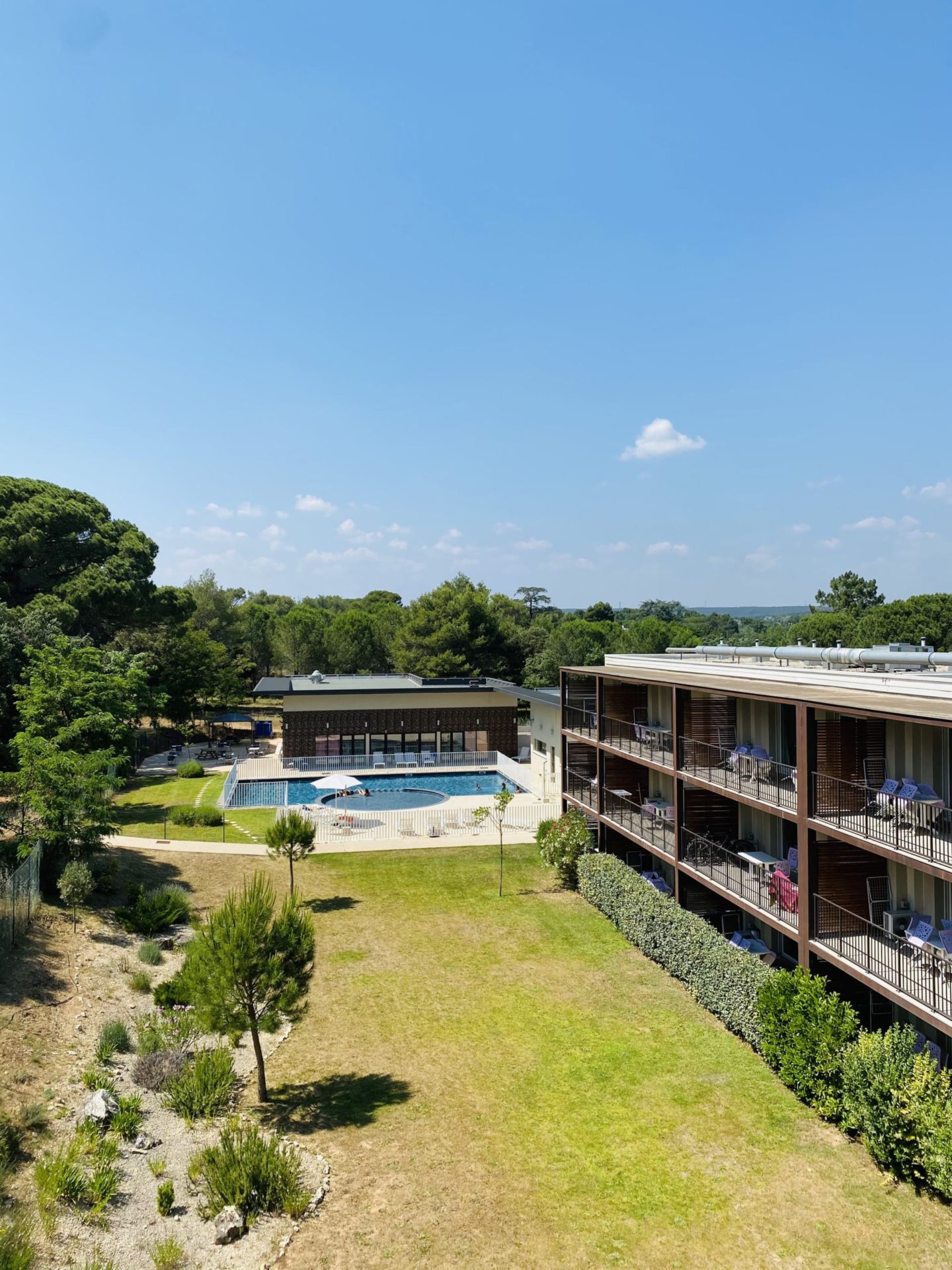 Comme je vous l’ai dit plus haut, j’ai logé dans la résidence Vacancéole Pont du Gard. Je ne connaissais pas auparavant et on a tous trouvé la résidence et le logement supers. Déjà, elle est parfaitement située par rapport aux points attractifs des environs (quelques minutes du Pont du Gard, 25 minutes d’Uzès, 30 minutes de Nîmes). Dès l’arrivée, malgré qu’il s’agisse du jour de fermeture de la résidence, on a récupéré les clés rapidement et facilement. Direction le dernier étage pour découvrir notre ascenseur. Notre appartement est vraiment top pour partir à plusieurs car il y a 2 chambres et 2 salles de bains, une pièce à vivre et une grande terrasse avec vue sur la garrigue ! C’est calme, bien insonorisé et l’appartement était très bien équipé : climatisation, vaisselle, lave-vaisselle, etc … J’ai aussi apprécié qu’il y ait un kit ménager pour avoir juste ce qu’il faut et éviter d’acheter pour pas grand chose. La décoration est simple et épurée et les rangements sont assez grands. C’est un appartement fonctionnel et idéal pour venir avec sa famille ou des amis. Au centre de la résidence, il y a une piscine très bien sécurisée et très agréable, avec des transats pour se poser un peu. Elle a une partie pataugeoire pour les petits ou pour se prélasser, et une partie baignade classique. Pour les petits-déjeuners, il y a la possibilité de les récupérer le matin entre 8h et 10h. Si comme nous, vous êtes là que pour 2-3 jours et que vous n’allez pas faire de courses, c’est pratique et c’est pas souvent le cas dans les résidences de vacances. Par contre, si vous préférez faire par vous même, il y a tout ce qu’il faut : cafetière, frigo, vaisselle …