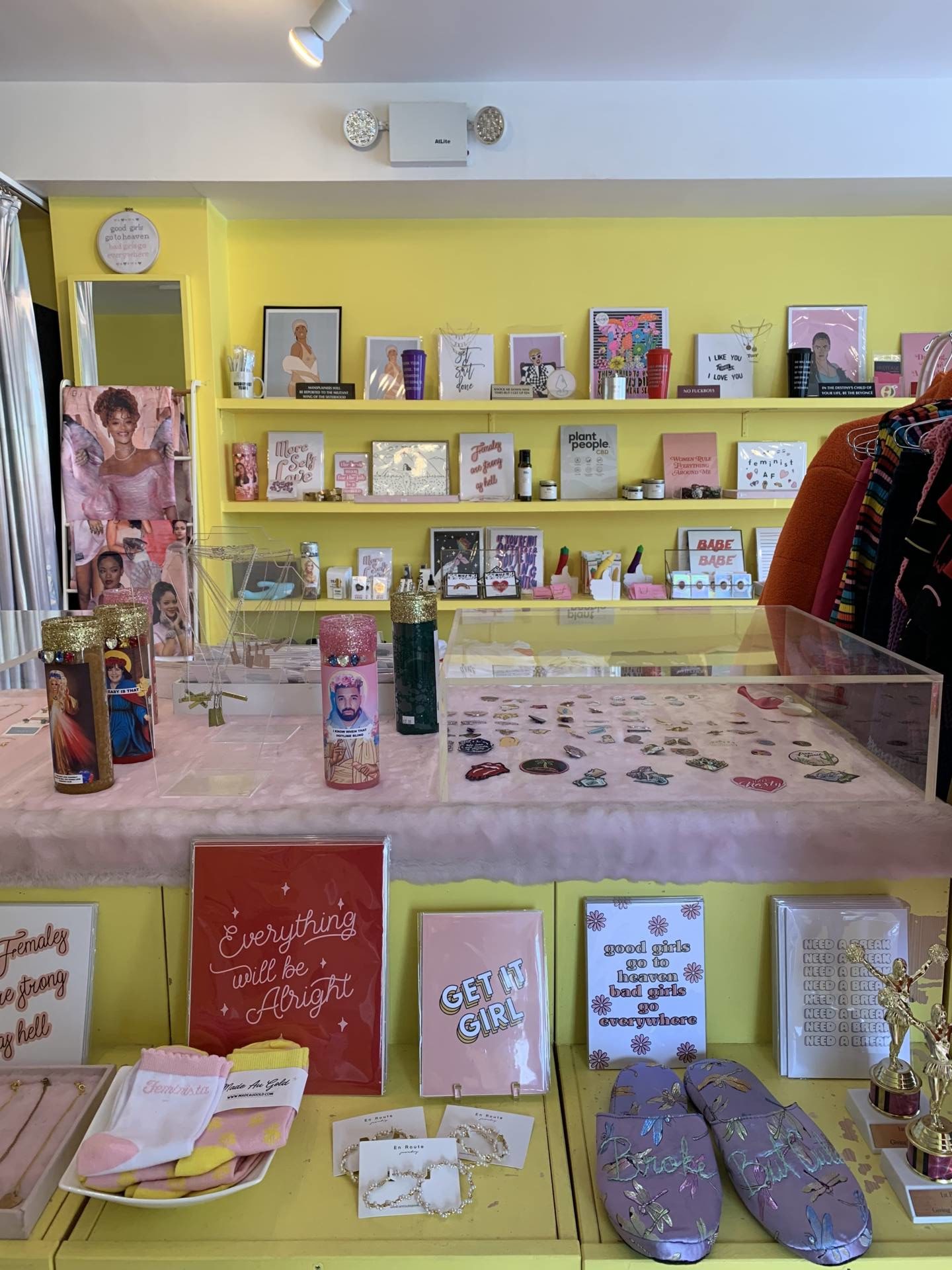 - B : C’est le temps des féministes ! Il faut entrer pour comprendre ! Affiches au slogan féministes, pins, bijoux, petits accessoires type notebooks, tee-shirts, etc … J’ai trouvé un set de 2 pins avec les noms Thelma et Louise. Je ne vais garder que celui marqué Louise pour mettre sur la veste en jean du printemps de ma Louise d’amour !