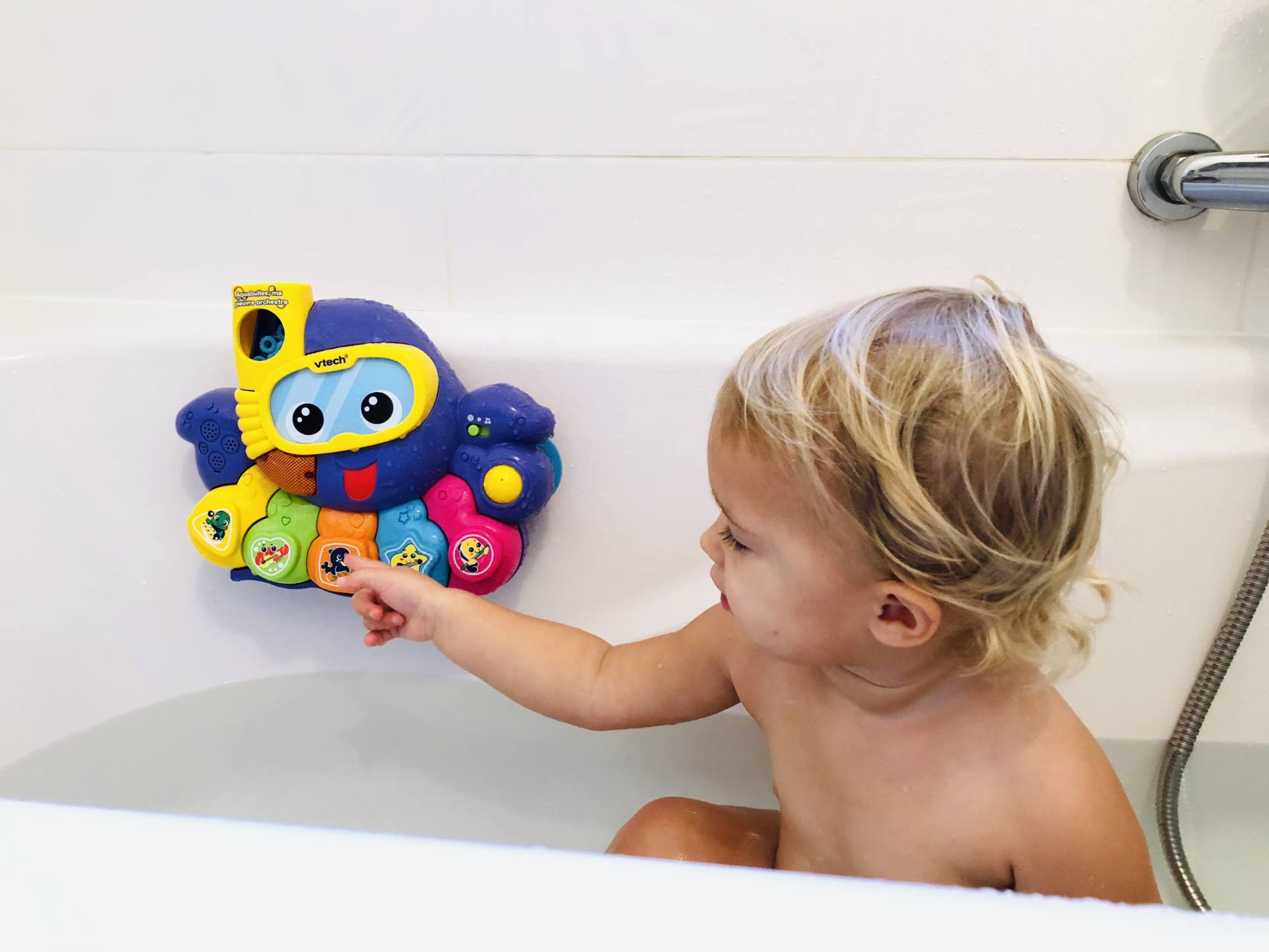 Quand on rentre à la maison, on garde le même rituel que pendant la semaine pour ne pas la dérégler et pour garder le rythme, sauf si on sort évidemment ! Souvent, ça commence par un repas pas trop tardif qu’elle cuisine avec moi. Je la pose sur le plan de travail et c’est un moment où elle commence à manger ce qu’on prépare. Comme ça, on enchaîne son rituel, et nous, après, on peut profiter de la soirée tranquillement. Après avoir mangé, elle joue un peu le temps qu’on range tout et qu’on prépare son bain. Le bain, elle ADORE ça ! Elle dit toujours non quand on lui dit qu’il faut sortir. Je mets suffisamment d’eau pour qu’elle s’amuse et depuis peu, je crois qu’on ne pouvait pas lui faire plus plaisir ! On a changé un peu ses jouets de bain dont elle commençait à se lasser. Et vu qu’elle adore les bulles (on a au moins 4-5 pots + une grande tige qui fait de grosses bulles, vous vous rappelez, ce qu’elle a voulu à la fête foraine à la pêche au canards !), on a pris l’Aquabulles de chez Vtech ! Alors là, je vous le dis, c’est le festival tous les soirs dans le bain ! En fait, ça se ventouse sur une des parois de la baignoire. C’est multi-activités, il y a un piano, des comptines, des bruits d’animaux, c’est très varié et évolutif. Mais ce qui lui plait le plus, c’est qu’en fait, ça représente une pieuvre qui fait des bulles ! Et à partir de là, on ne peut plus du tout la sortir du bain. On a carrément bien fait de changer ses jouets parce que finalement, elle ne jouait plus du tout avec les anciens, et là, c’est encore une occasion d’apprendre les animaux, de chanter. Ca me fait halluciner tout ce qu’elle mémorise en ce moment ! Et souvent, au moment de se sécher, c’est trop mignon, elle dit “Au r’voir Bulles !”. Je fonds !