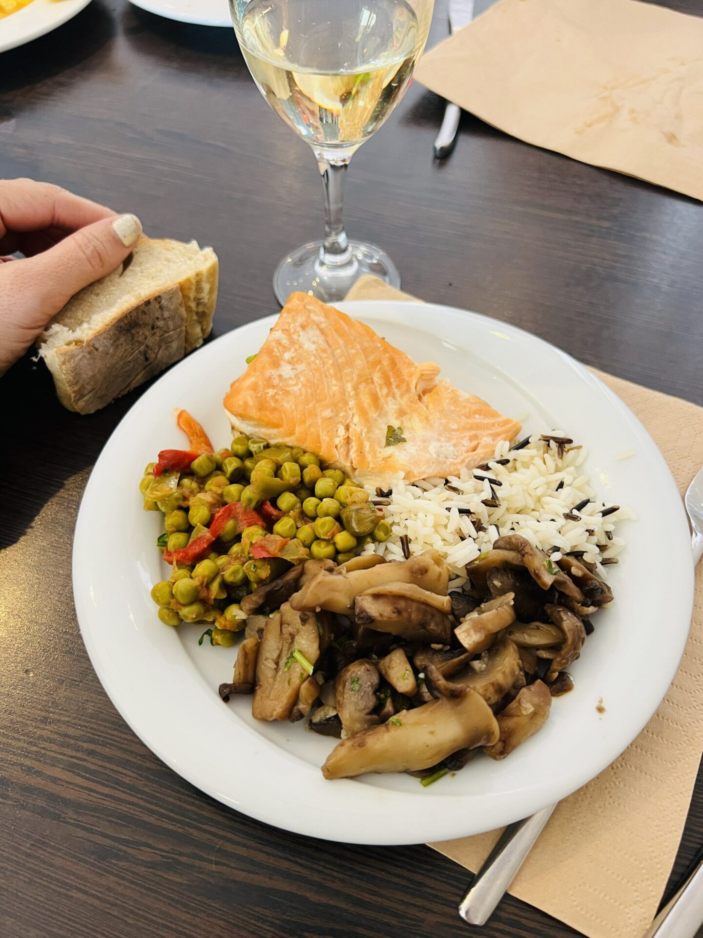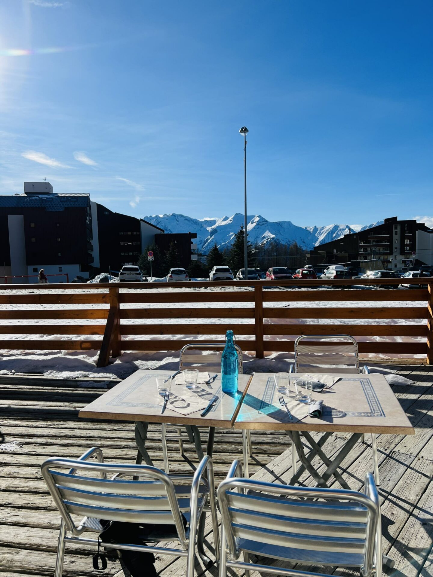 Côté repas, c’était donc une formule all inclusive. J’avais peur car j’aime bien manger et c’est vraiment un point important en vacances. Nous sommes des épicuriens, j’adore découvrir des restaurants, des adresses, mais je dois dire que quand on part une semaine au ski avec des enfants qui sont aux cours de ski toute la semaine, ils sont claqués le soir, et ils ont besoin de faire de bonnes nuits pour repartir en forme le lendemain. J’aime aussi bien l’idée de pouvoir rester au chaud, se déshabiller le midi, se préparer le soir, sans avoir à ressortir. Pour le petit-déjeuner, il y avait du salé, du sucré, tout était bon et suffisant. Pour les midis et soirs, ce fut très varié et complet avec un bar à salade à chaque repas, plusieurs plats chauds complets proposés, des pâtes, des risottos fait minute, de bons gratins, et même de la raclette. C’est équilibré et bon. La seule chose qui m’a manquée, c’est un vrai jus de fruit pressé le matin. A l’inverse, j’ai été très agréablement surprise de la qualité des produits, et du repas du trente-et-un décembre qui était vraiment très bon. Il y avait aussi un after-ski avec un goûter qui changeait chaque jour : gaufres, donuts, biscuits, cake au chocolat, glace, toujours proposé avec des fruits entiers, et de l’eau. Pour les plus gourmands, il y avait aussi des sirops. Après une journée de ski, on a bien mérité ! Il y a d’ailleurs une terrasse si le soleil est au rendez-vous.