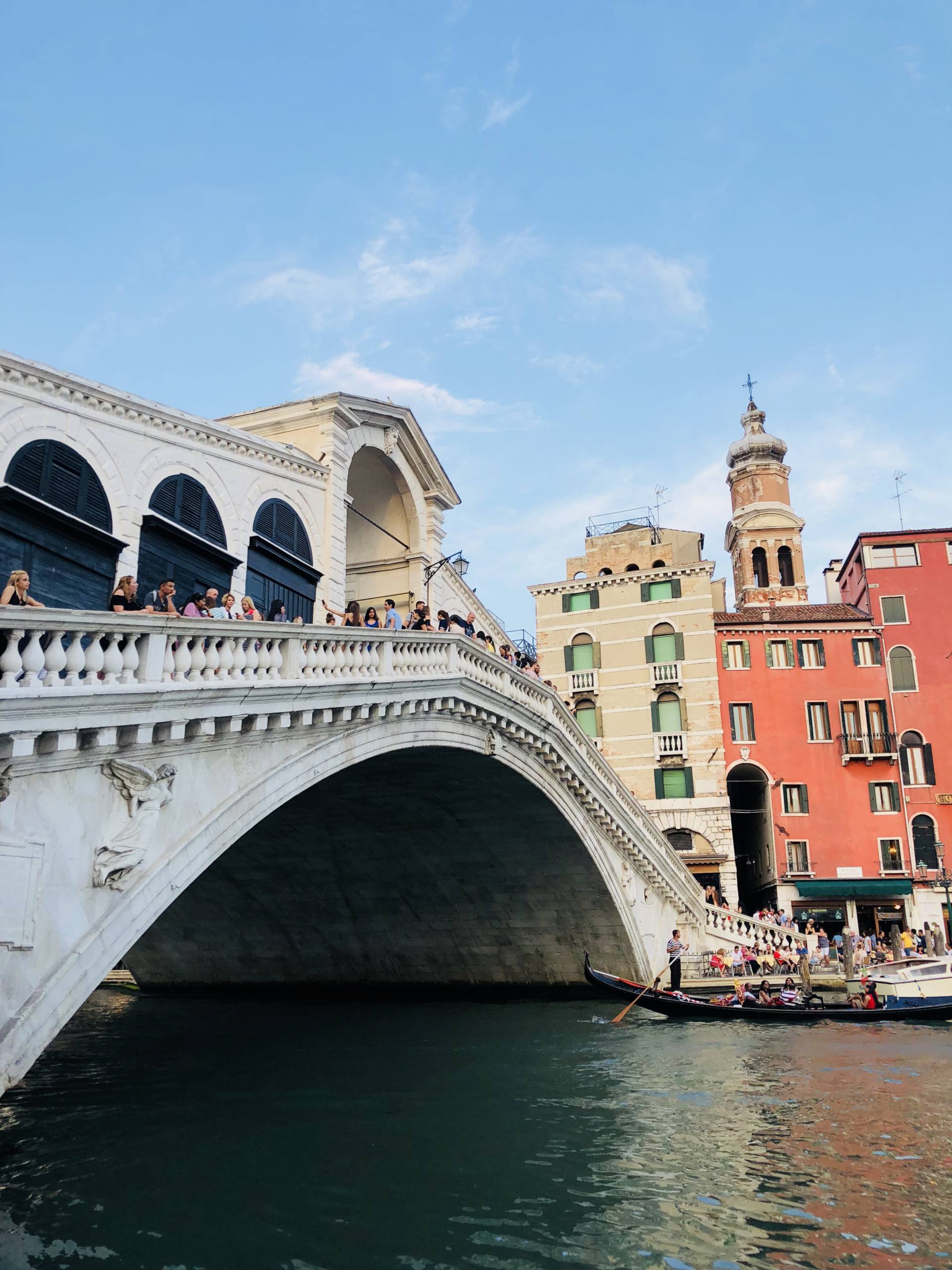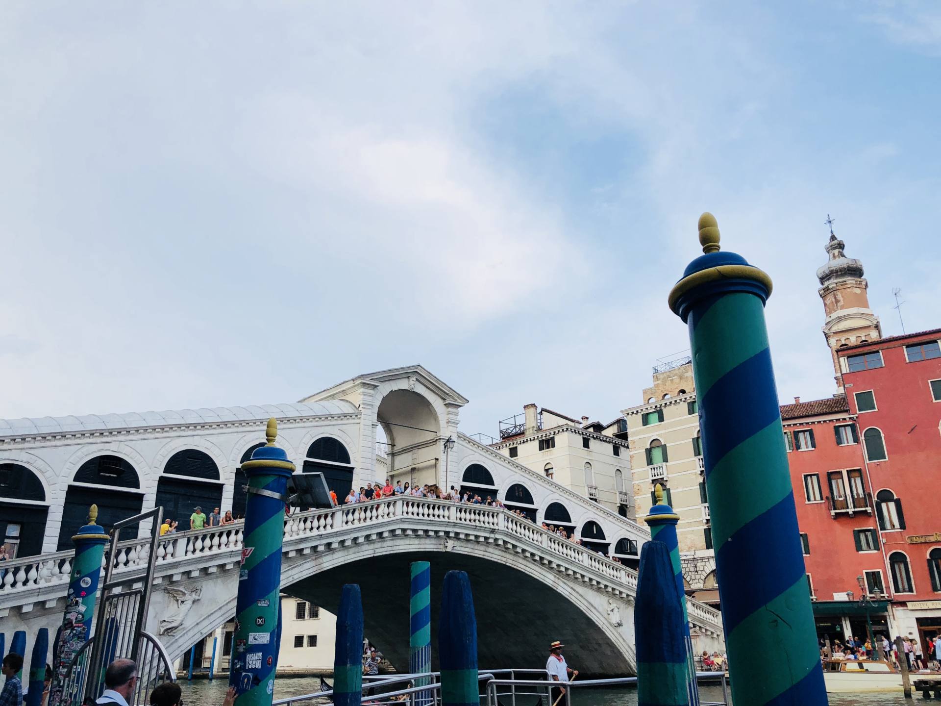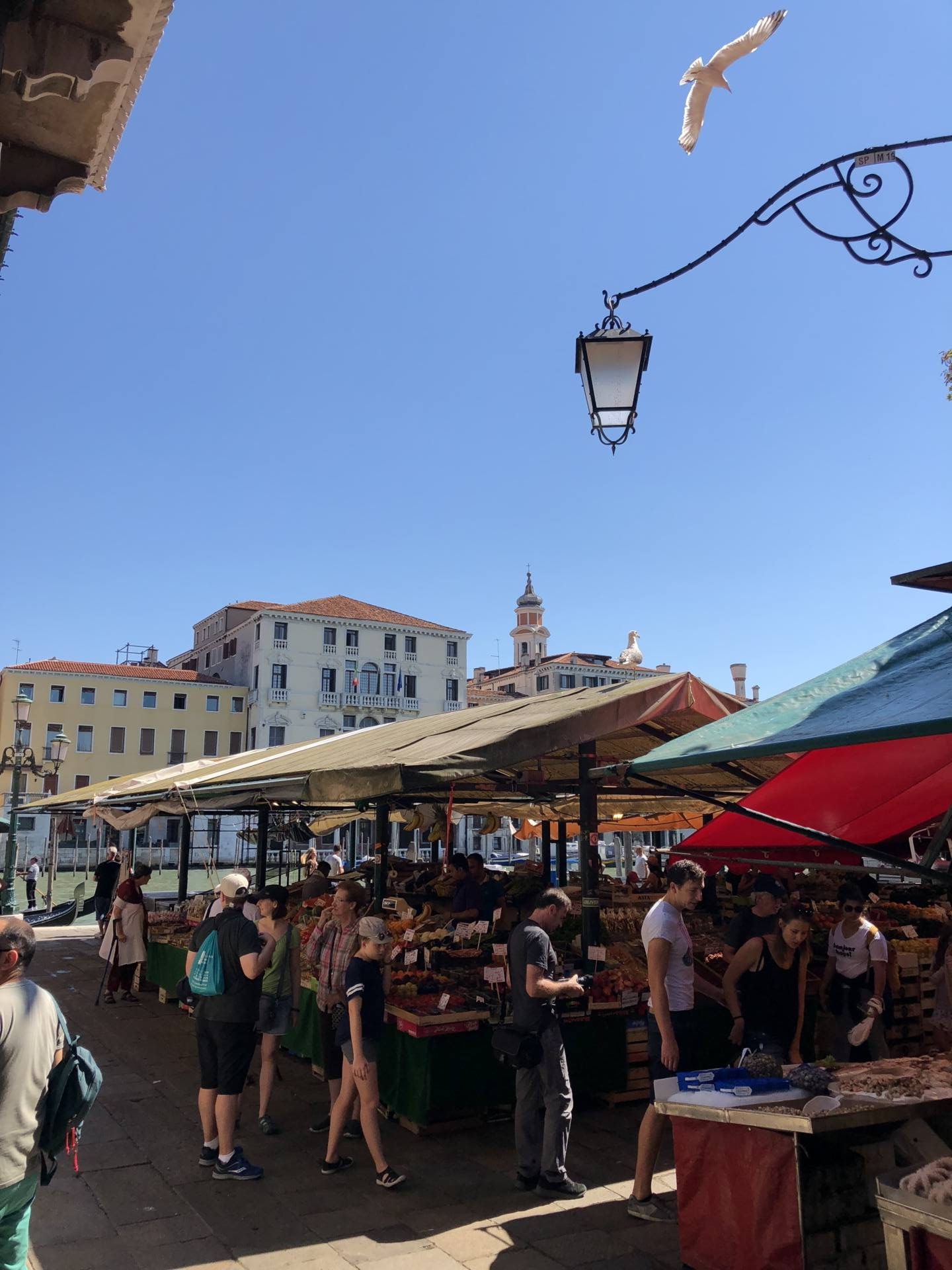En partant vers l’ouest, au travers des ruelles, vous tomberez sur le Canal Grande. C’est un canal très large où passe les vaporettos, c’est un peu le périphérique maritime de la ville où se côtoient vaporetto, speed-boats et gondoles ! Pour traverser et rentrer dans le quartier de San Polo, un seul passage, le somptueux Ponte Di Rialto ! Il est massif et magnifique, une merveille ! Beaucoup de marches à monter et à redescendre, mais cette vue sur le canal et les quais, c’est vraiment sublime ! Impossible de ne pas immortaliser cela. Juste derrière, il y la le Marché du Rialto tous les jours le matin (7h-13h). Traditionnel, sympa à voir mais c’est pas immense, on le traverse en 15 minutes à peine. Le quartier est hyper sympa, il y a beaucoup de bars et restaurants. Il y a aussi beaucoup de palais et d’églises, et des boutiques. D’ailleurs, c’est là que mon père m’avait recommandé une petite adresse pour l’apéro dont je vous ai parlé ici.
