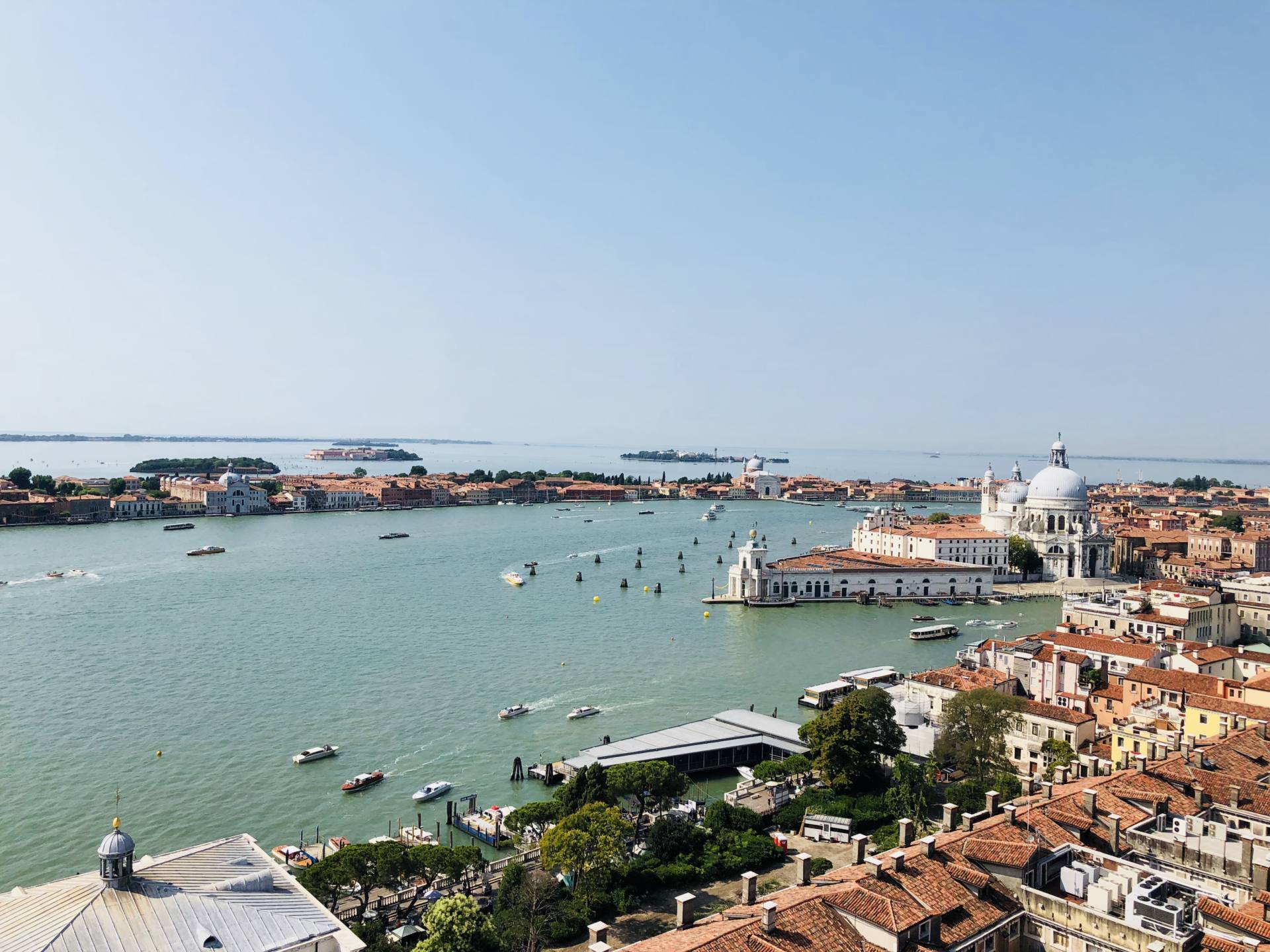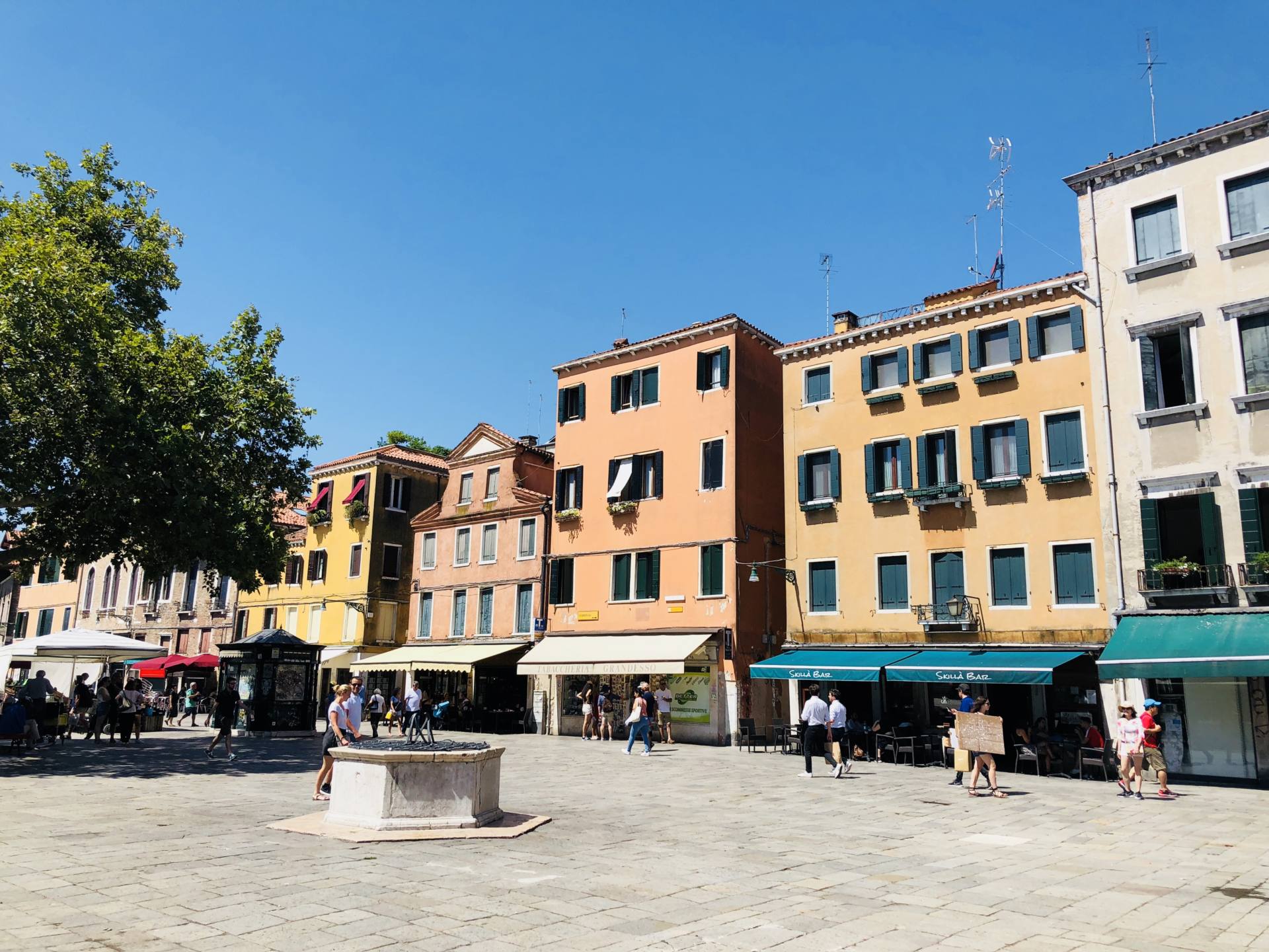 En s’éloignant un peu du Grand Canal, on entre un peu dans les ruelles. En descendant vers le sud, on entre progressivement dans le quartier de Dorsoduro. C’est un grand quartier car il va jusqu’à la pointe de la Douane, vers la Salute. On l’a fait en totalité. On est arrivé de San Polo, on est descendu en traversant le quartier. Il y a beaucoup de bars, de restaurants. On s’est d’ailleurs arrêté sur le Campo S Margherita. C’est une place prisée par les locaux pour un apéro. Effectivement, c’est plus calme, moins touristique et les prix sont plus bas. C’est là qu’on avait pris un apéro avec 2 verres et 2 toasts type sandwichs pour moins de 12-15€, je vous l’ai mis ici. On est descendu jusqu’aux quais Zattere, de très larges quais pavés. A partir de là, je vous conseille de remonter tout le quai jusqu’à la Pointe de la Douane. Vous allez voir, les vues sont superbes. Là, pour le coup, on a eu chaud ! Mais quelle bonne surprise quand on arrive à la Pointe, la vue est incroyable, on voit en face le quai de la Riva Degli Schiavoni, on aperçoit le Campanile de la Place Saint Marc et tout est beau, les couleurs, les bateaux, la lagunes, un superbe spot ! Du coup, vous pouvez revenir par l’autre côté en passante devant La Salute. Ensuite, il n’y a plus de quai, il faut rentrer dans les ruelles, passer devant des palais, jusqu’au Ponte D Accademia. Ce petit trajet n’a rien d’incroyable par contre !