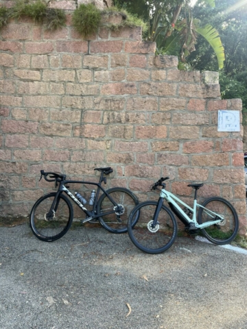 Steph a un vélo de route classique de marque Trek. Quant à moi, j’ai un vélo à assistance électrique (sinon ce serait impossible de le suivre !) de chez Moustache, le modèle Dimanche 28.3. Je l’ai depuis 3 ans, il me convient parfaitement et la qualité est vraiment incroyable. Je précise bien « assistance électrique » car avec le rythme de Steph, je peux vous dire que mes cuisses ont travaillé ! N’imaginez pas qu’il ne faut rien faire pour en profiter.