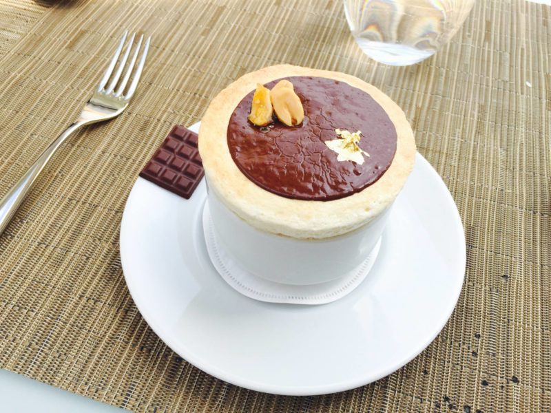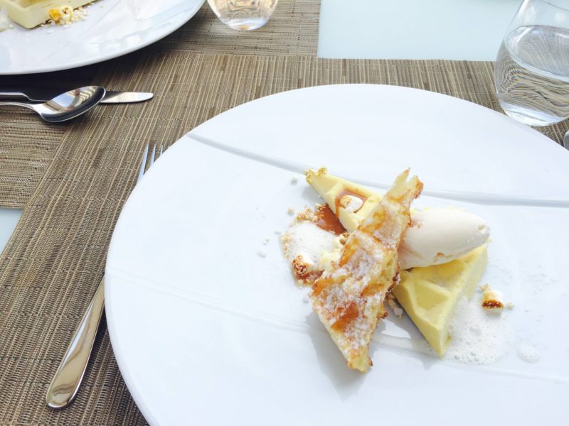 Bref, après tout ça, on est évidemment passé au lunch ! J’ai pu goûter plusieurs entrées puisque j’ai partagé tout cela avec Floriane qui m’invitait. J’ai eu un gros coup de cœur pour l’entrée à base de betterave à laquelle je n’ai pas pu résister. Les petits samoussas à la sardine et la brunoise de légumes méditerranéens étaient vraiment bons aussi ceci dit ! D’ailleurs, j’étais surprise car il y avait pas mal de saveurs que je n’aime pas trop habituellement et que j’ai adorées. D’ailleurs, mention spéciale pour la burrata qui m’a fait aimer la mozzarella. En fait, je crois que je n’en avais jamais mangé une vraie, une bonne ! Avec du vinaigre balsamique, c’était un délice ! Côté plat, j’ai dégusté un filet de loup avec une purée de pois que j’adorerais savoir refaire chez moi, et une pièce d’agneau. Je ne suis pas très viande rouge mais c’était néanmoins très bon car la viande était bien tendre et pas trop forte. Allez, vous avez assez lu, je peux vous parler dessert maintenant ! C’est le pâtissier en personne qui est venu me parler de la carte des desserts qu’il a élaborée. J’en ai goûté deux et je m’en souviens encore ! Le premier : un snickers revisité avec notamment une mousse indescriptible ! Et le deuxième : un entremet gaufre avec des chamallows et plein de saveurs dingues.