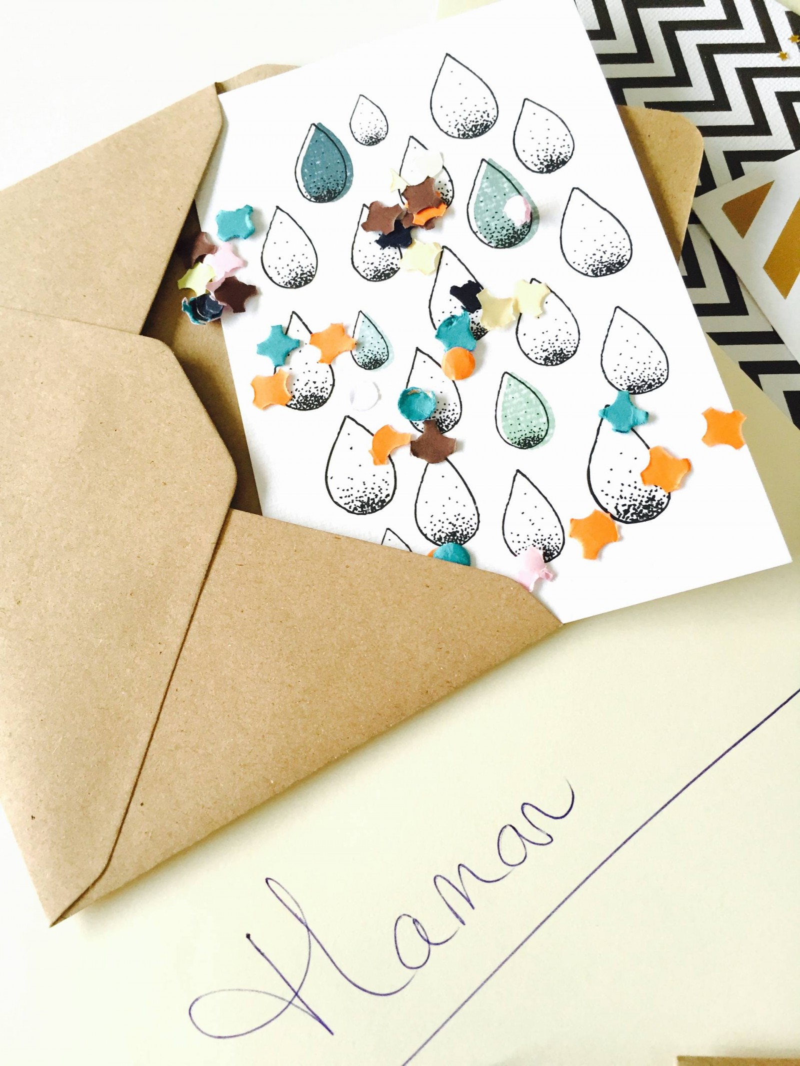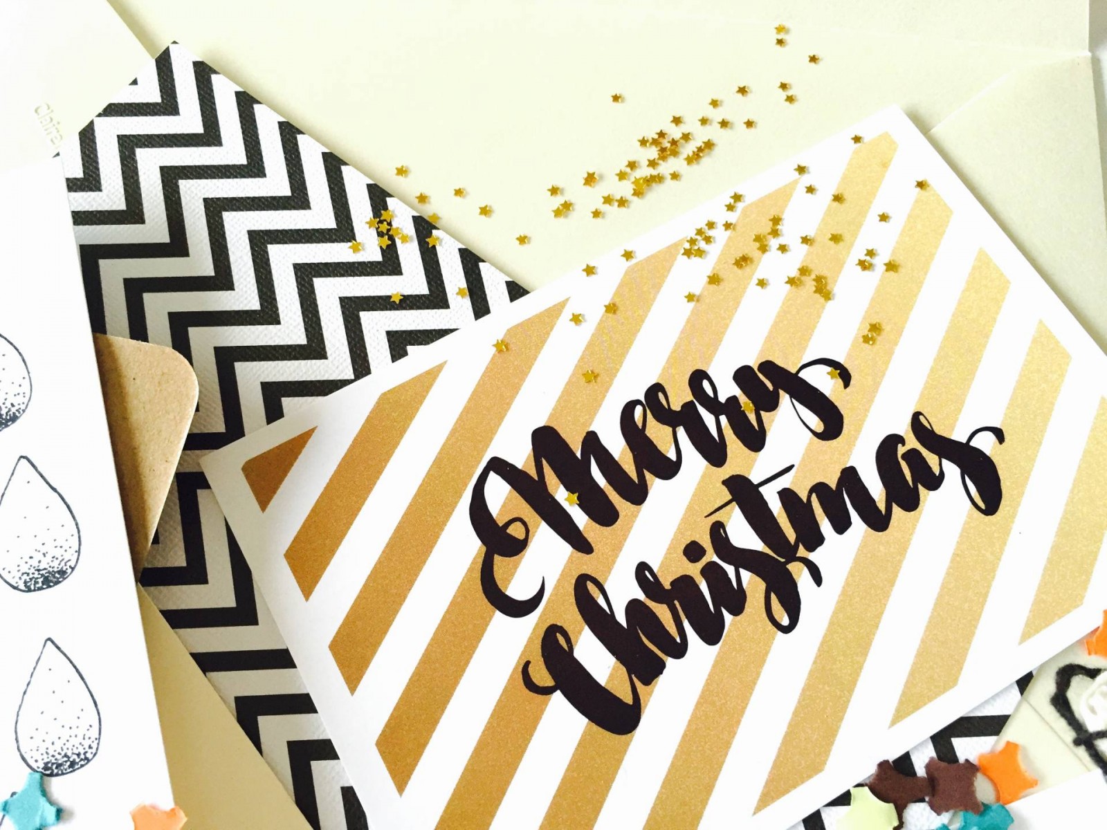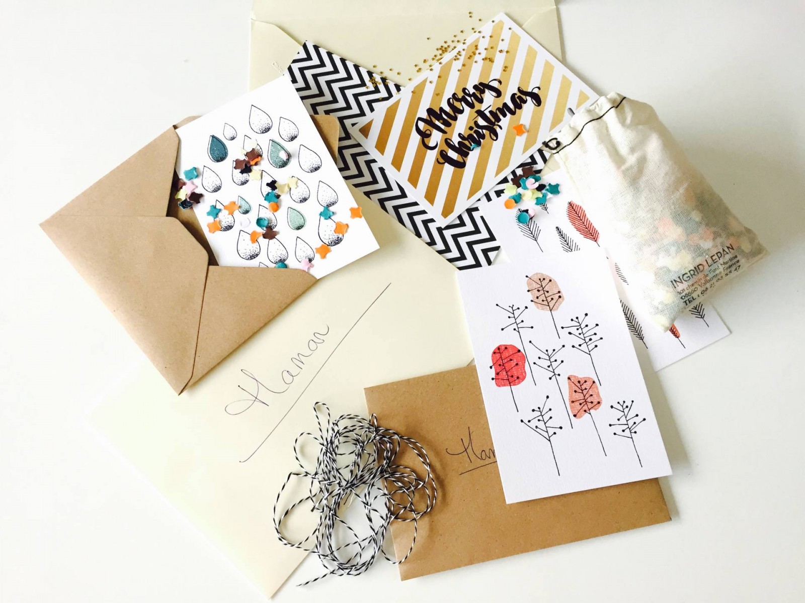 Comme vous voyez, je n’ai rien acheté, c’est que de la récupération et des éléments reçus dans des boxs. Du coup, j’ai utilisés les cartes et les enveloppes de façon traditionnelle. Avec les cartes Crème de Papier, j’ai utilisé les enveloppes kraft et je les ai remplies de confettis. Et avec les cartes Hello Salt Paper, j’ai utilisé des enveloppes blanches ou kraft, puis j’ai personnalisé les enveloppes en collant des paillettes. Un peu de cordon autour pour certaines, et voilà ! En tous cas, ça faisait un petit effet en plus ! J’espère que ça vous aura donné des idées pour vos cartes de Noël ou cartes de voeux !