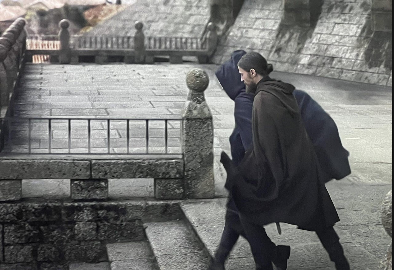 Une fois entrés par l’arche majestueuse, on arrive rapidement devant une immense église et un palais. Autrefois bombardée pendant la Guerre Civile d’Espagne, les bâtiments ont gardé quelques traces d’éclats d’obus. Aujourd’hui, c’est une place paisible, lumineuse et apaisante. A proximité, l’Église Xavier est emblématique avec ses deux tours blanches. Je vous mets un comparatif entre mes photos de différents lieux à gauche, et des photos prises sur le tournage ou captures d’écran de la série, à droite.