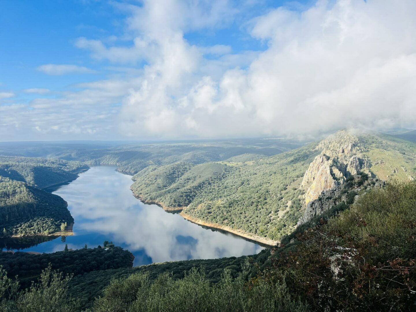 Plus au nord, mais en se rapprochant tout de même de Madrid, nous avons passé une demi-journée dans le Parc National de Monfragüe. C’est un lieu unique en Estrémadure, des monts méditerranéens datant du Néolithique où l’on retrouve une alternance d’immense forêts, de pics rocheux, et le fleuve Tage qui passe dans une gorge étroite. C’est un lieu évidemment paisible ou la faune est principalement constituée de vautours. C’est un des rares endroits en Europe où l’on peut en voir, installés sur les parois rocheuses ou en train de nous survoler. C’est vraiment grand et majestueux, environ 2,80m d’envergure une fois déployé. On peut accéder au Castillo pour avoir une vue panoramique puis il y a différents belvédères pour profiter de belles vues, comme le Belvédère Portilla Del Tietar ou le Belvédère du Salto Del Gitano.