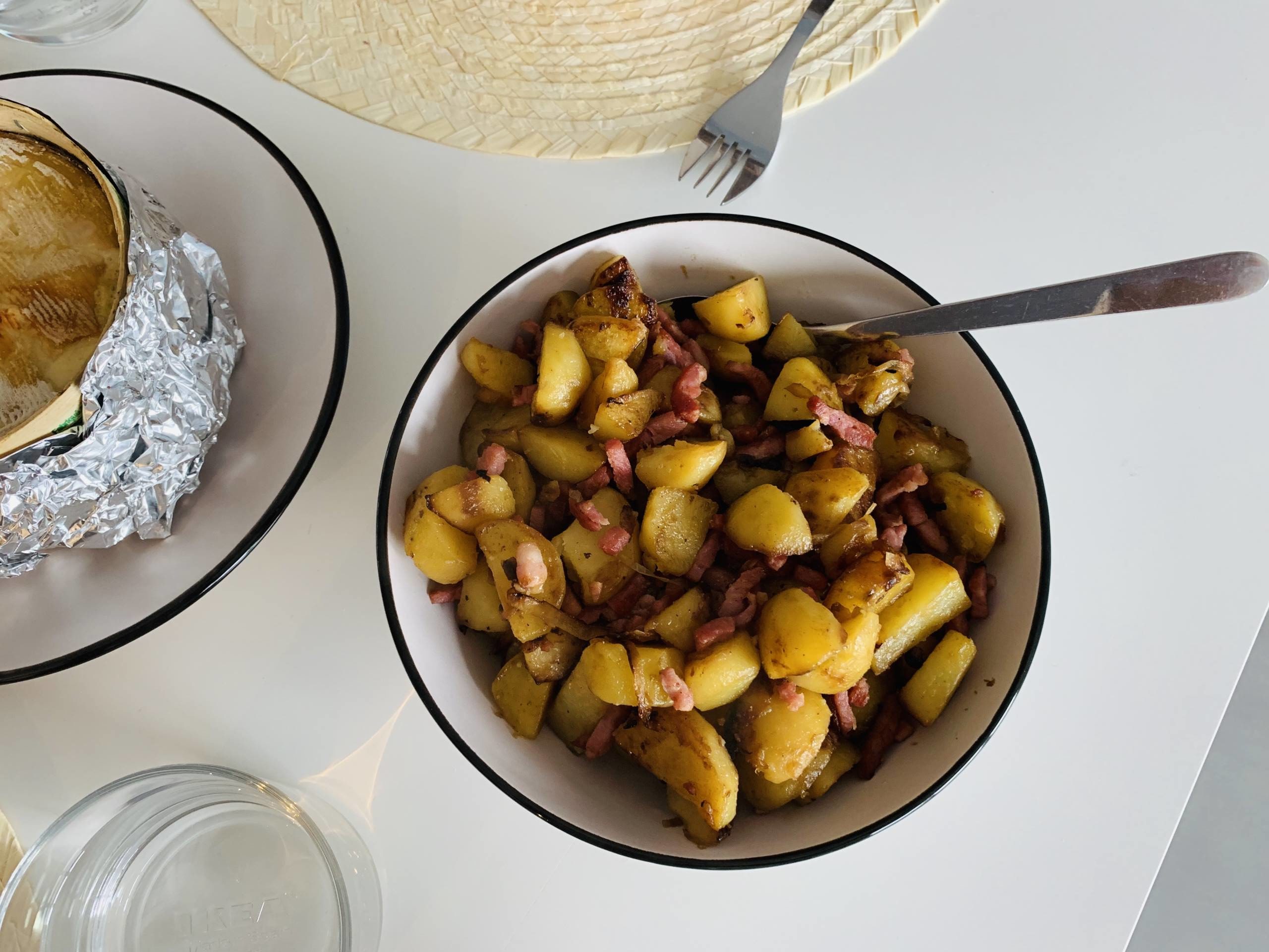 - Quelques minutes avant la fin de cuisson des pommes de terre, ajouter les lardons