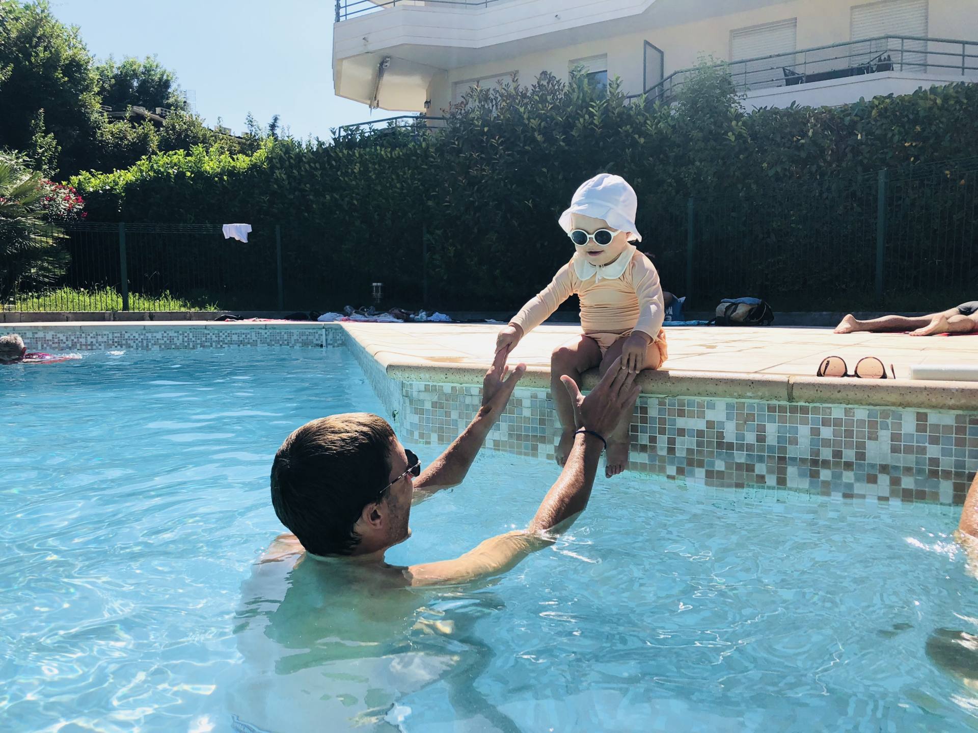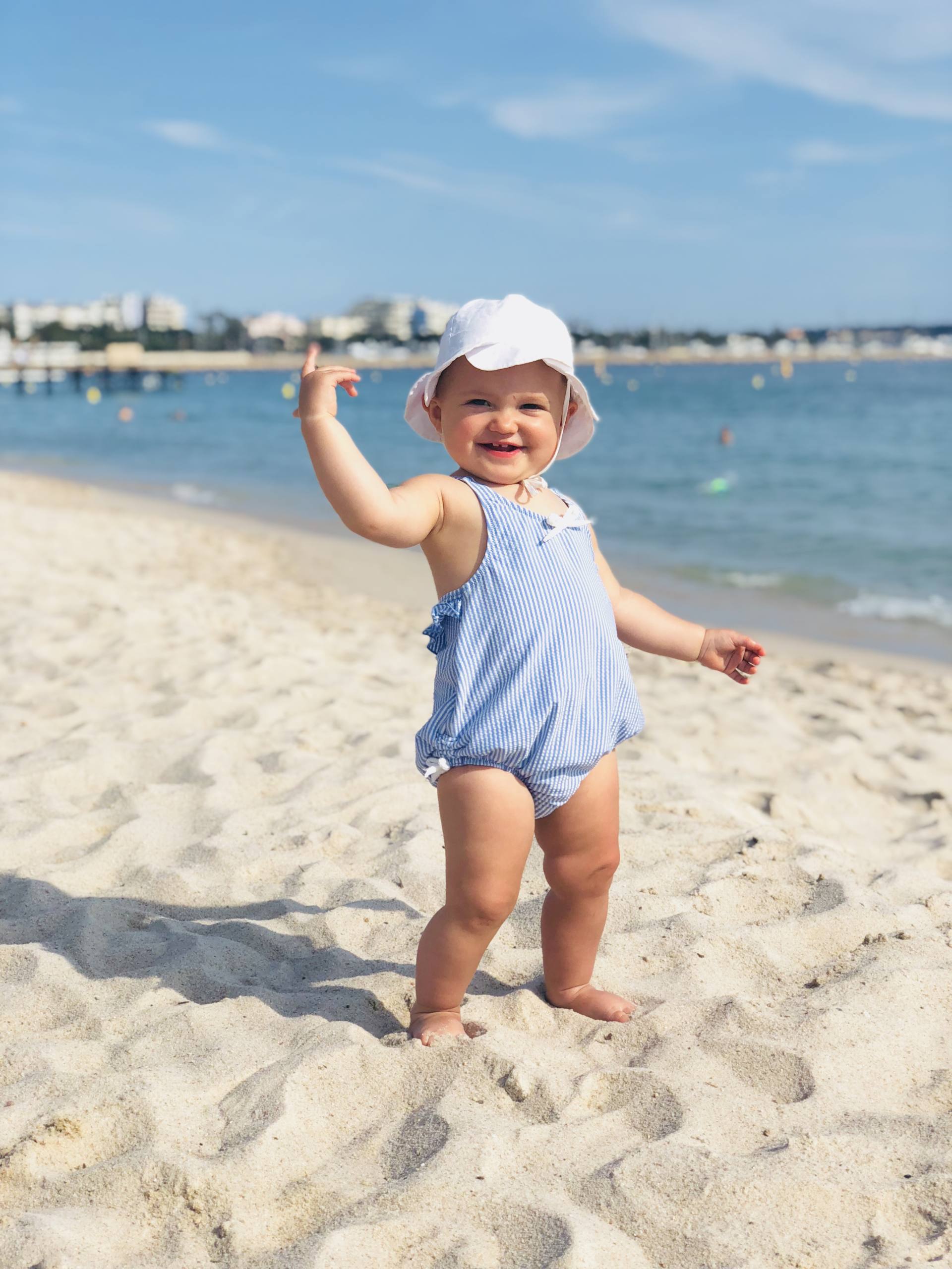 Le soleil, c’est un peu l’ennemi des bébés ! Leurs yeux, leur peau, tout est fragile ! Alors on a bien sûr plusieurs chapeaux pour varier un peu mais le fait est qu’elle en a toujours un sur la tête pour l’habituer à avoir quelque chose, ça évite qu’elle cherche tout le temps à l’enlever. On en a un à festons de chez Jacadi, un autre plutôt bob de bébé que j’aime beaucoup de Chez Vert Baudet (en soldes à 5€ !), et en backup, j’en laisse toujours un dans le sac. Je l’ai pris chez H&M pour quelques euros et il est très mignon ! D’ailleurs, je l’ai pris en double, un dans le sac à langer et un à la crèche. Côté lunettes, depuis l’an dernier, j’adore les Izipizi ! On les a en mint, en rose pêche et en blanc. Je ne suis pas à l’abri de prendre une nouvelle couleur d’ailleurs ! Côré crème solaire, j’ai repris celle de l’an dernier de chez Avène car le petit format est très pratique mais dès qu’elle est finie, je changerai pour Alphanova Bébé qui est plus clean.