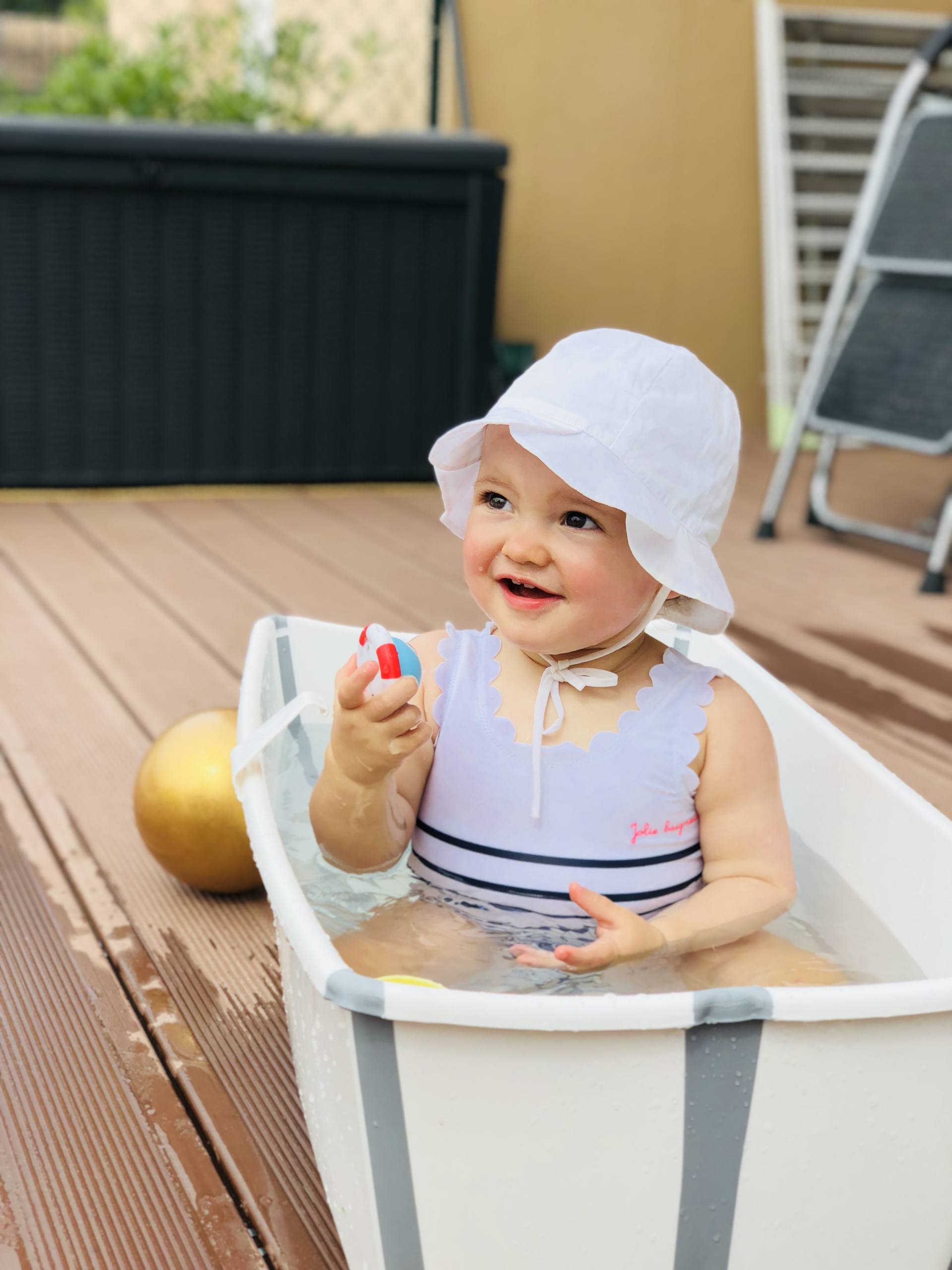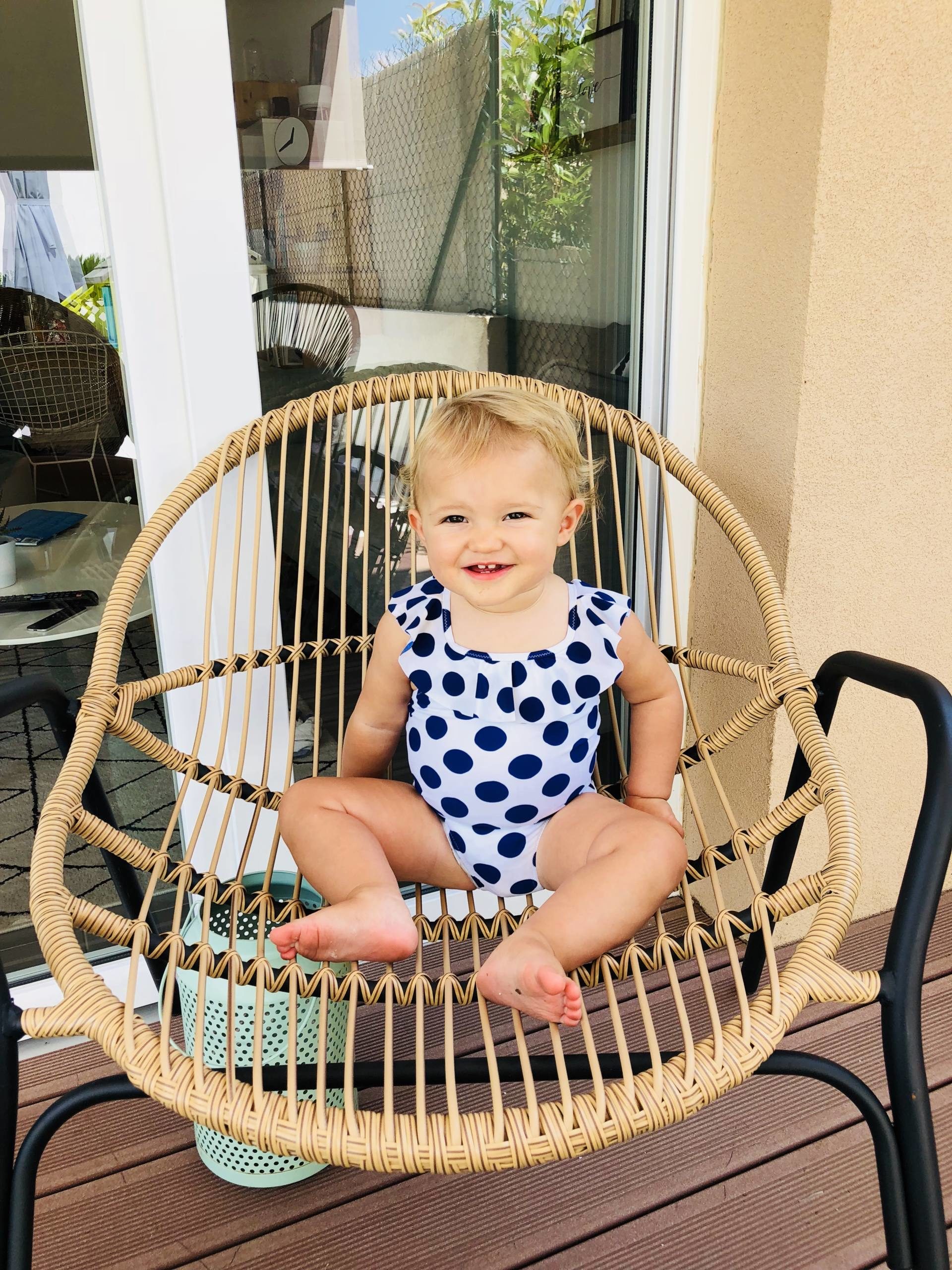 Pour aller dans l’eau, je pensais que cette année, il faudrait des brassards. J’ai eu du mal à en trouver pour les bébés de 1-3 ans. Il y en a beaucoup, mais à partir de 3 ans ! Je me suis dit que c’est peut-être parce que ce n’est pas la solution la plus idéale. Du coup, on a tenté d’utiliser la bouée mais tout comme l’an dernier, aucun succès, elle ne veut pas aller dedans, elle veut être vraiment dans l’eau, donc dans nos bras ! J’aurais aimé trouver un joli maillot avec des bouées aussi mais je n’ai vu que ceux d’Archimède, mais le prix m’a refroidie, d’autant plus que je n’étais pas fan du style !