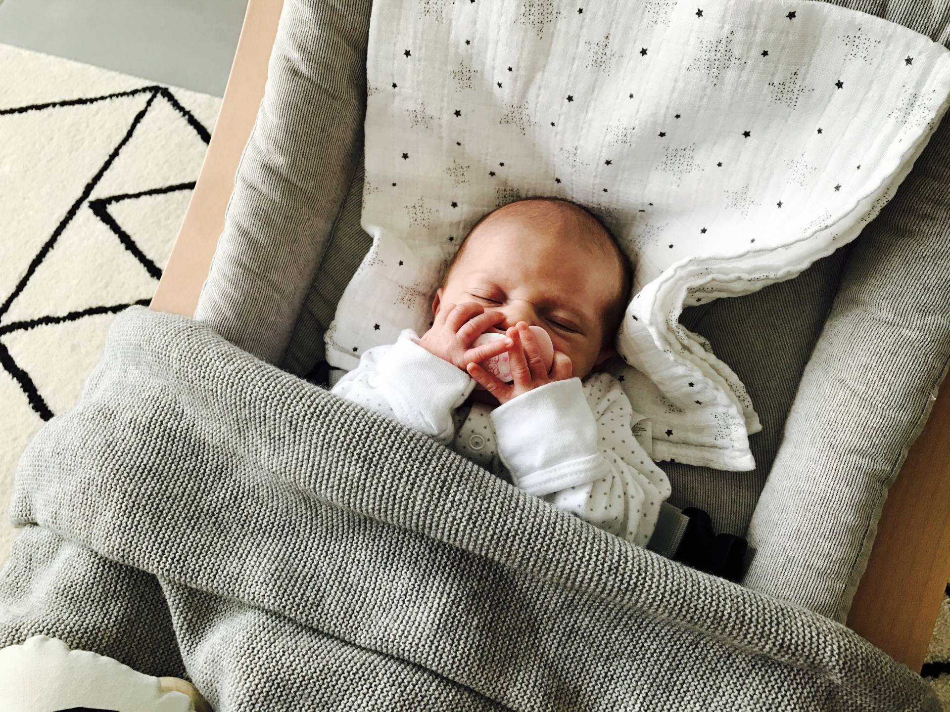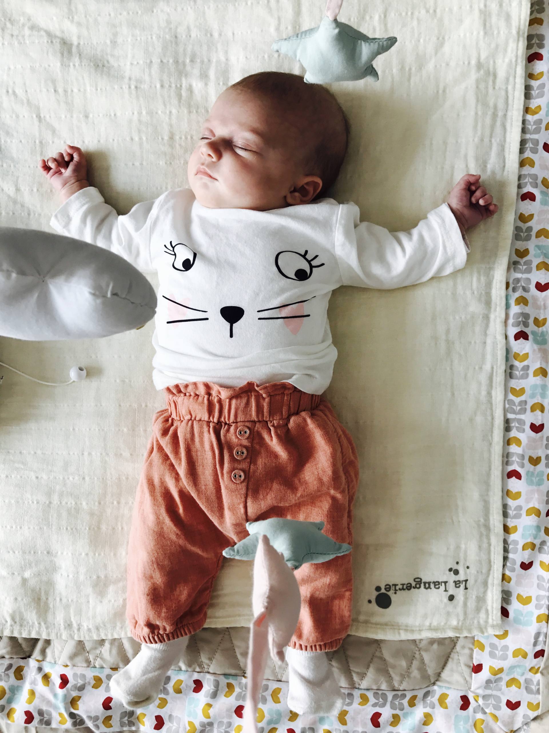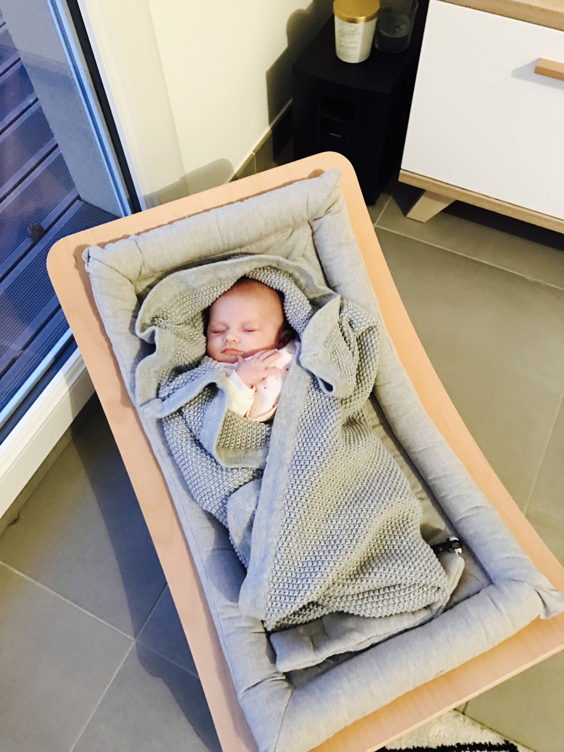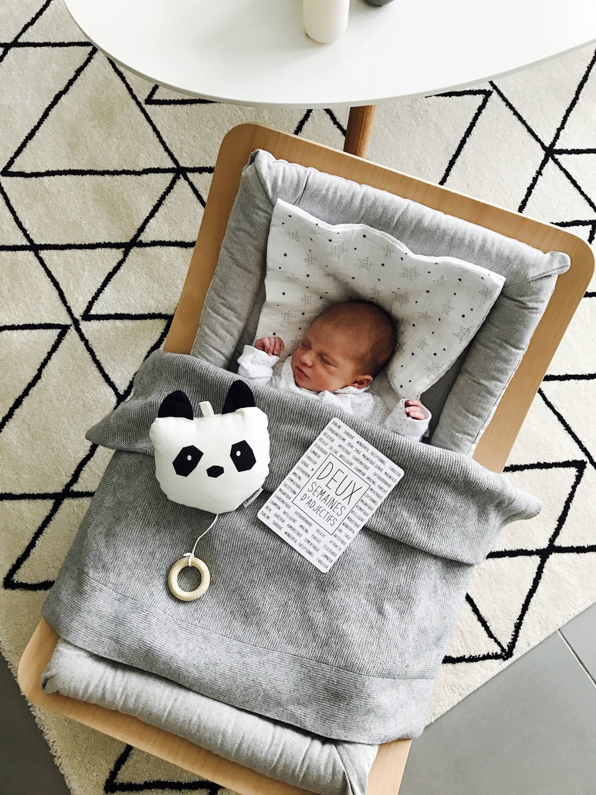 J’ai passé beaucoup de temps à chercher des objets de puériculture à la fois beaux, utiles et intéressants pour bébé. Au tout début, Louise n’avait pas besoin de grand-chose vu qu’elle passait la journée à manger, dormir, et être dans mes bras. J’ai essayé de varier les lieux pour la faire dormir : nacelle, canapé, transat, lit. Je n’étais pas très à l’aise de la savoir dans son lit à l’étage donc elle était plus souvent en bas. La nacelle est celle qu’on avait sur la poussette Stokke. Je la mettais dans la chancelière sans la couvrir. Elle était suffisamment au chaud, bien entourée sur les côtés, tout pour qu’elle se sente en sécurité. Et elle dormait en général très bien. Si c’était à refaire, j’aurais acheté un couffin (comme celui-ci), je pense que ça lui serait parfaitement convenu car elle a toujours aimé être entourée.